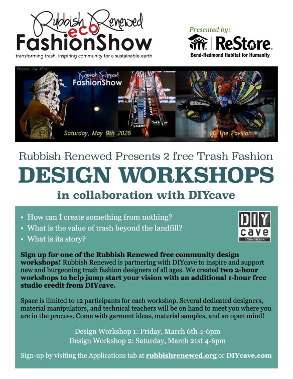 The 2026 Rubbish Renewed Eco Fashion Show will be at the Pavilion on Saturday, May 9th 2026. The garment submission deadline is Friday, April 10th.