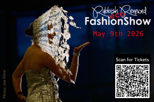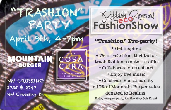 MAY 1st, FRIDAY – FIRST FRIDAY ART WALK DOWNTOWN: Donning trash fashion, Rubbish Renewed will be out enjoying the evening on the town and sharing information about the upcoming Rubbish Renewed Eco Fashion Show!