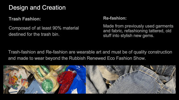The 2025 Rubbish Renewed Eco Fashion Show will be at the Pavilion on Saturday, May 10th 2025. The garment submission deadline is Friday, April 4th.
