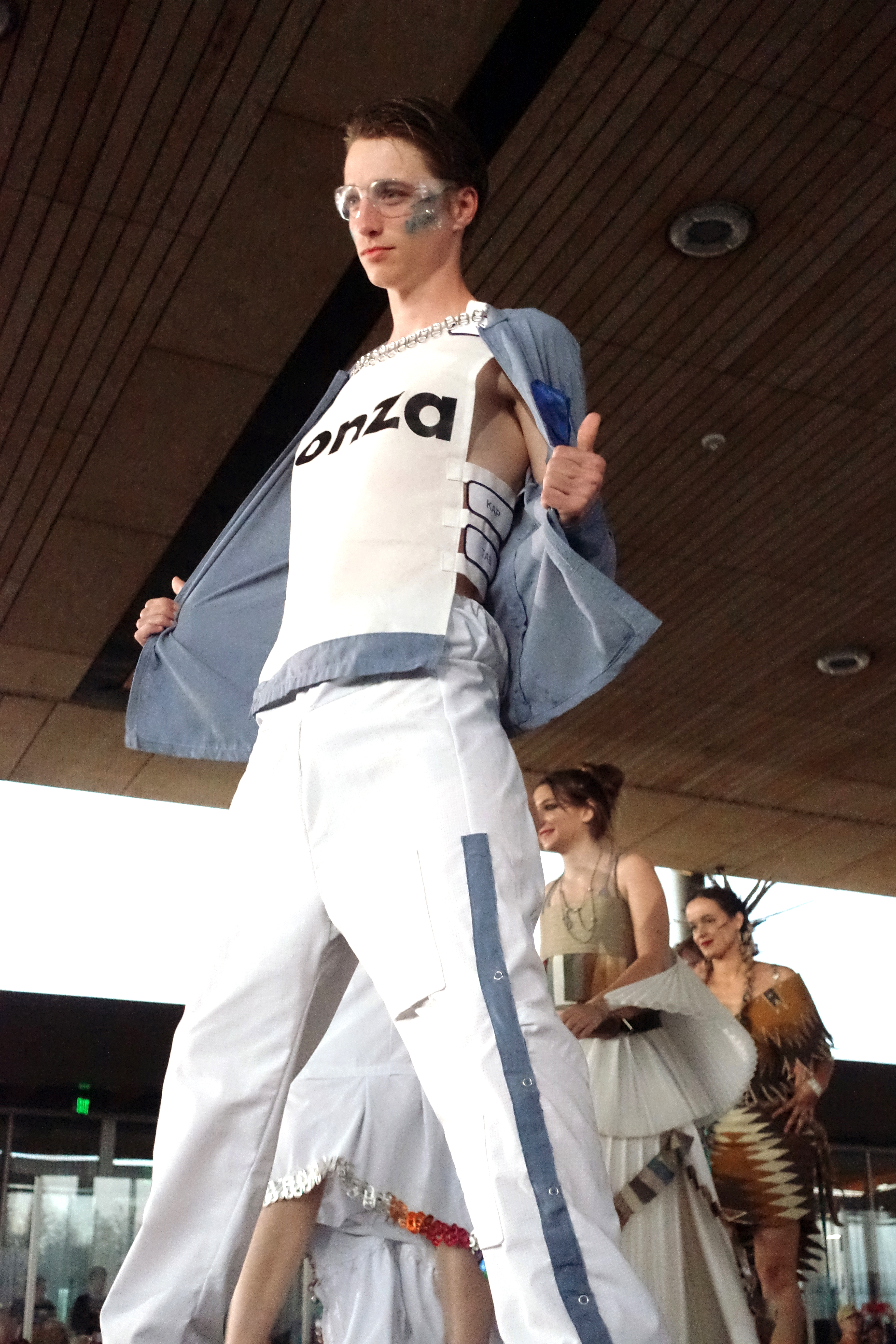 Year 3: On the runway were 19 student designers up from 9 the year before! 2 of the Business Challenge entries were made by 2 of our talented students. And bags dominated the material cache: plastic and canvas grocery bags, dog food, ramen, paella, and coffee bags.