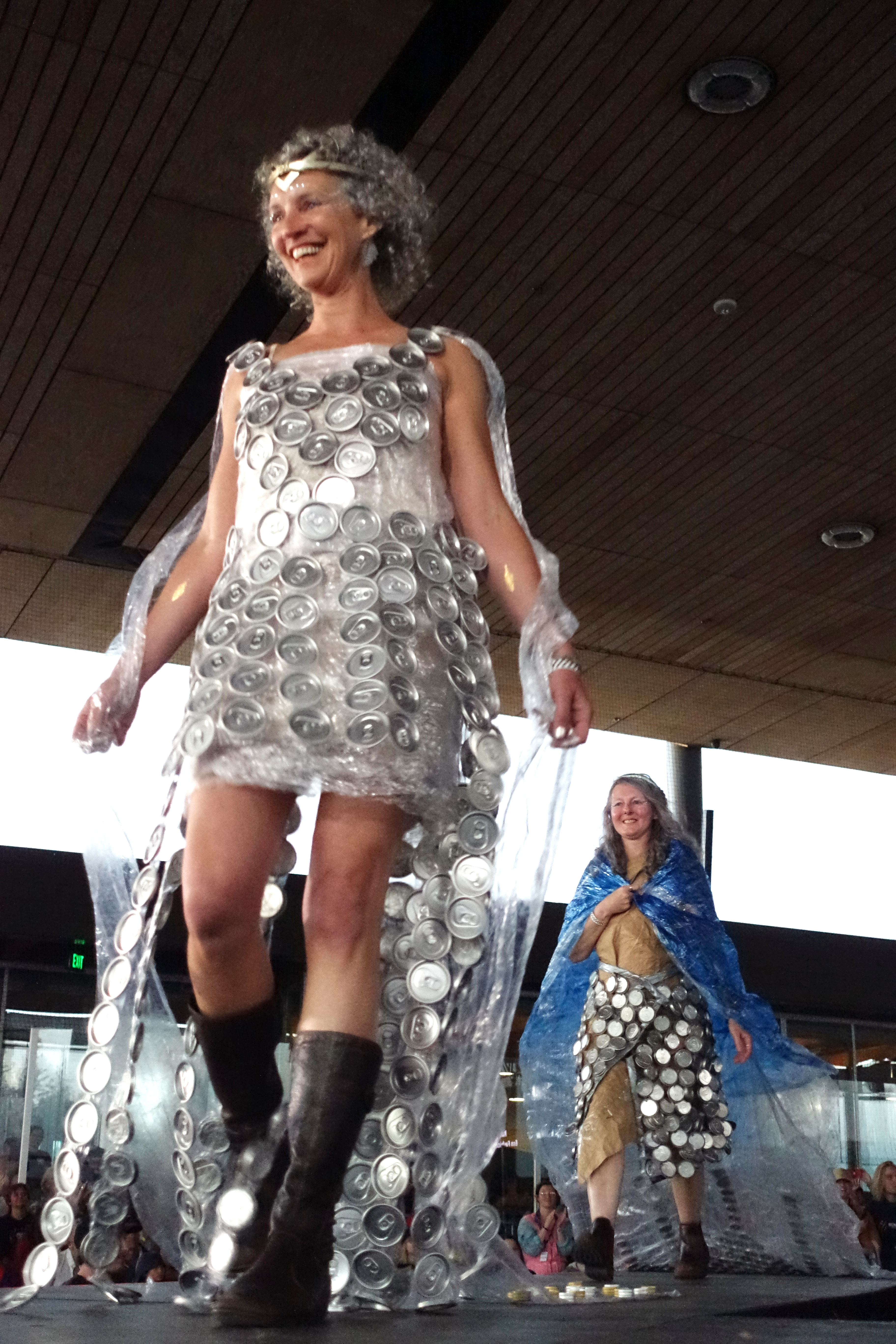 Year 2: our first Business Challenge garments battled it out on the runway from ReStore, Wabi Sabi, Cuppa Yo, The Horned Hand, Utilitu Sew and the Environmental Center. Cuppa Yo won the 1st coveted trash trophy designed by, now 4 time winning designer, Panambi Elliott! Skillfully manipulated materials from bicycle tubes and slides, to a kiddy pool and Capri Sun containers raised the runway bar. And we added a 2nd show!