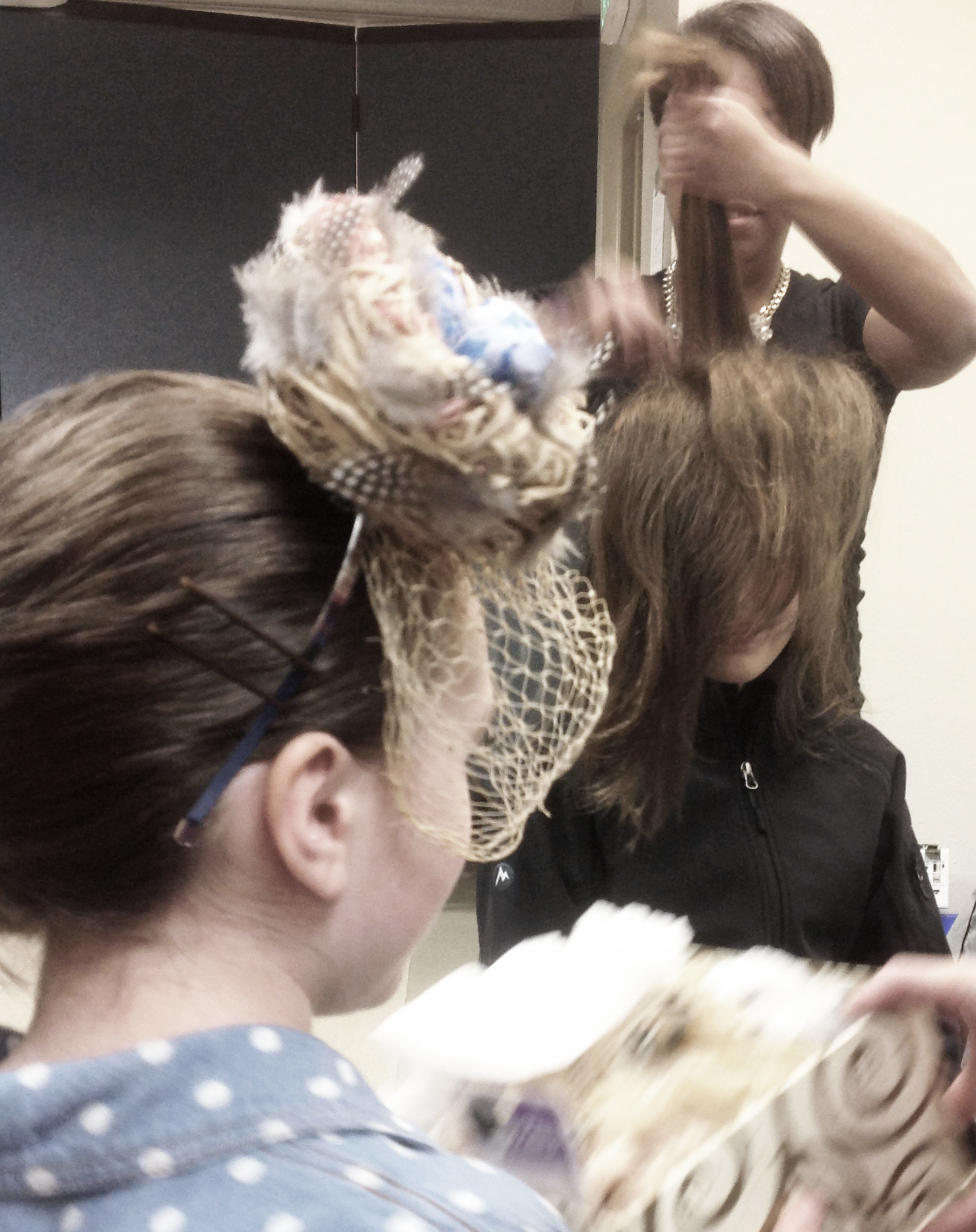 What happens behind the scenes is essential to a professional looking show. When Rubbish Renewed began, we knew that good styling was the “frame” that highlighted the art on the runway. This meant, if we wanted our event to be taken seriously, we needed to create some fantastic “frames.” Luckily, Allison Murphy jumped in early with a stylist’s eye. She shaped the vision and we all scrambled to find a smattering of talented, volunteer hair and makeup specialists to fashion them. Now, 9 years later, we have a team of professionals with Bishops and Bombshell Lashes creating the backdrop for each unique piece!