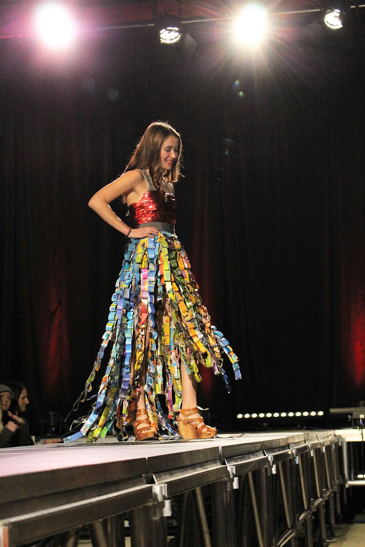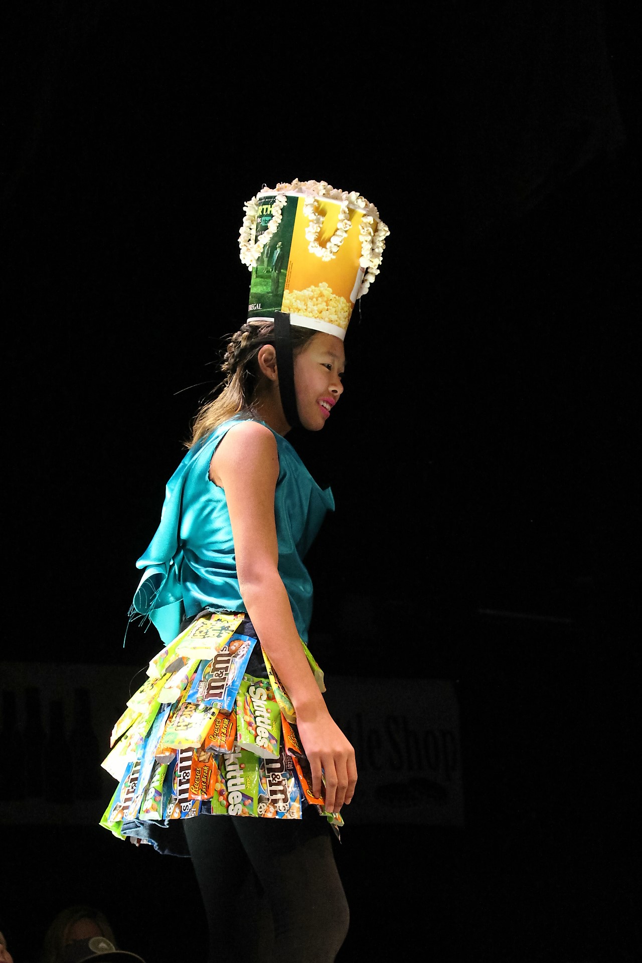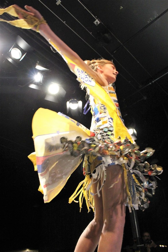 Materials: Bottle caps, used paper, pet food bags, feathers, old elastic, corks, wood, old pants, lanyard plastic lacing, thread, and old hairband.