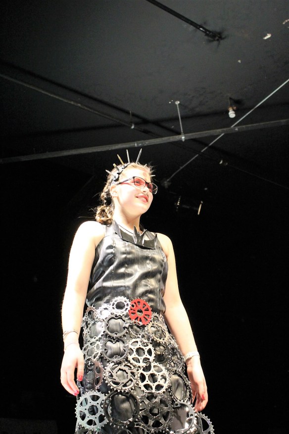 Materials: bike inner tubes, gears, bike helmet visor, bike chains