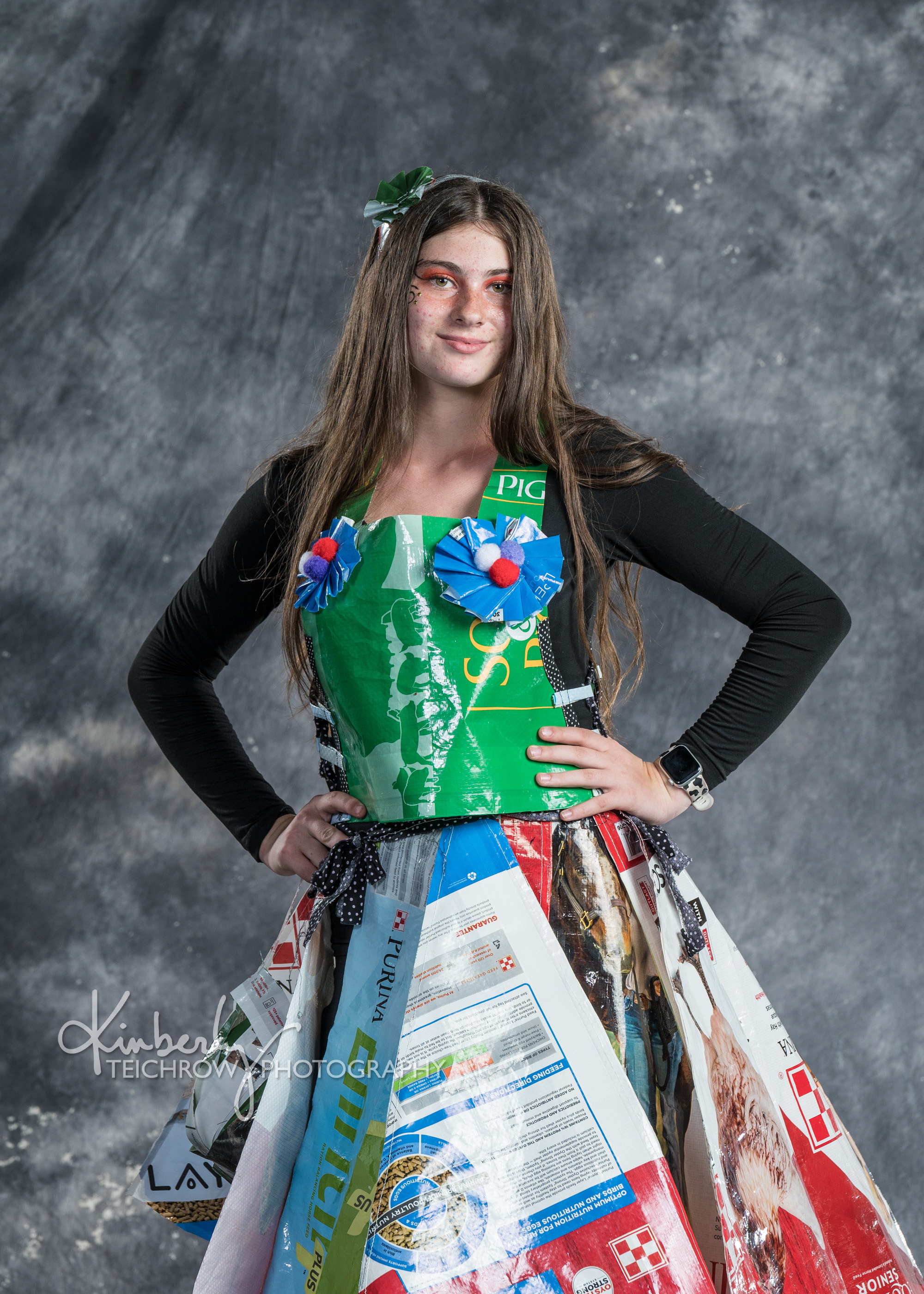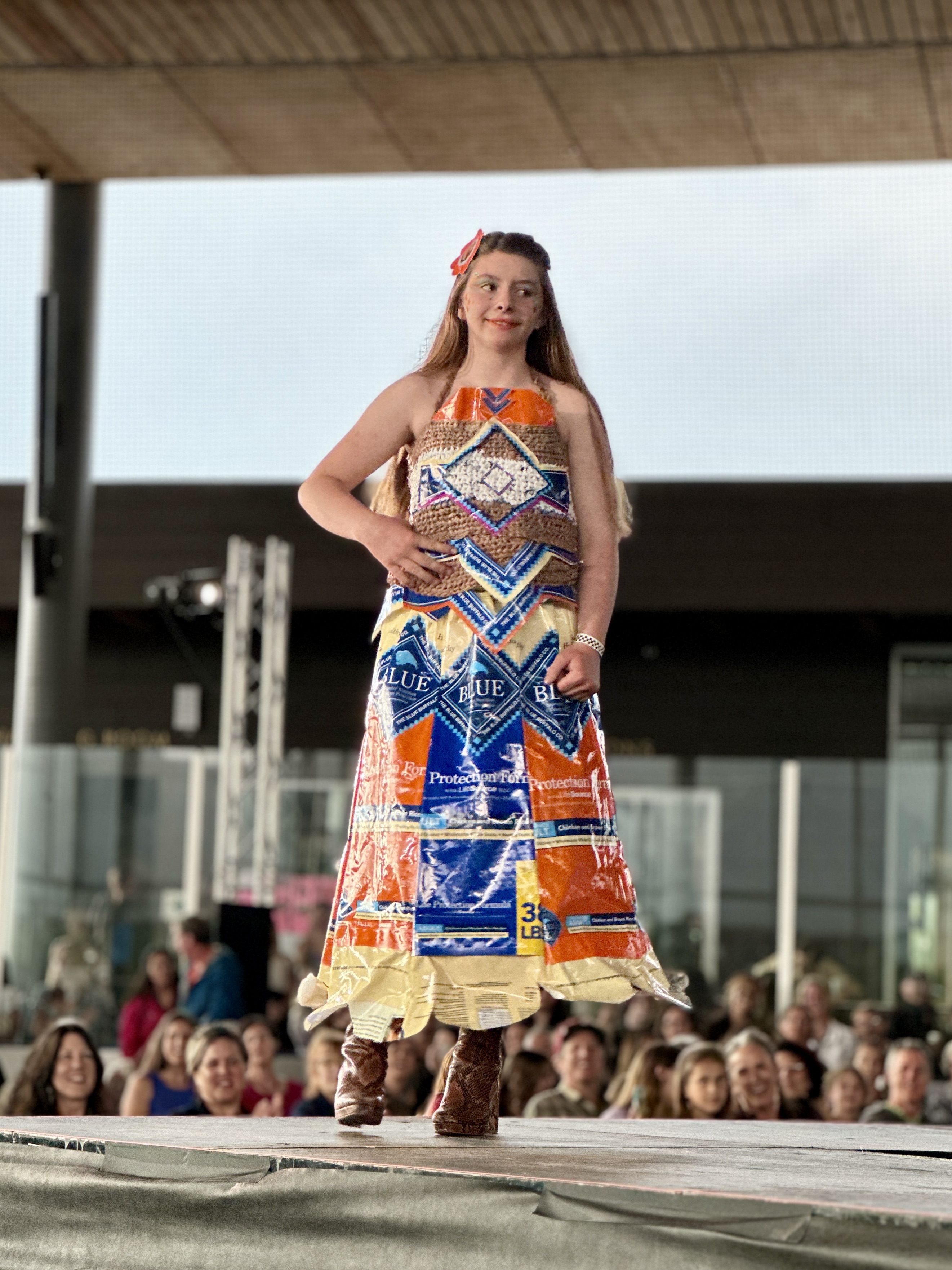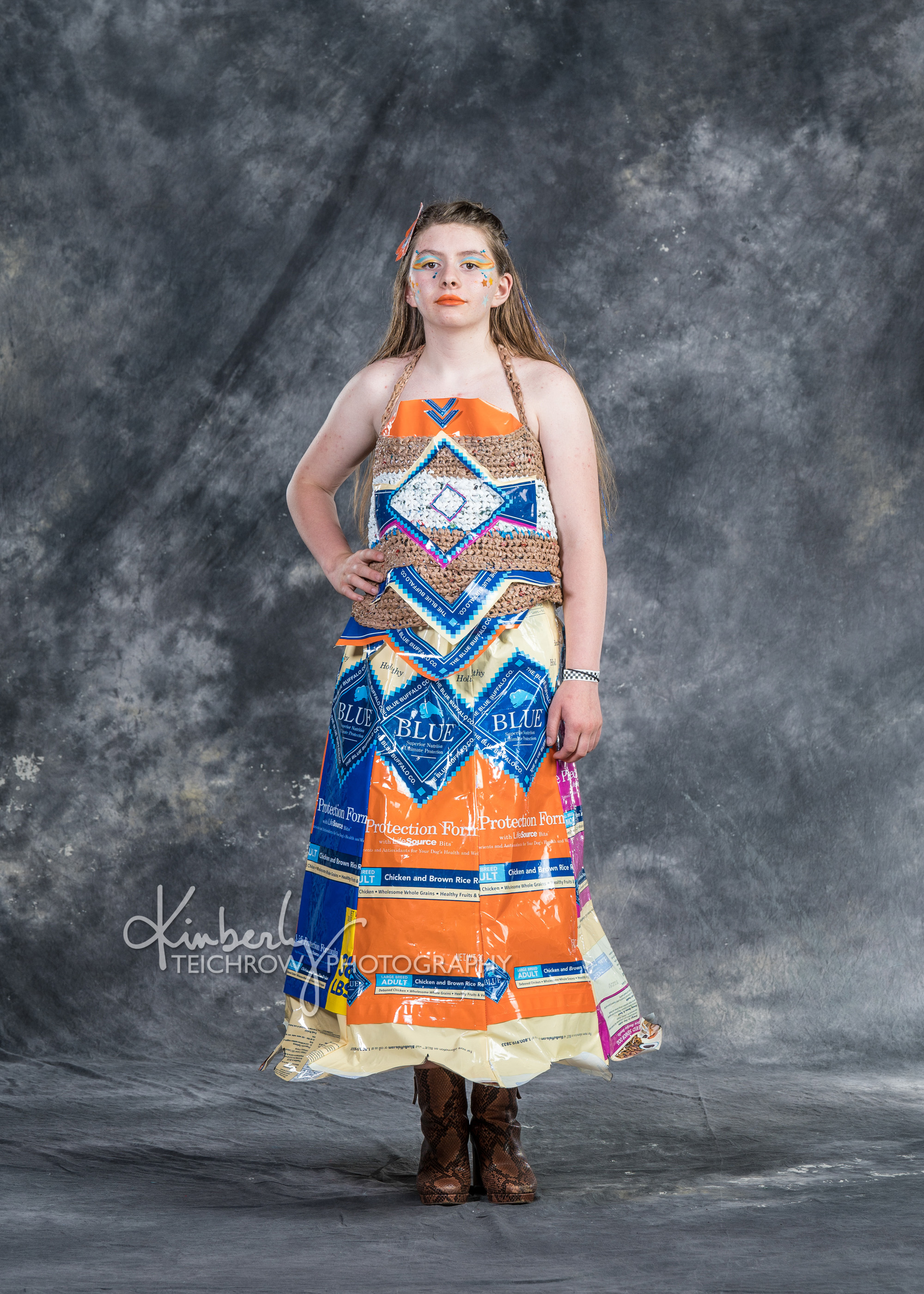 Designer/Model: Alexis Johnston Materials: Farm animal feed bags, leftover ribbon, thread, and Pom poms – Pilot Butte Middle School