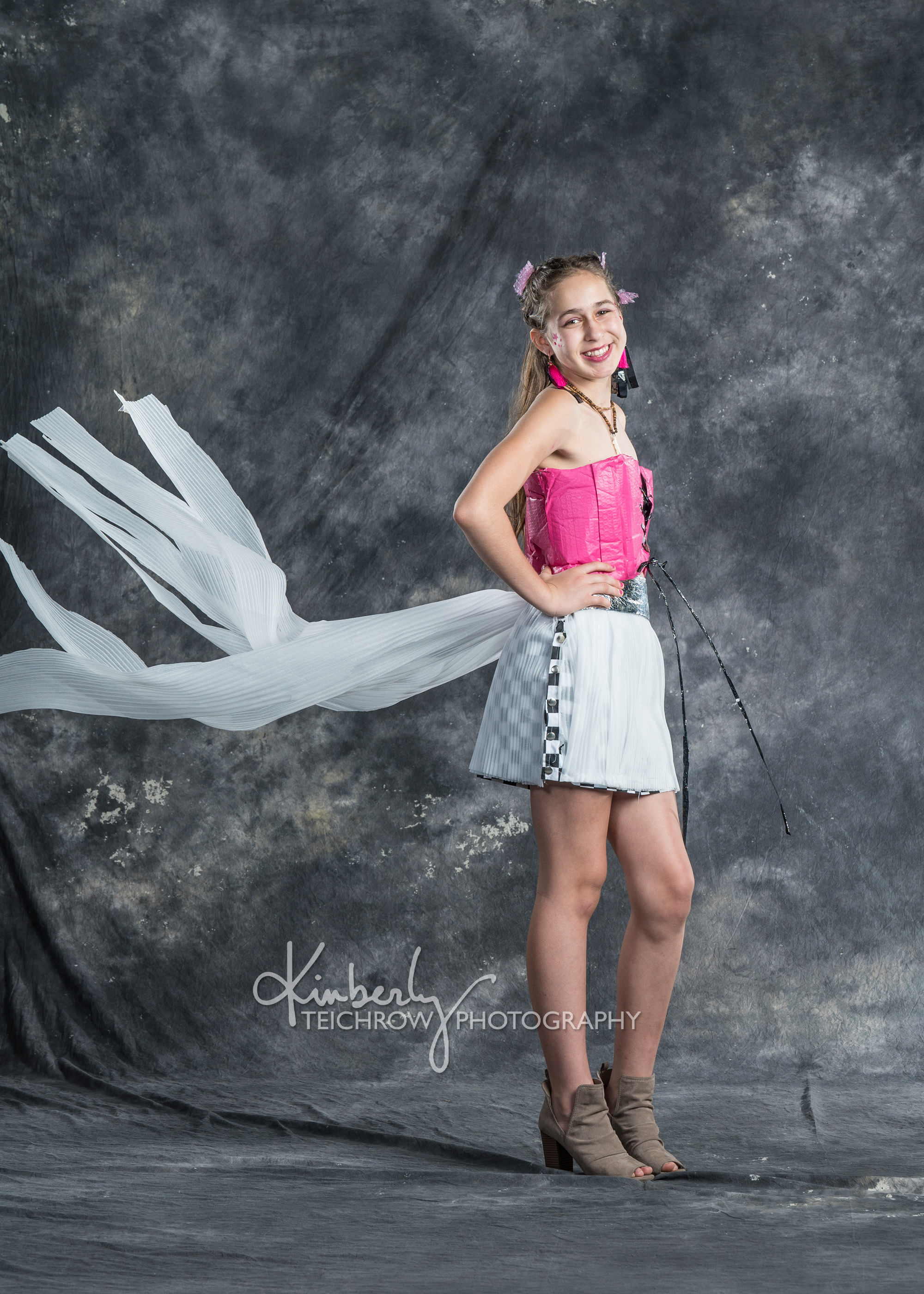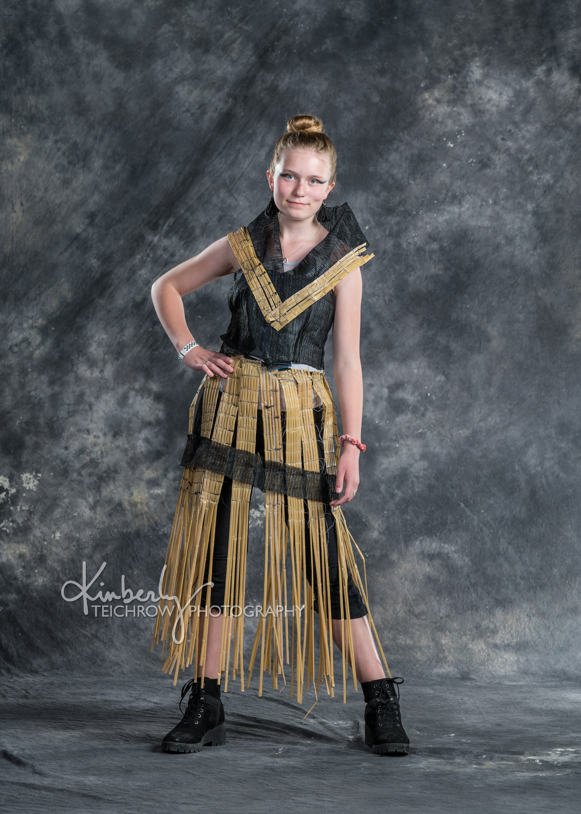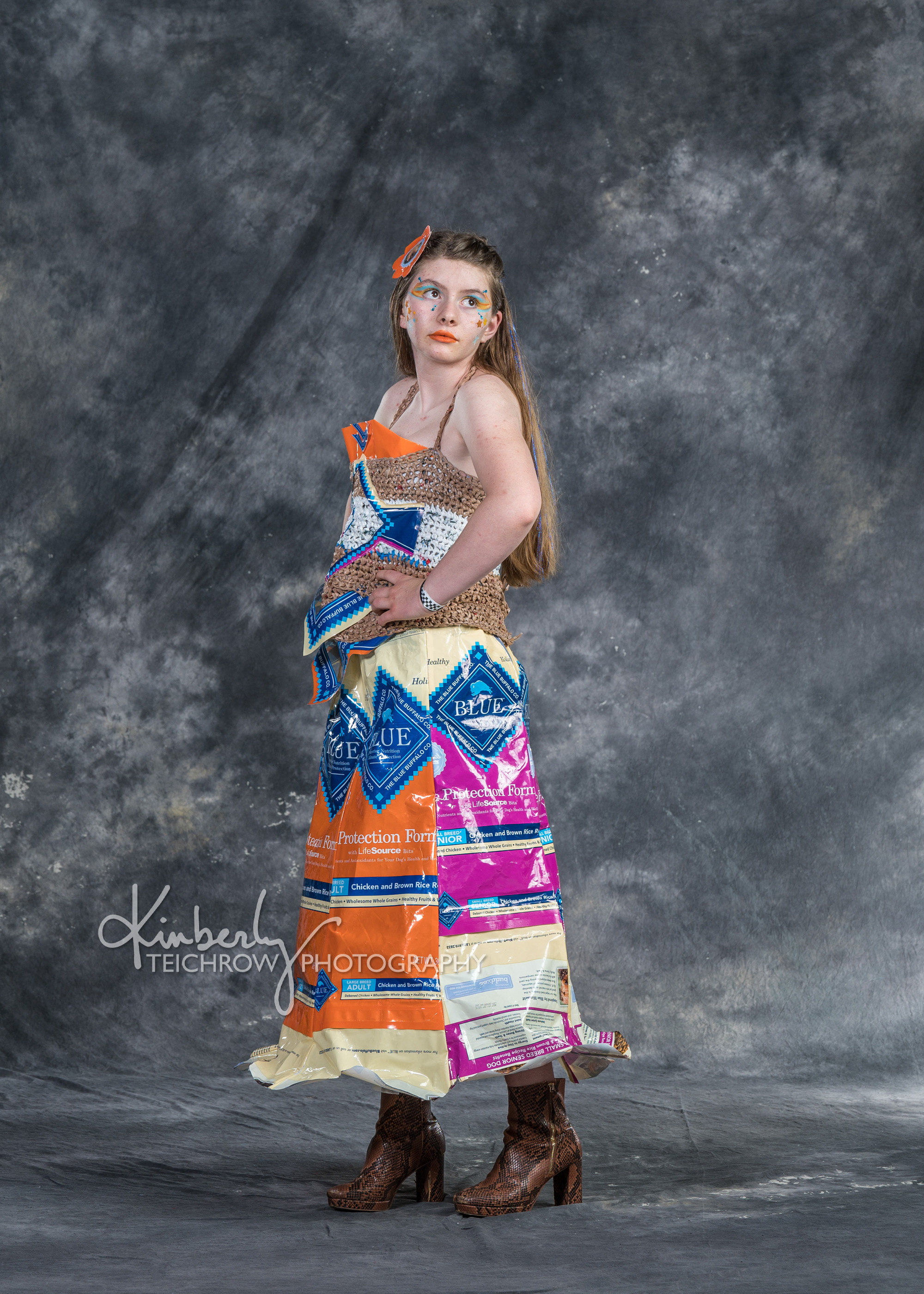 Designer/Model: Alexis Johnston Materials: Farm animal feed bags, leftover ribbon, thread, and Pom poms – Pilot Butte Middle School