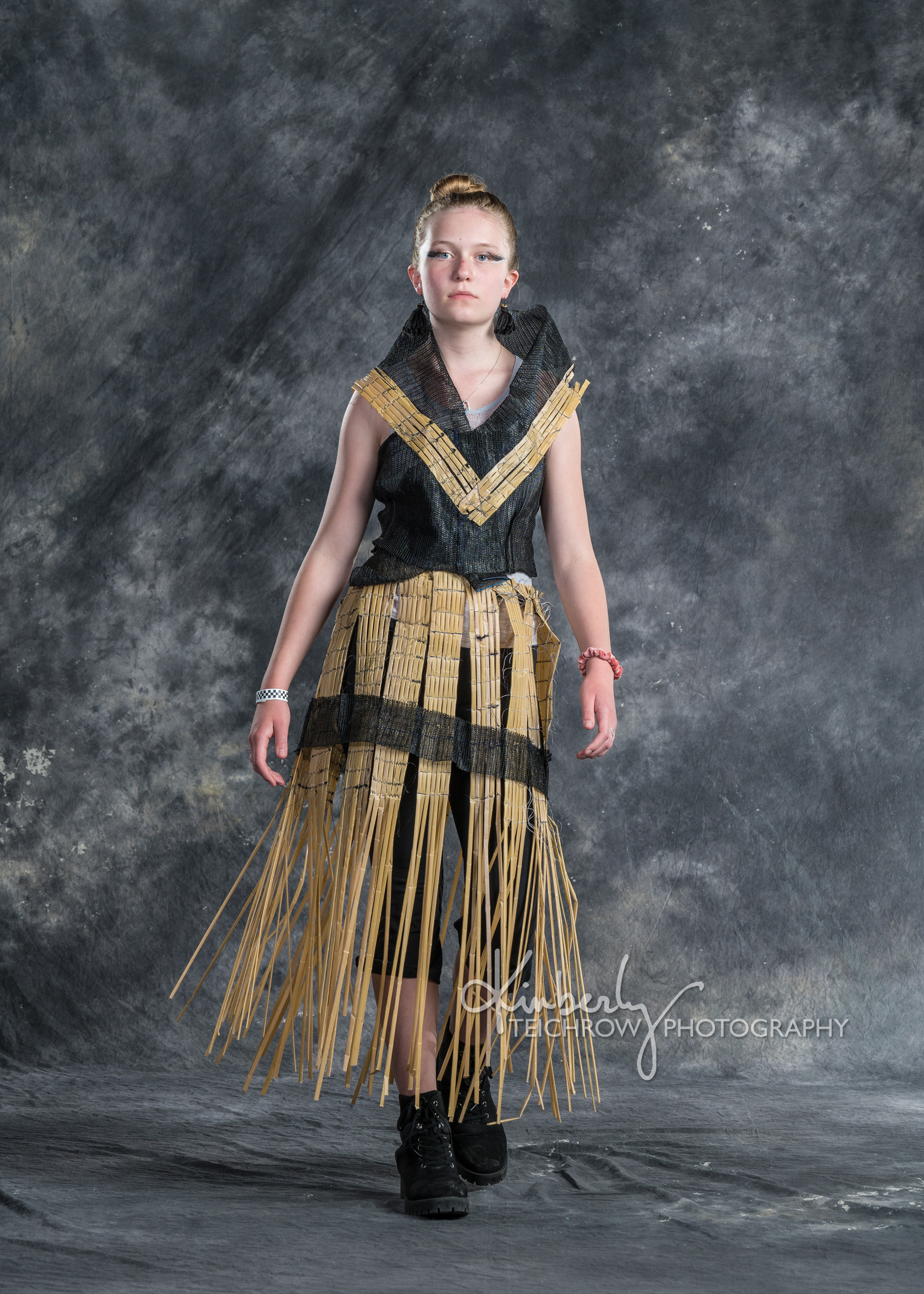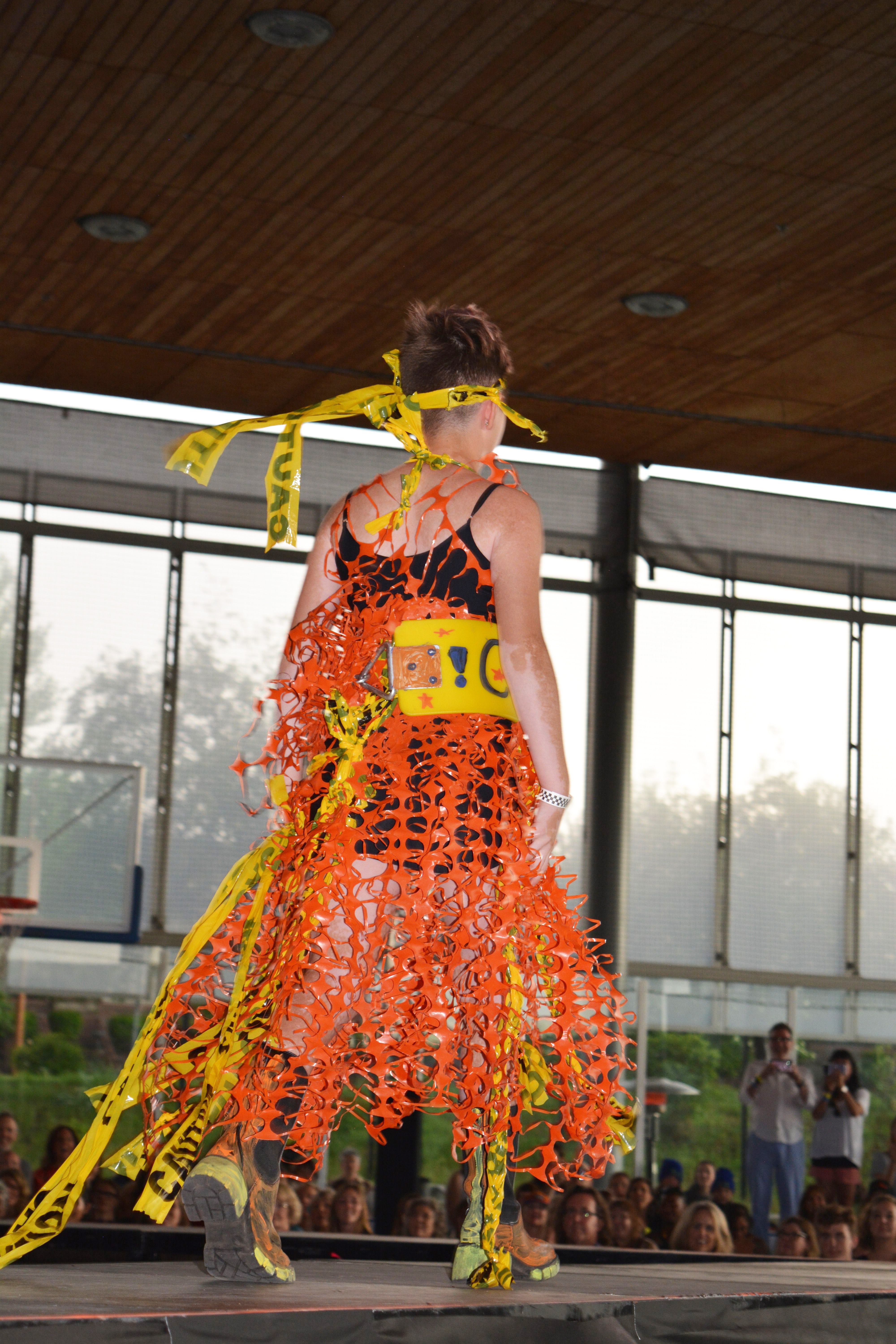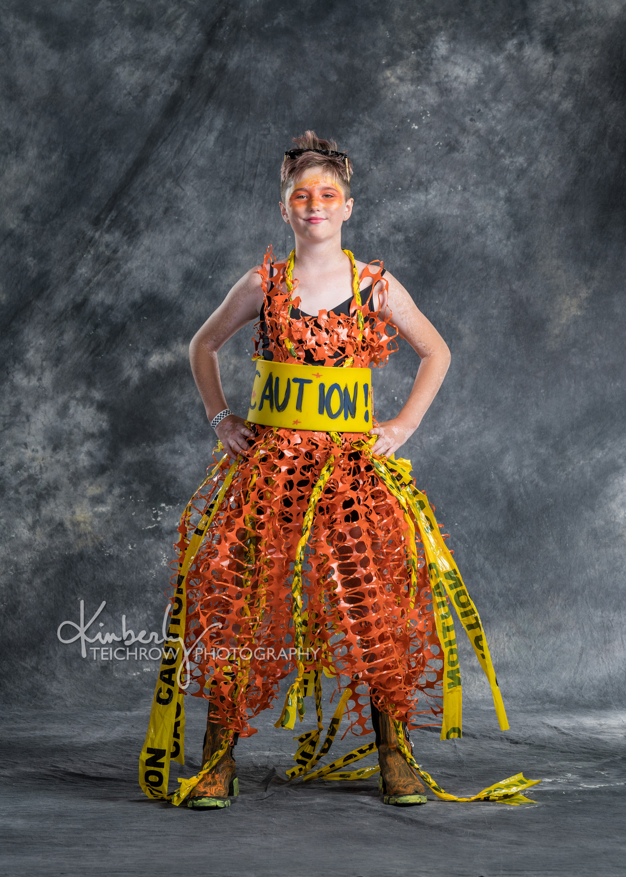 Designer/Model: Maisie Donoher Materials: Construction fencing, Caution tape, Mt Bachelor sign fabric, metal soda can, used camisole – Forge School