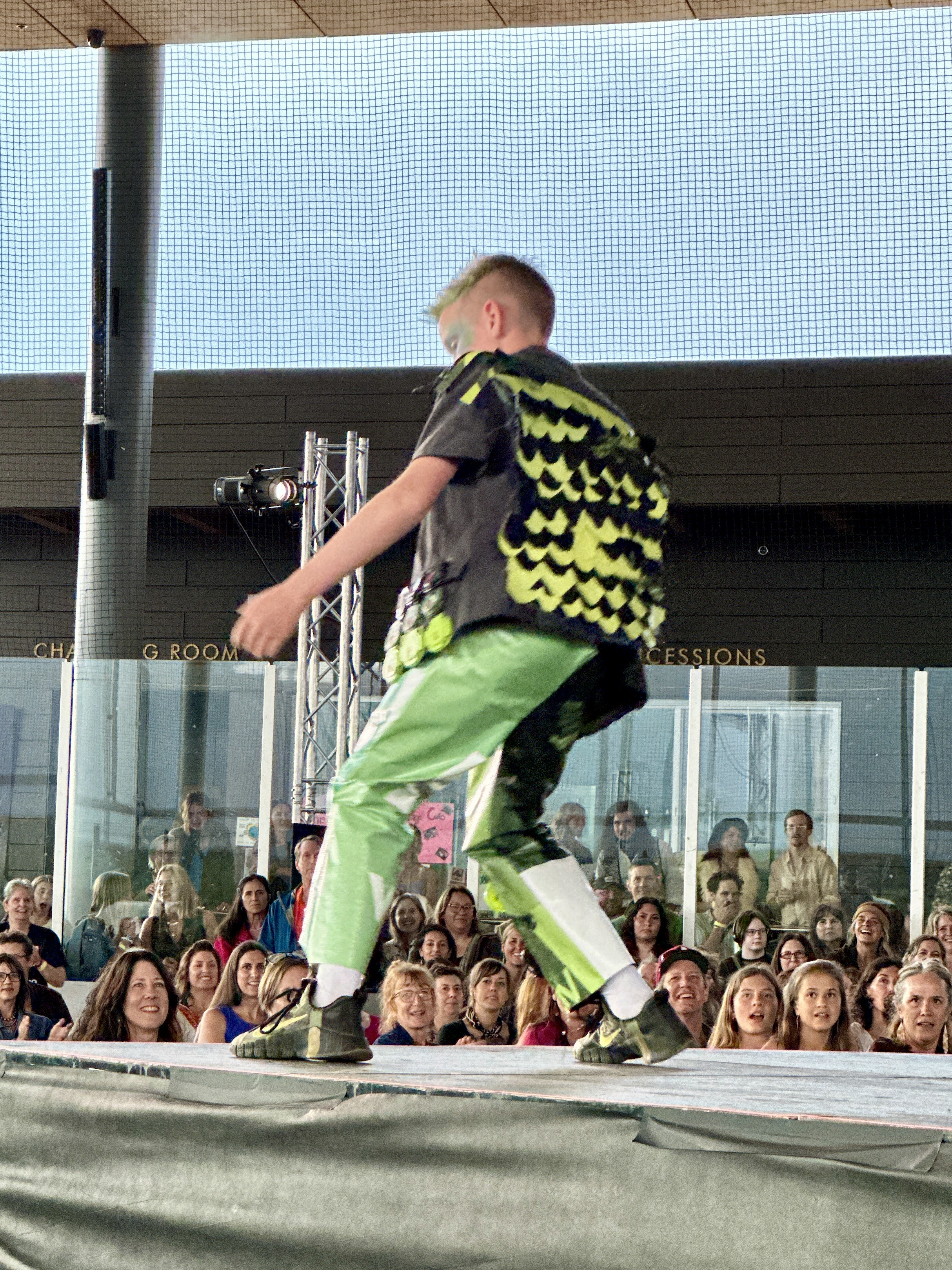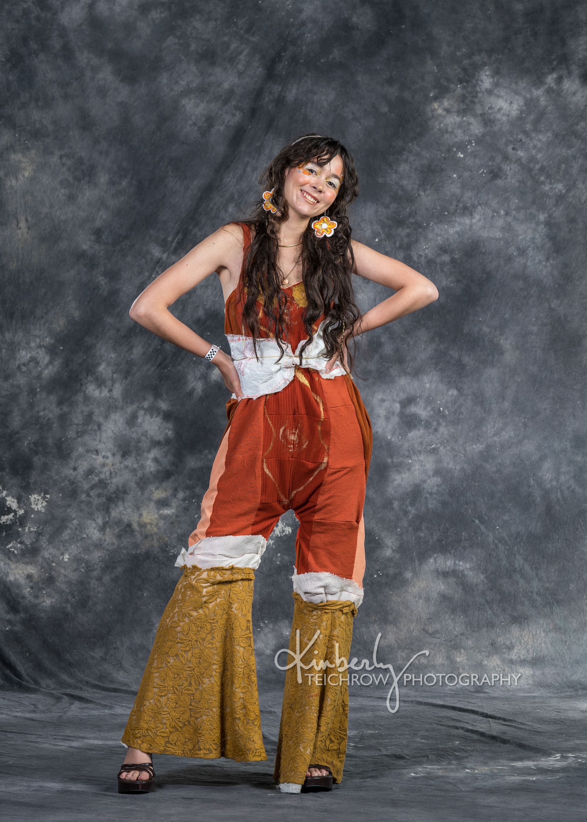 Designers: Claire Minter & Neve Maki Model: Claire Minter Materials: Old snow pants, thrift store shirt, wrapping paper – Amity Creek Elementary