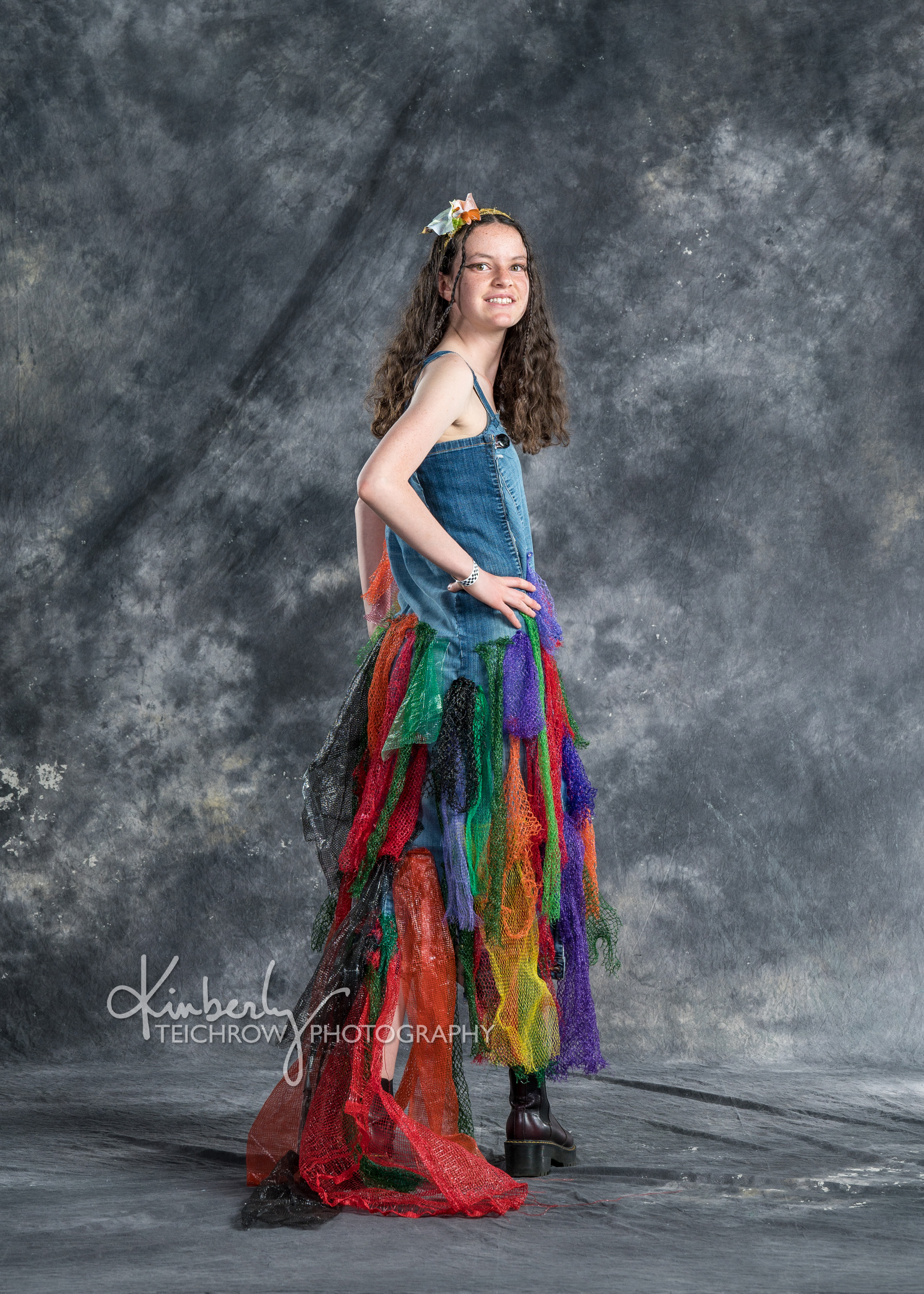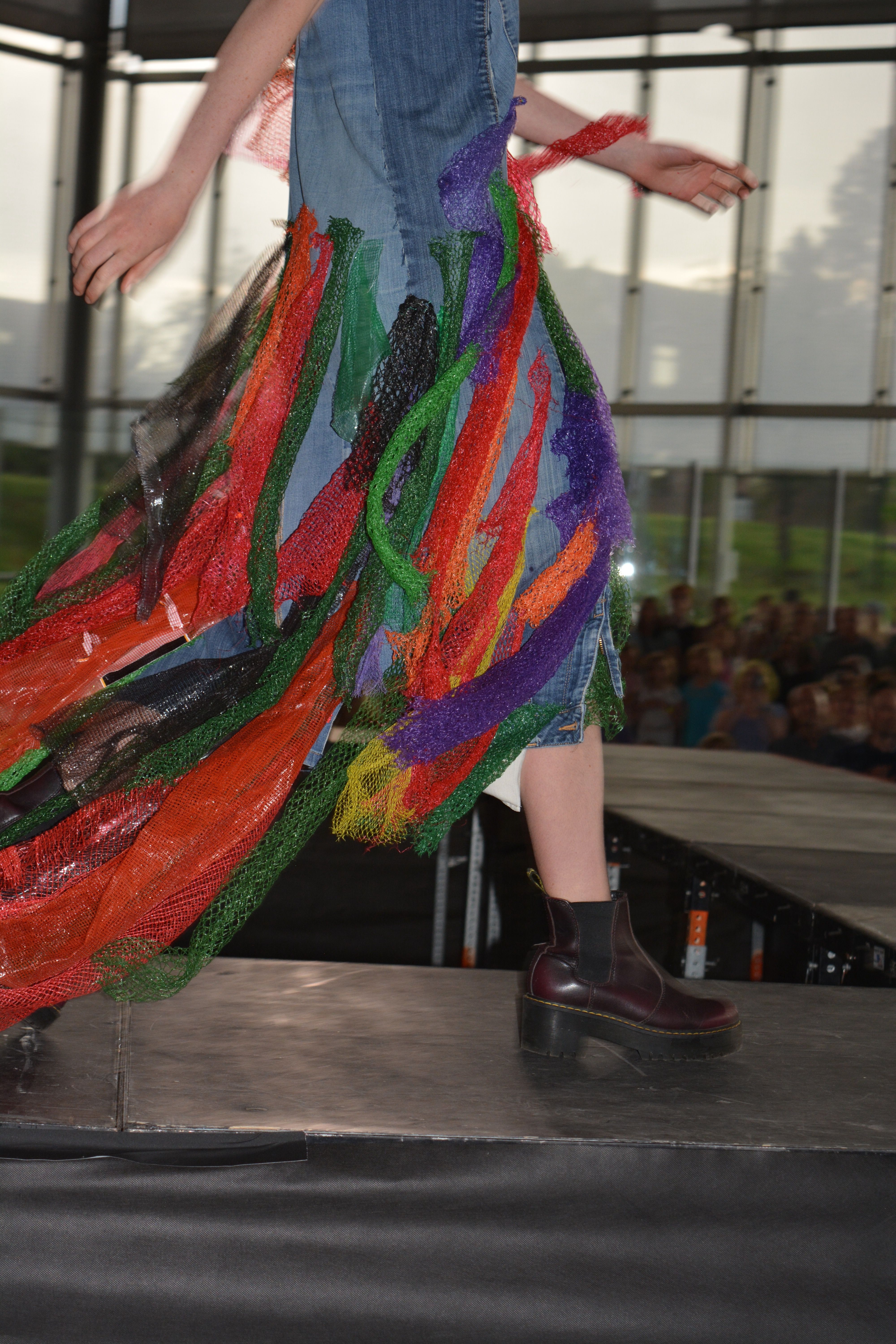 Designer/Model: Vida Halpern Materials: Old ripped jeans, colorful mesh produce bags – Realms Middle School