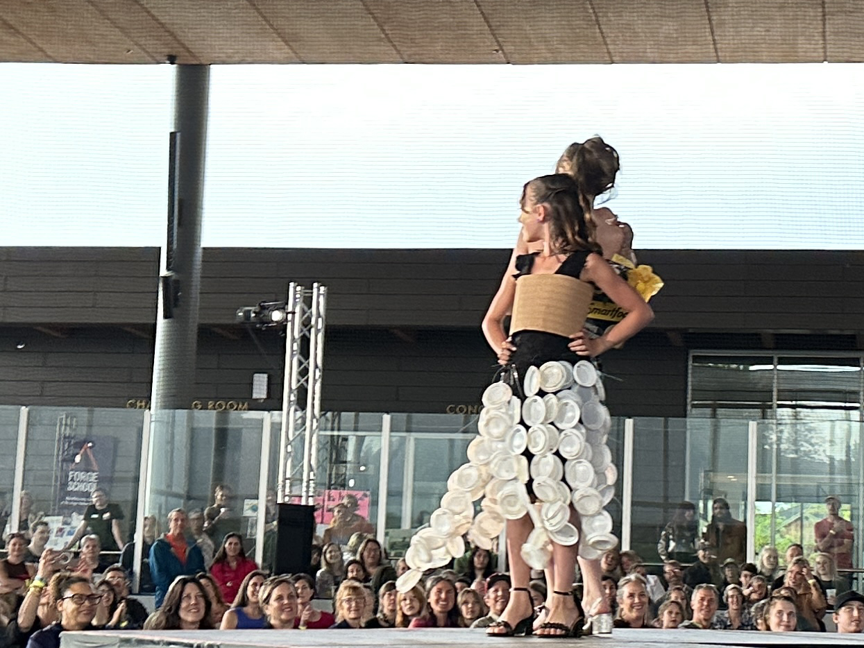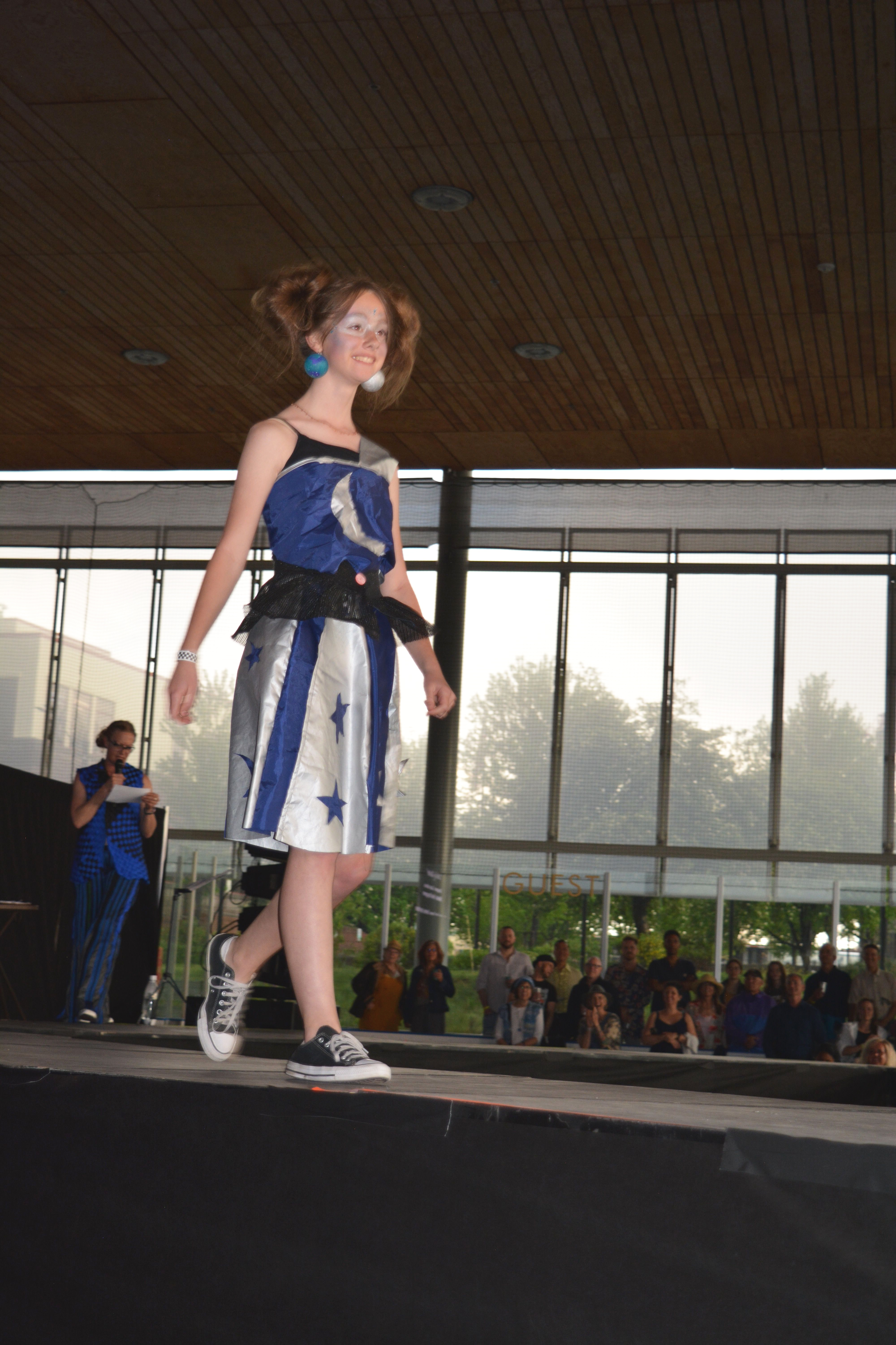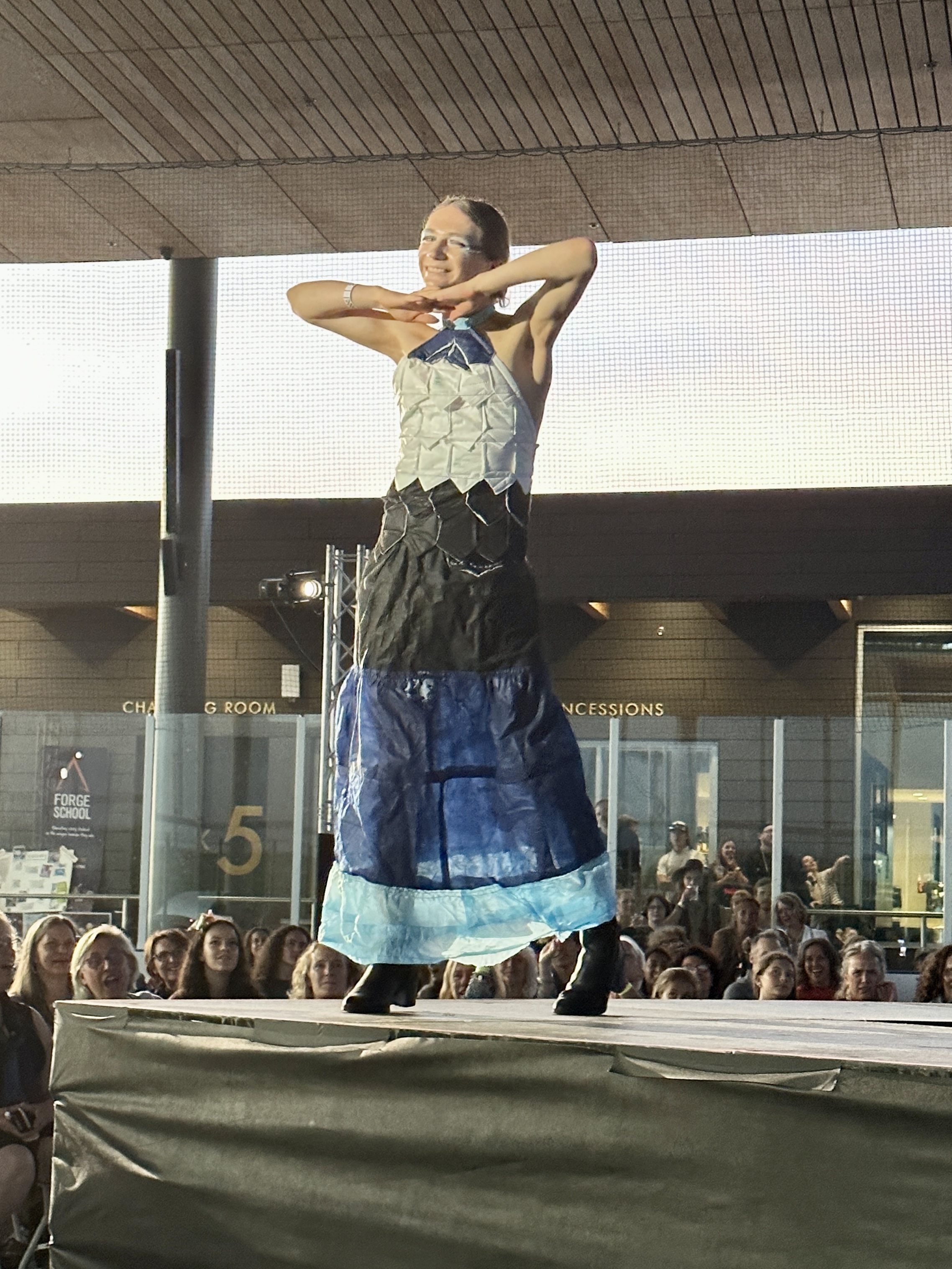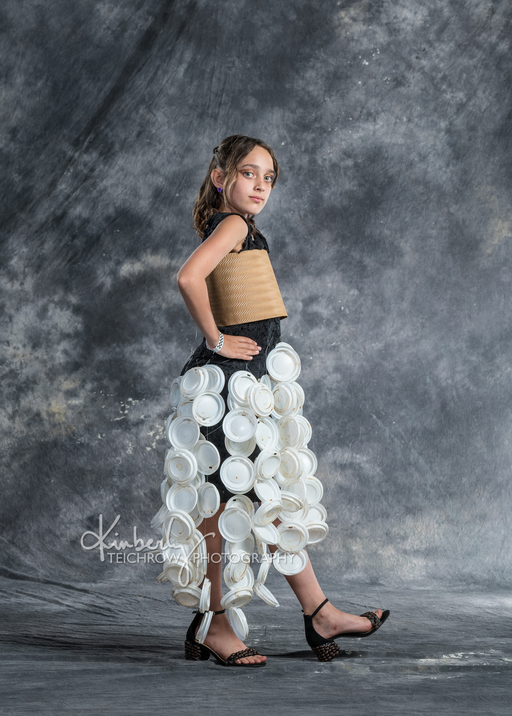 Designer/Model: Ava Dockter Materials: thrifted under dress, coffee lids, cardboard, old shoelace – Forge School