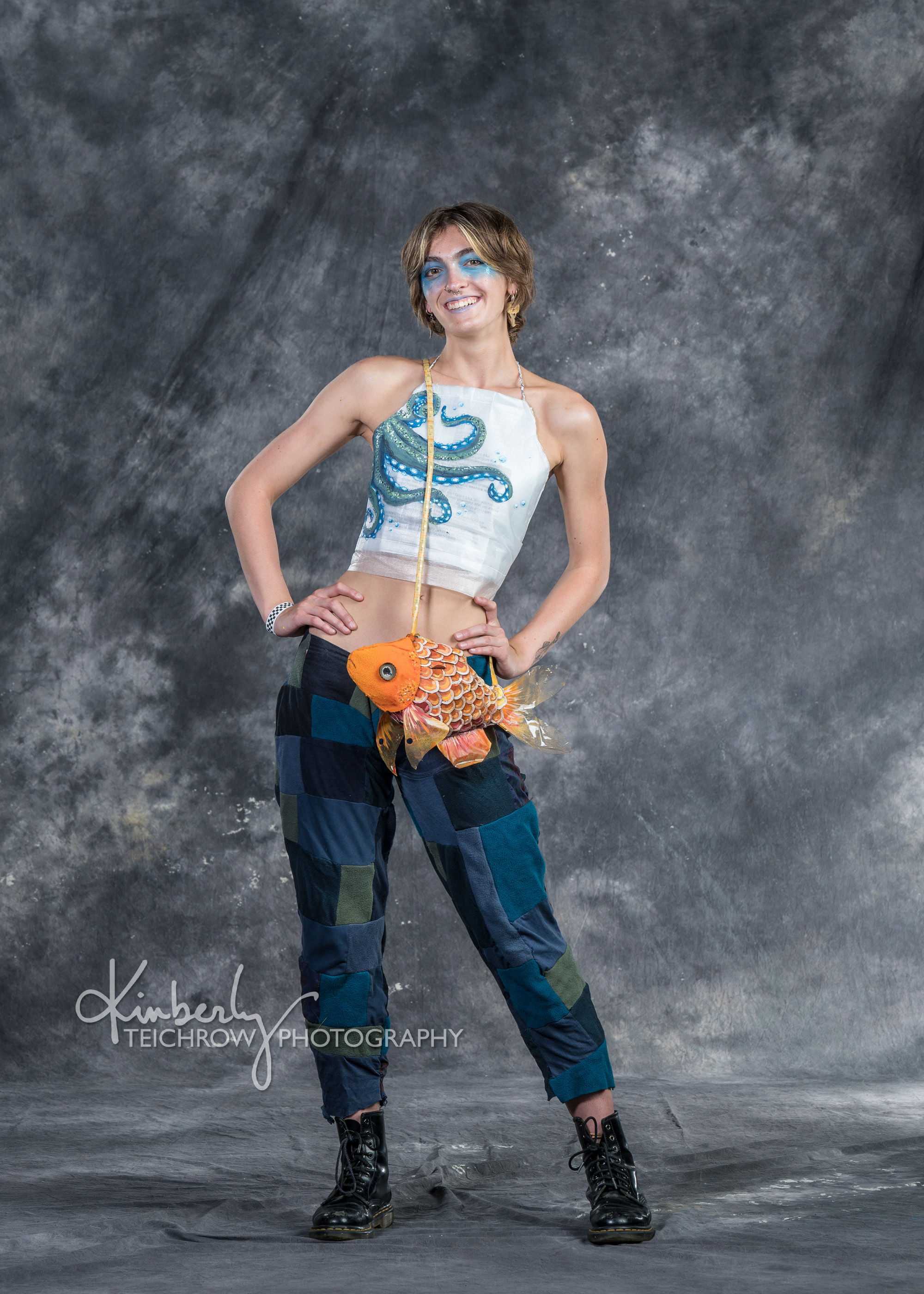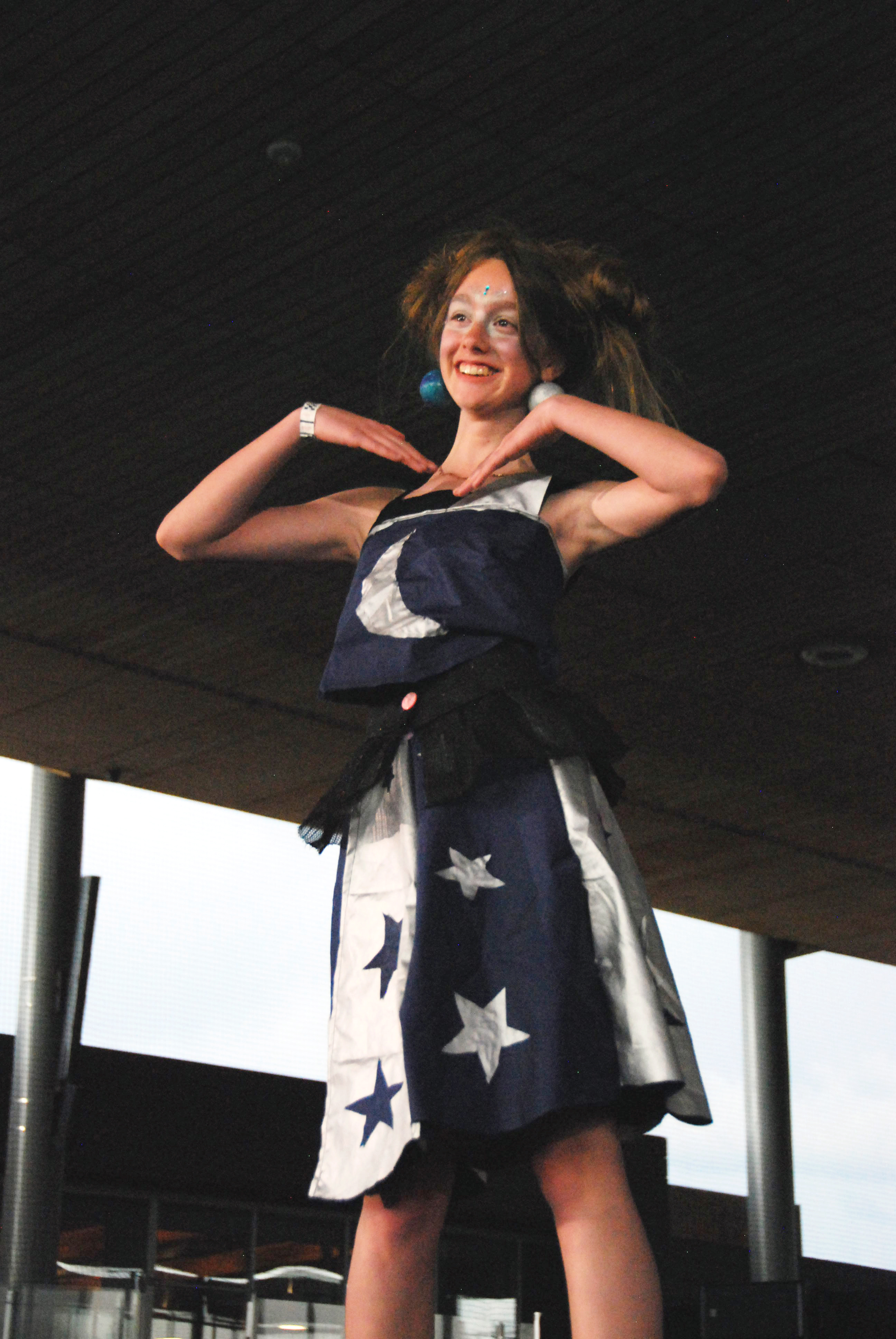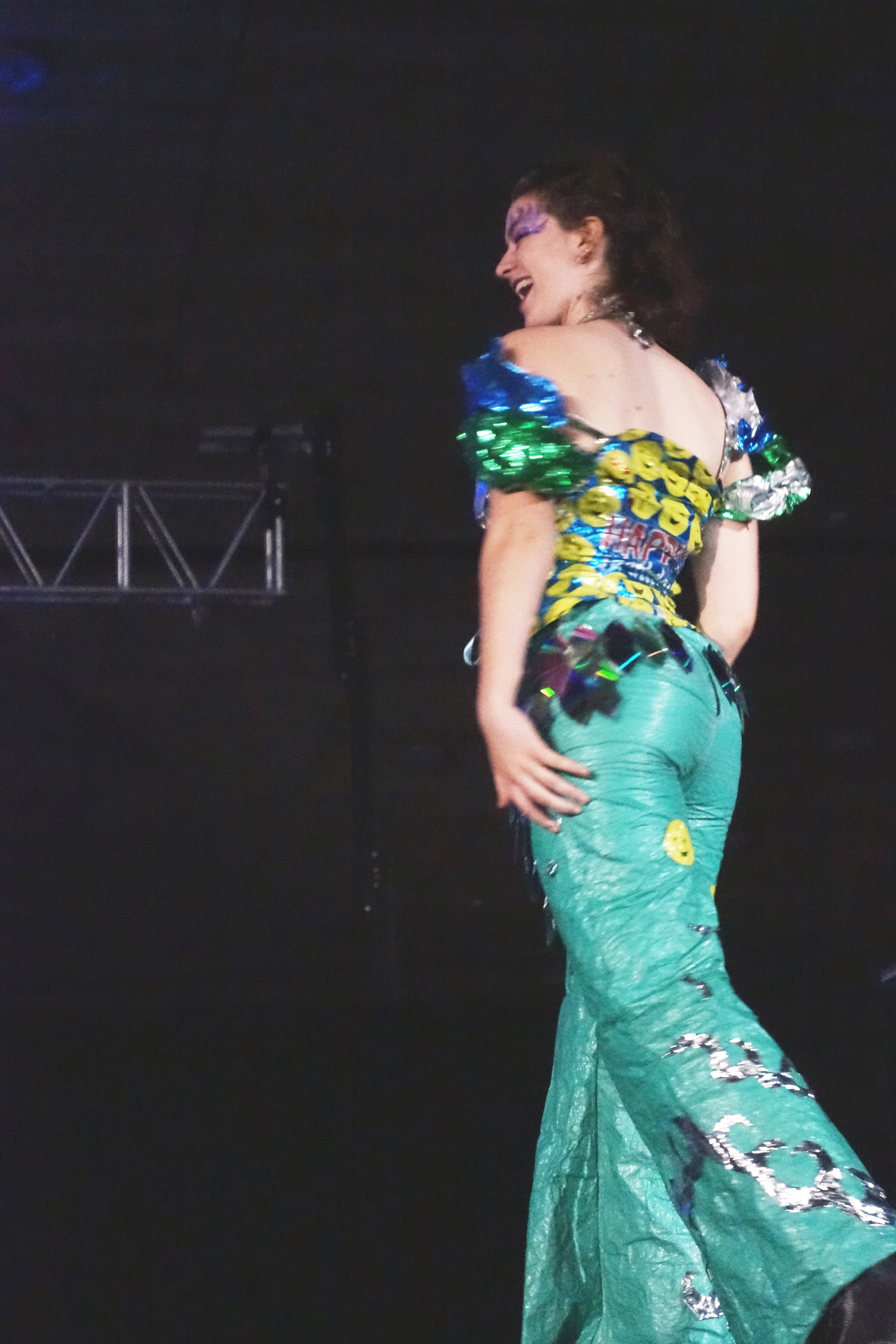 Designer/Model: Tessa Baraybar Materials: Helium balloons, tarp, CDs, pop tops, old fabric Bend High School