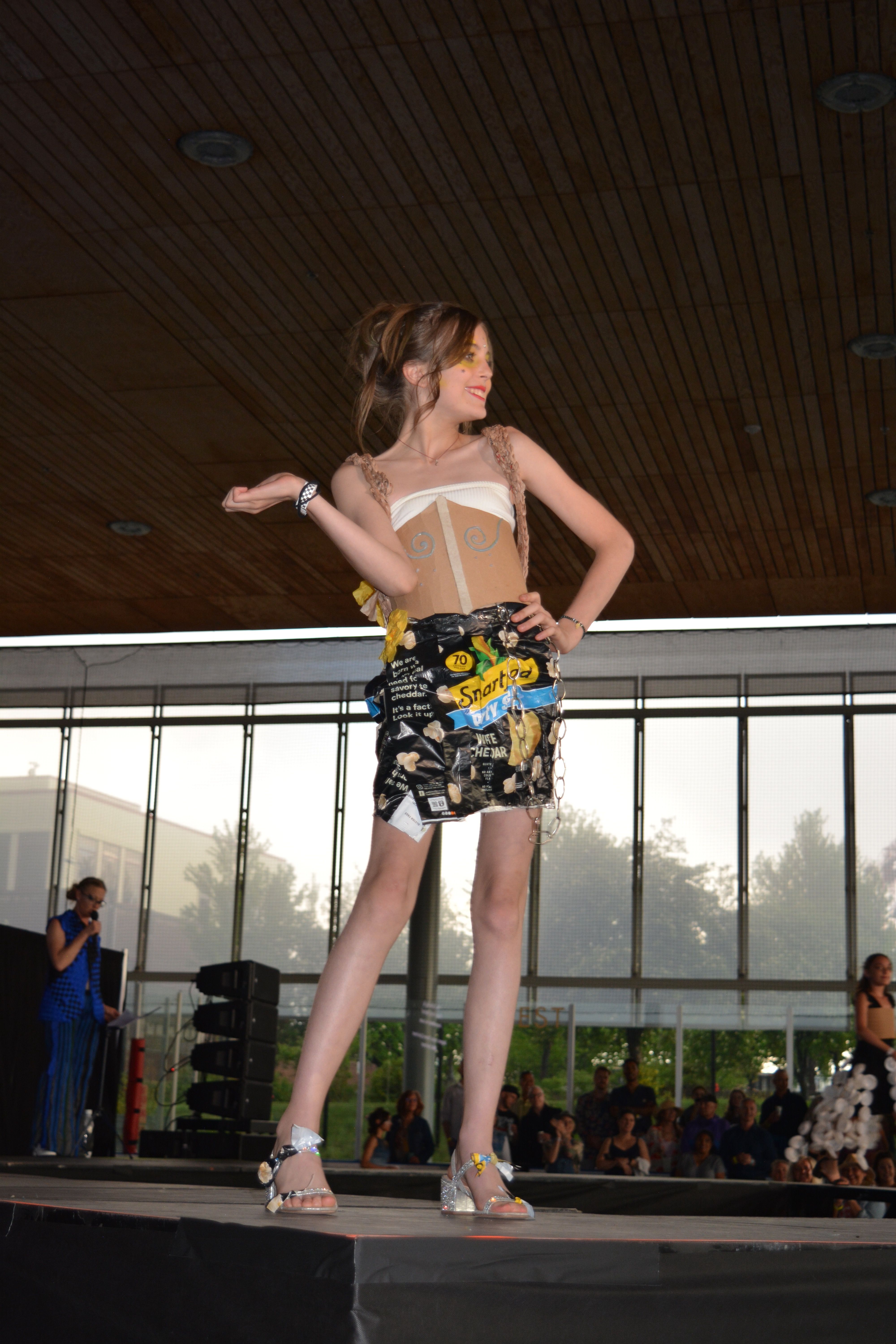 Designer/Model: Simone Halpern Materials: Snack wrappers, netting – Realms Middle School