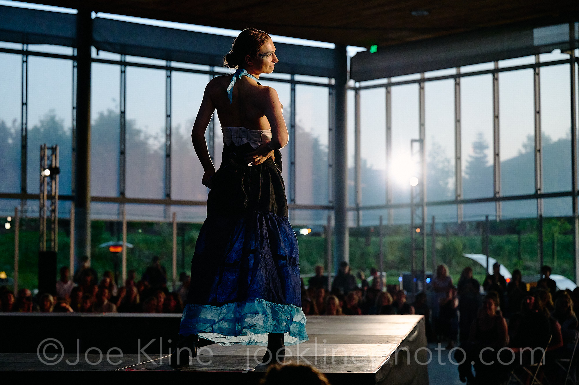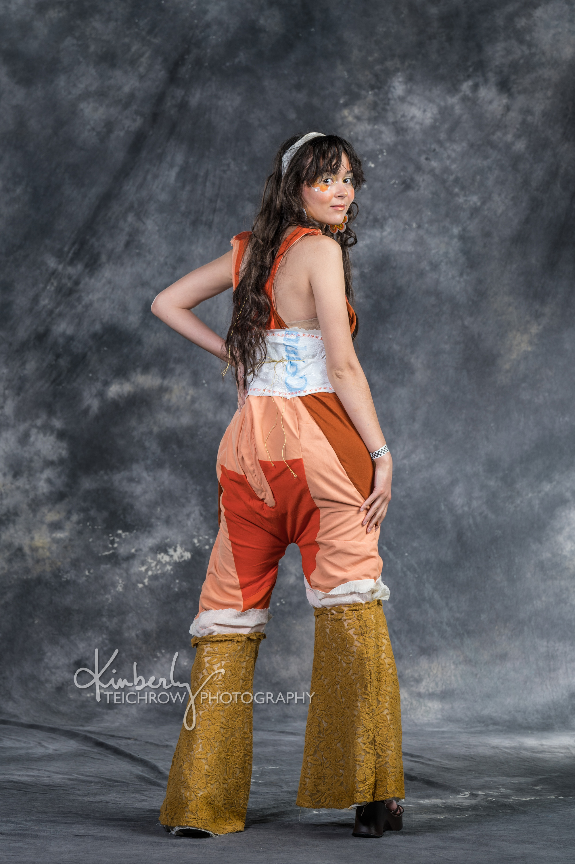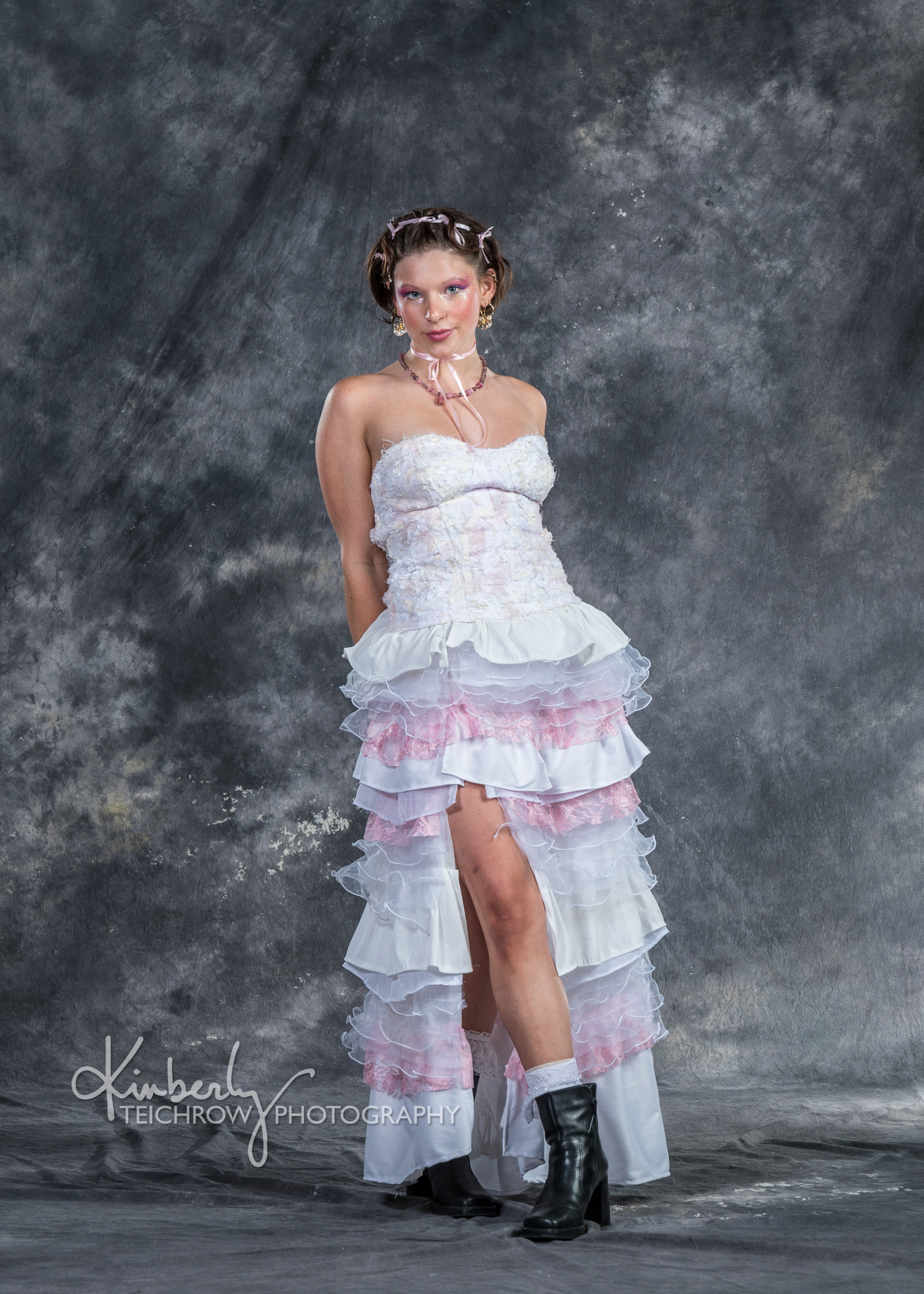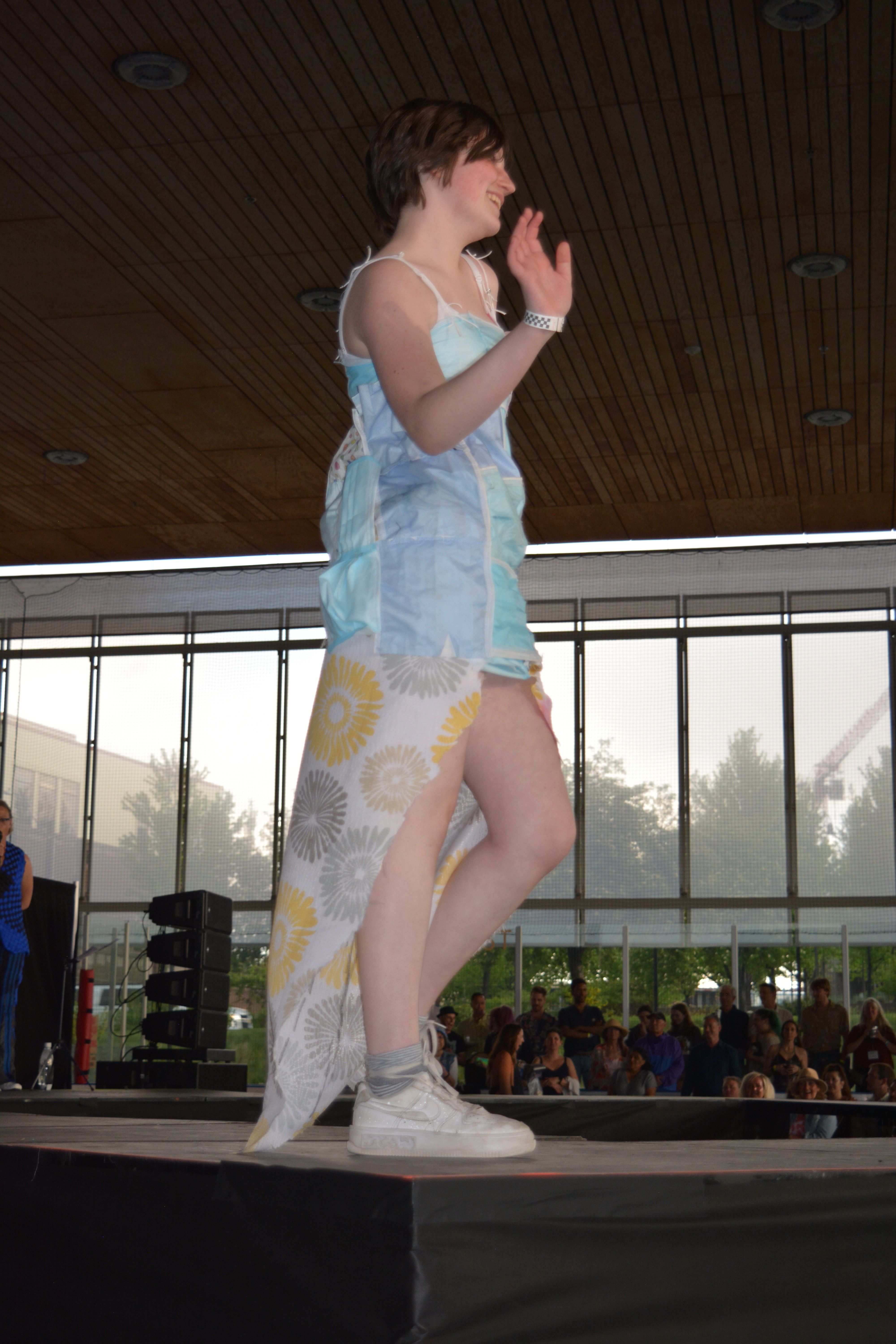 Designer/Model: Noelani Anderson Materials: Old bedsheet, Plastic bags, plastic yogurt/food container, Scrap fabrics, old t-shirts, stained dress, stained lace dress, holy sweater, paint – Central Oregon Community College