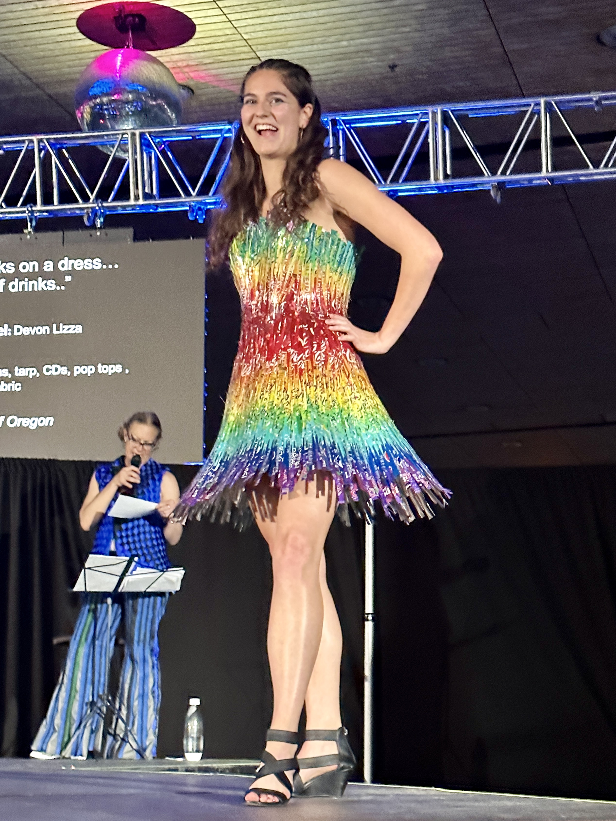 Designer/Model: Devon Lizza Materials: Helium balloons, tarp, CDs, pop tops , old fabric – University of Oregon