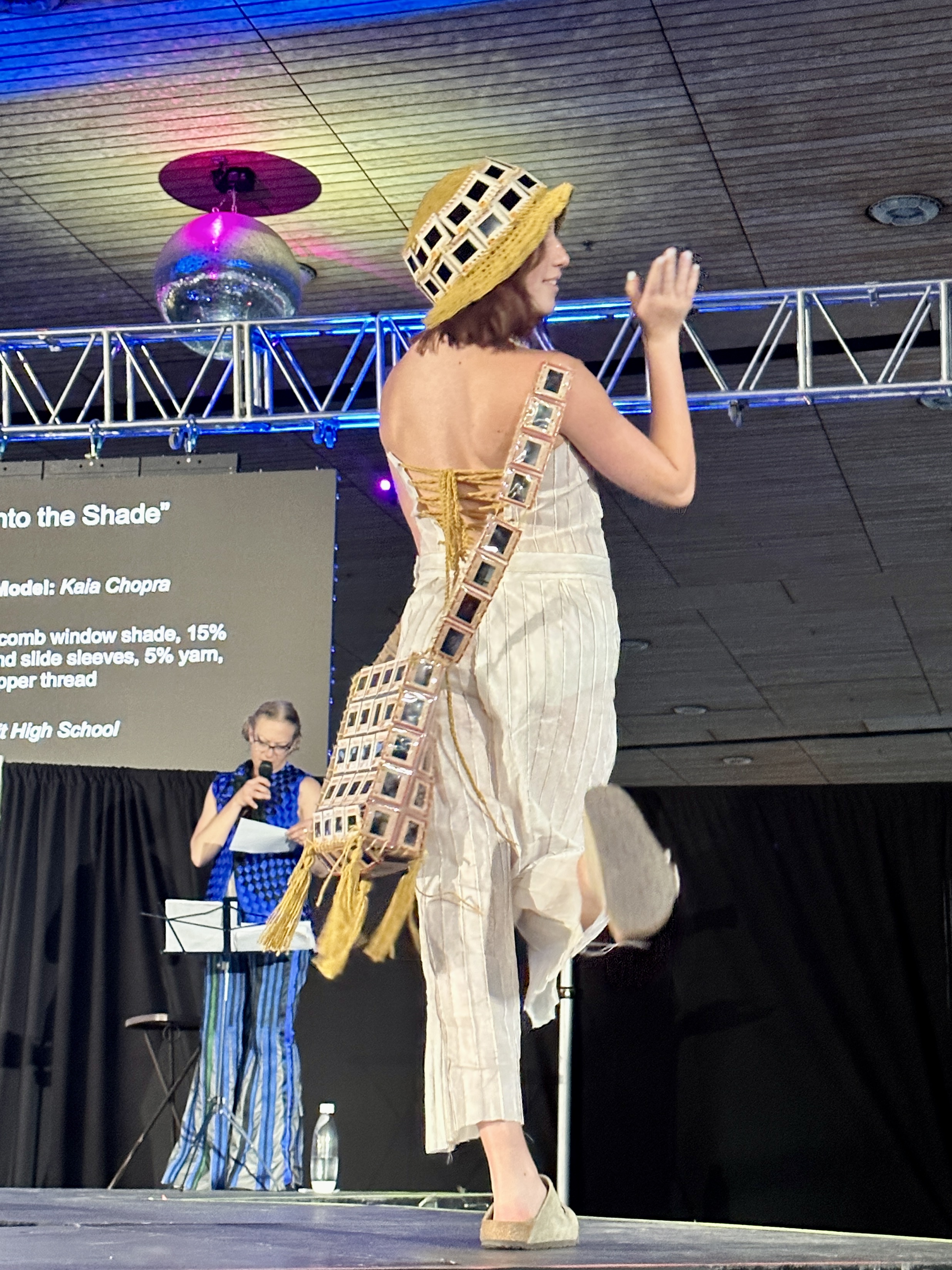 Designer/Model: Kaia Chopra Materials: honeycomb window shade, 15% vintage slides and slide sleeves, 5% yarn – Summit High School