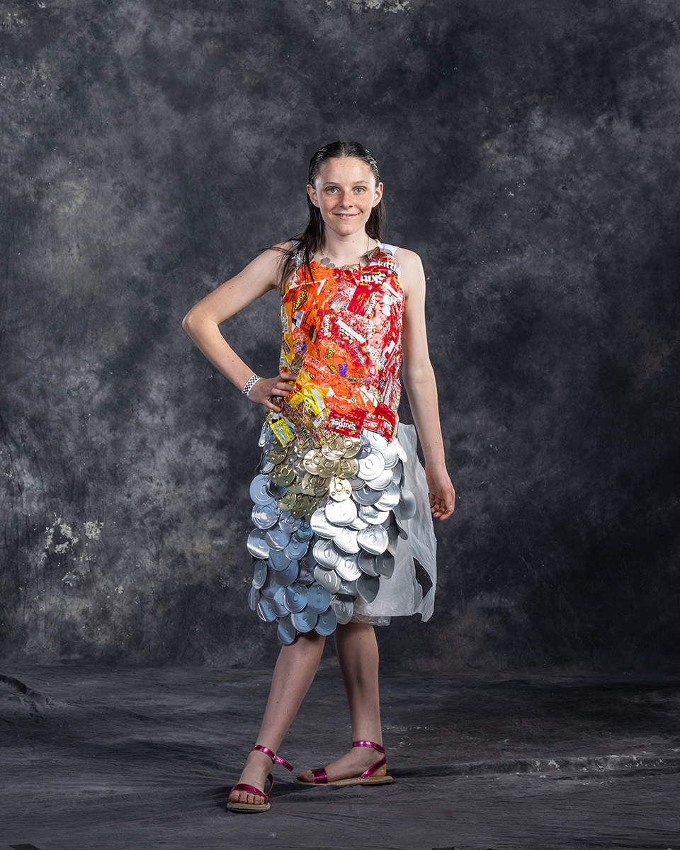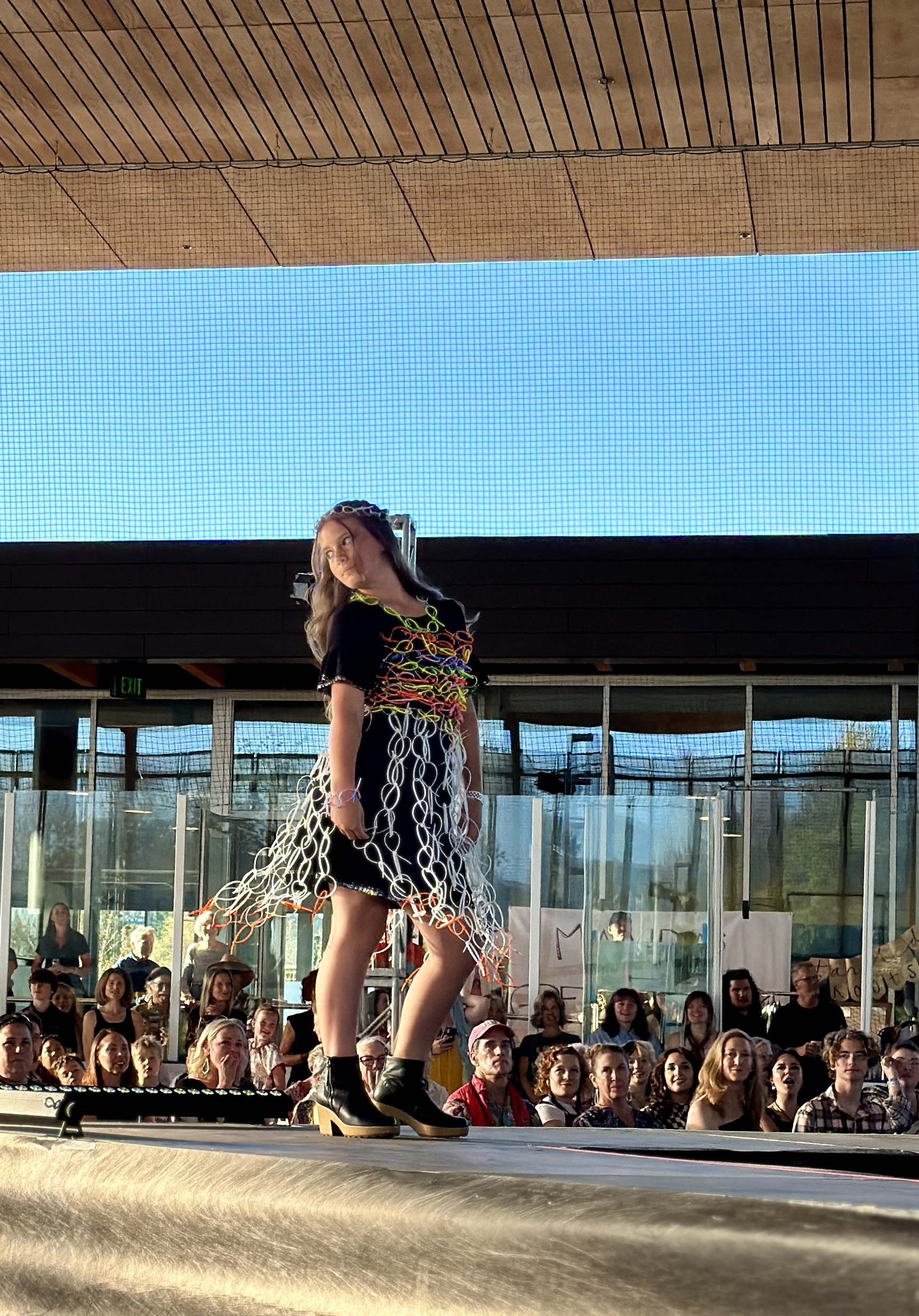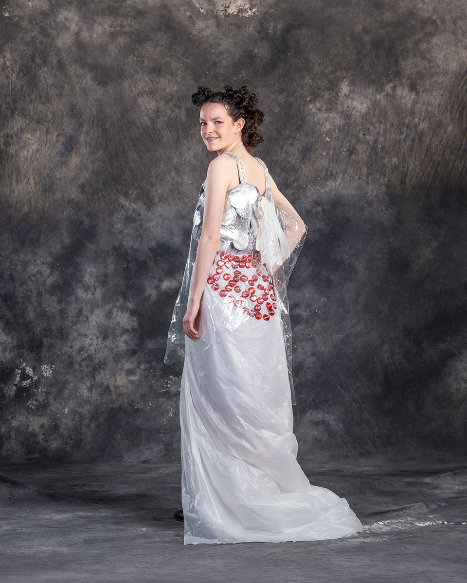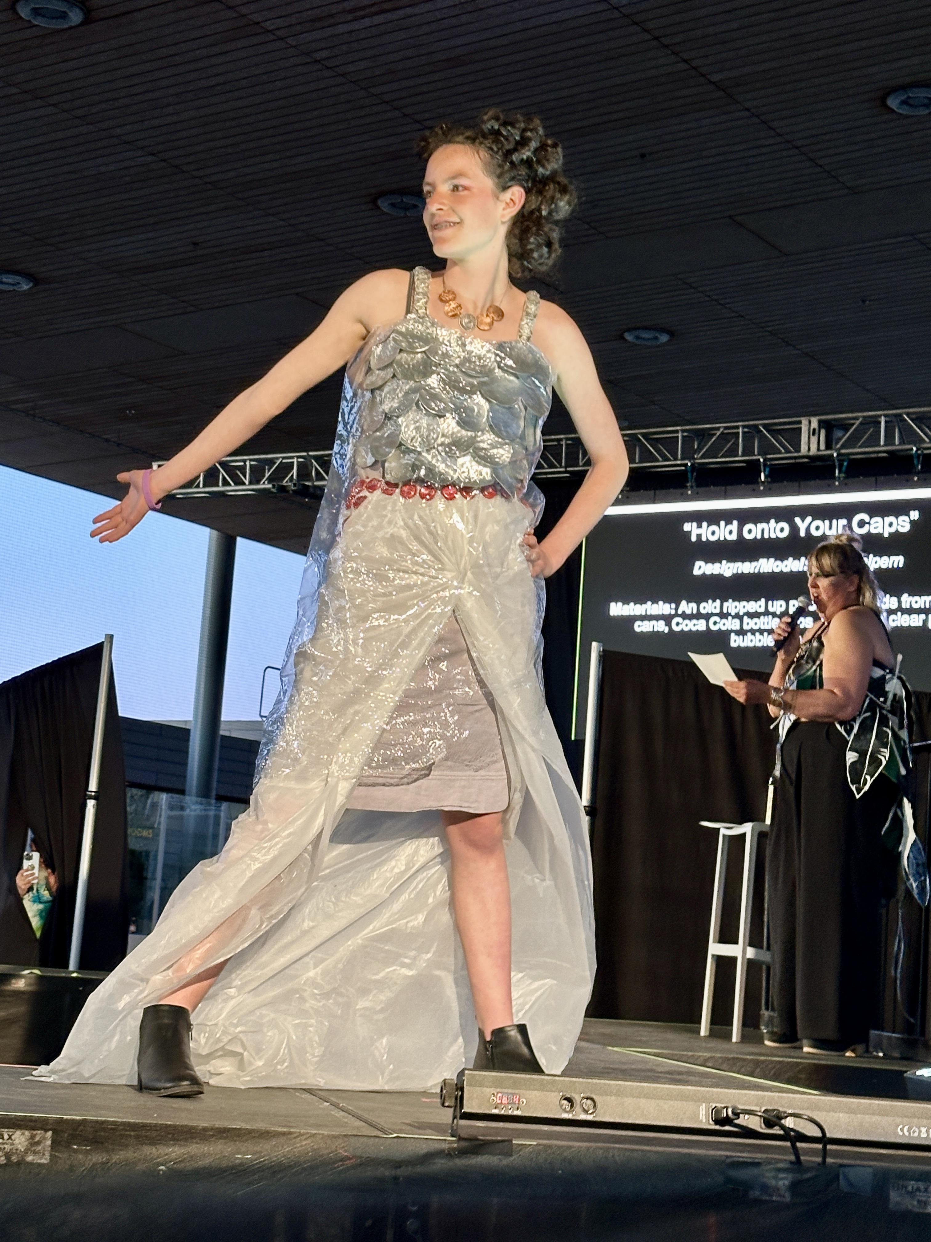 “NOT TRASH BUT TREASURE” Designer: Clara Wirtz Model: Neve Maki Materials: Repurposed old dress, zip ties pulled from the trash, bottle tabs – CASCADE Middle School