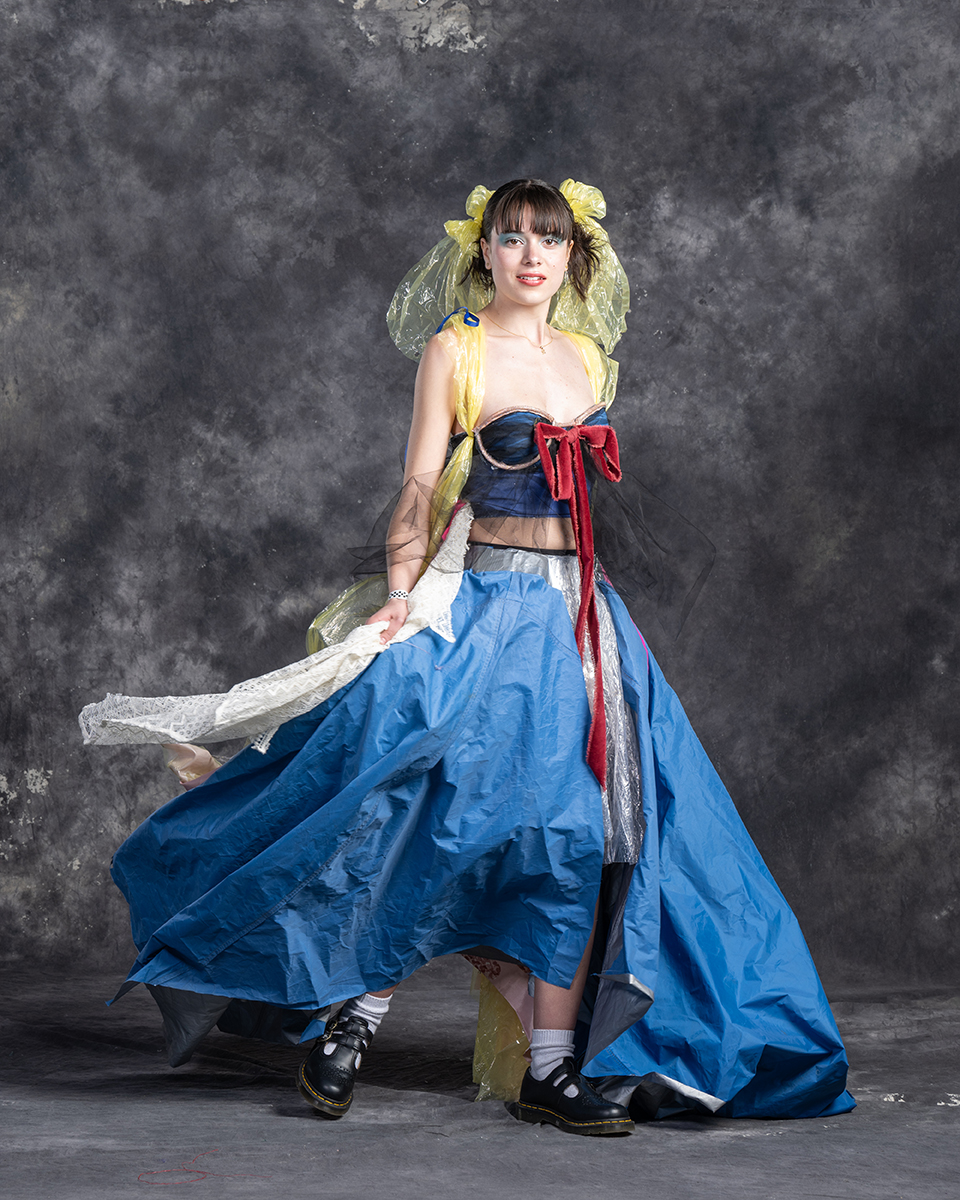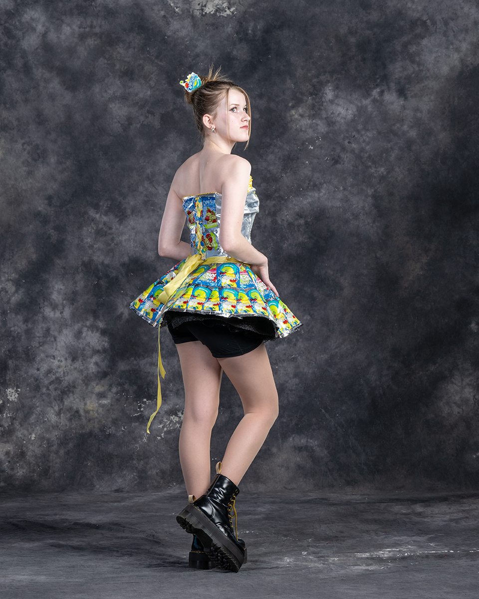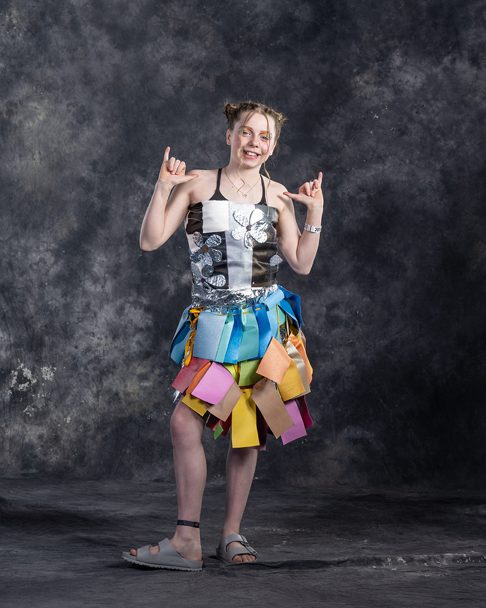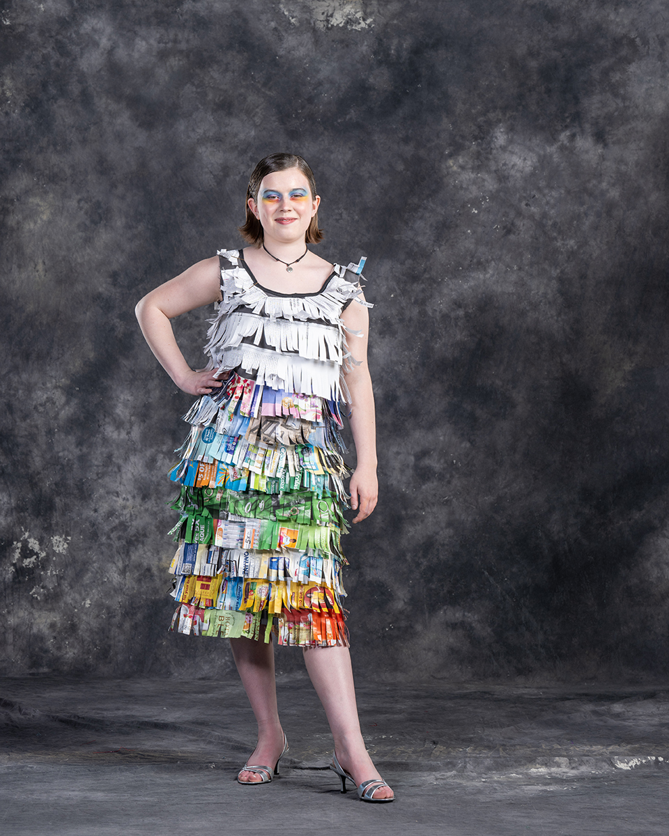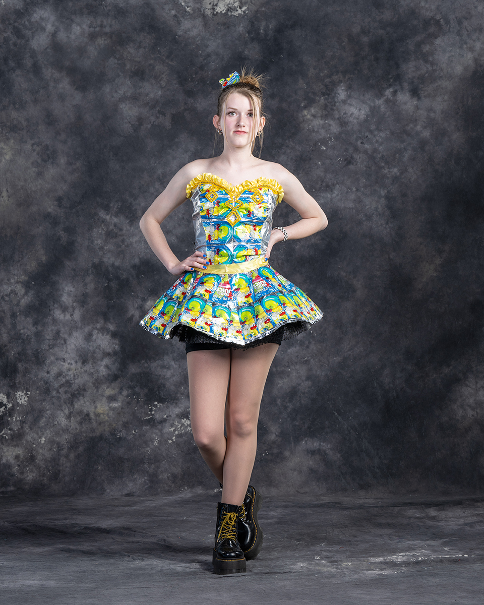 “NOT TRASH BUT TREASURE” Designer: Clara Wirtz Model: Neve Maki Materials: Repurposed old dress, zip ties pulled from the trash, bottle tabs – CASCADE Middle School