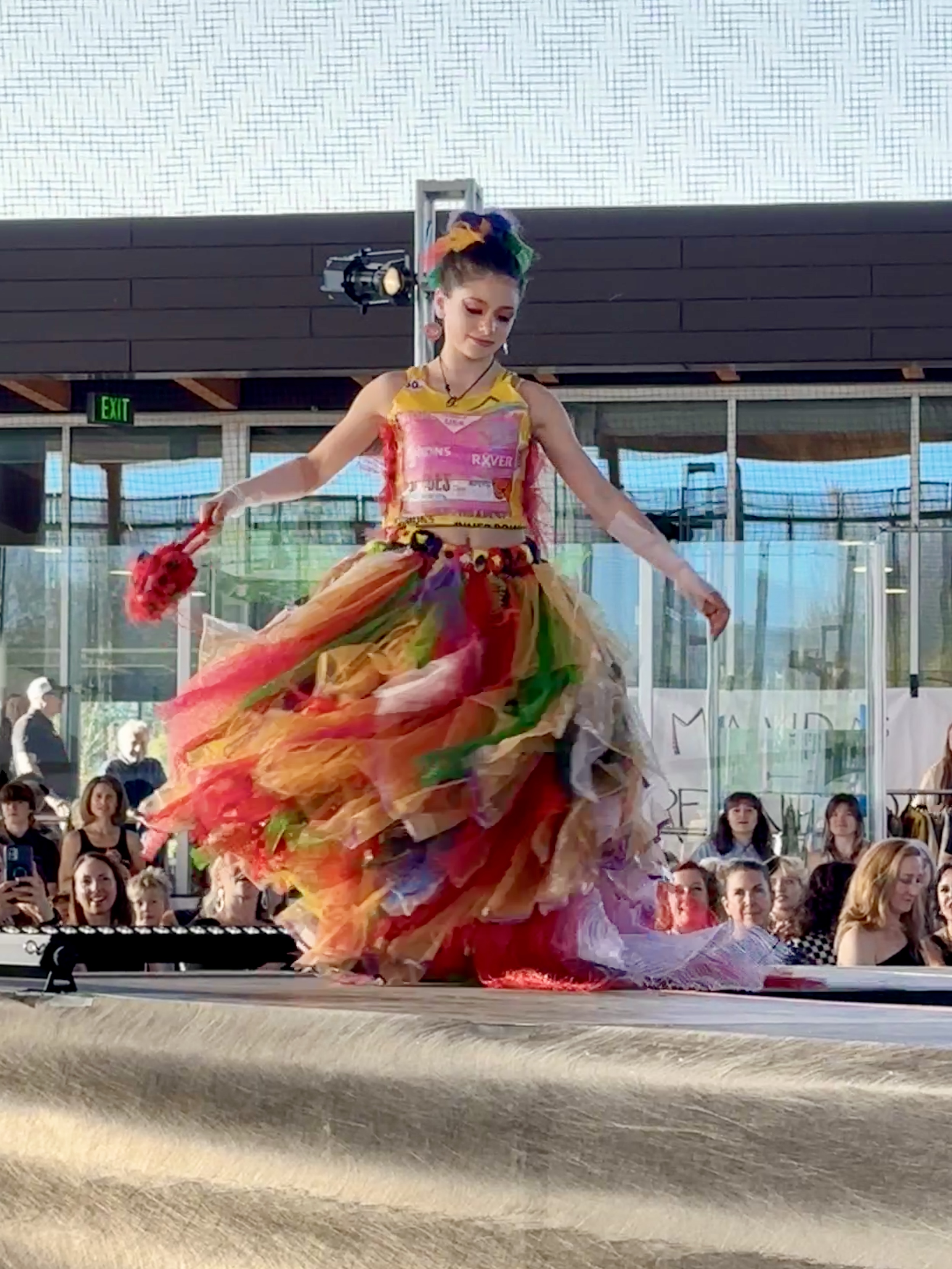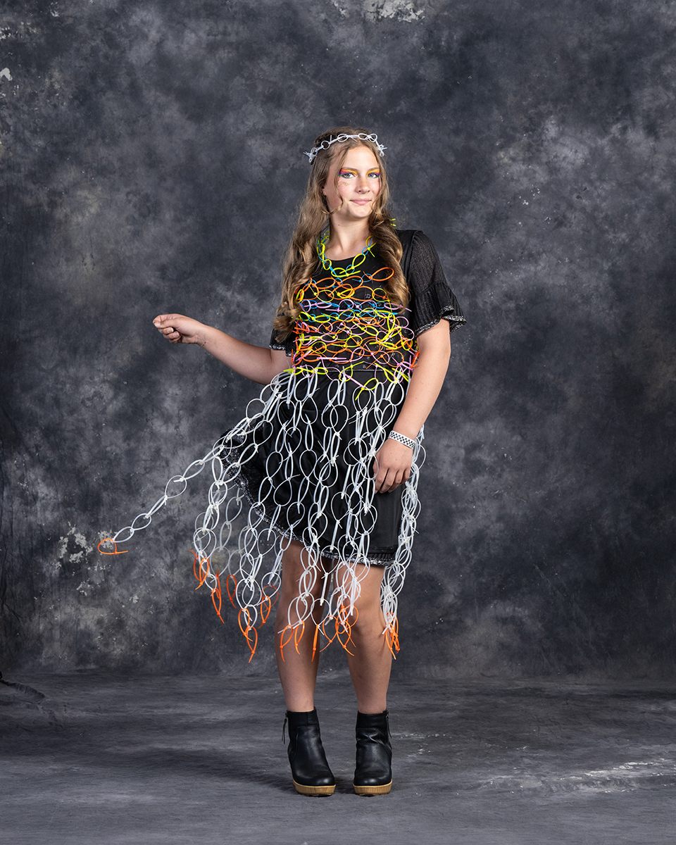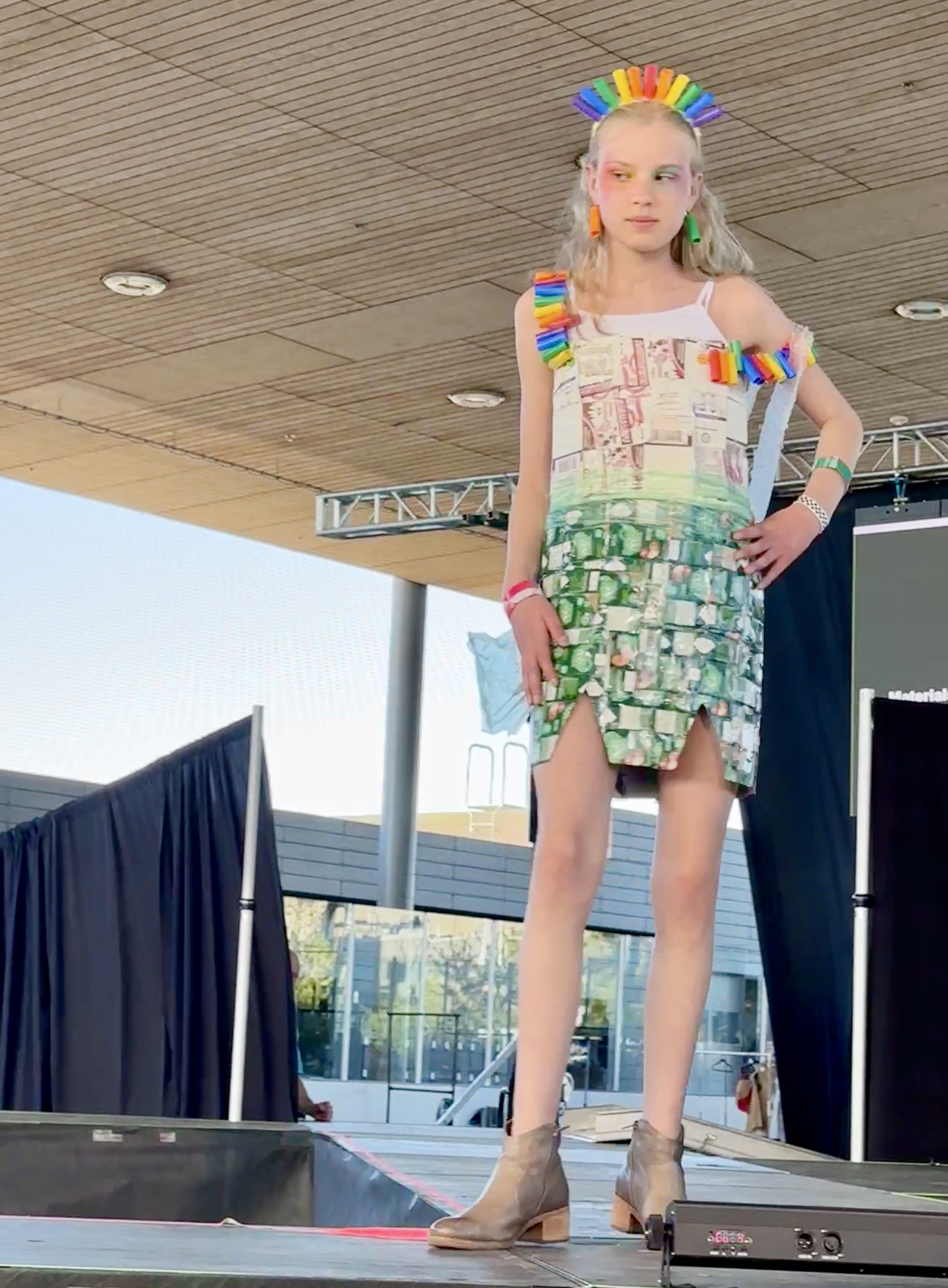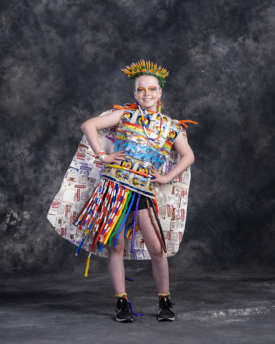 “NOT TRASH BUT TREASURE” Designer: Clara Wirtz Model: Neve Maki Materials: Repurposed old dress, zip ties pulled from the trash, bottle tabs – CASCADE Middle School