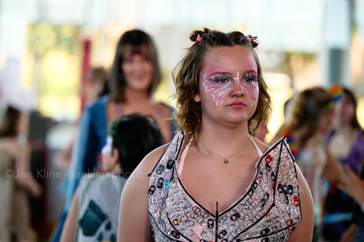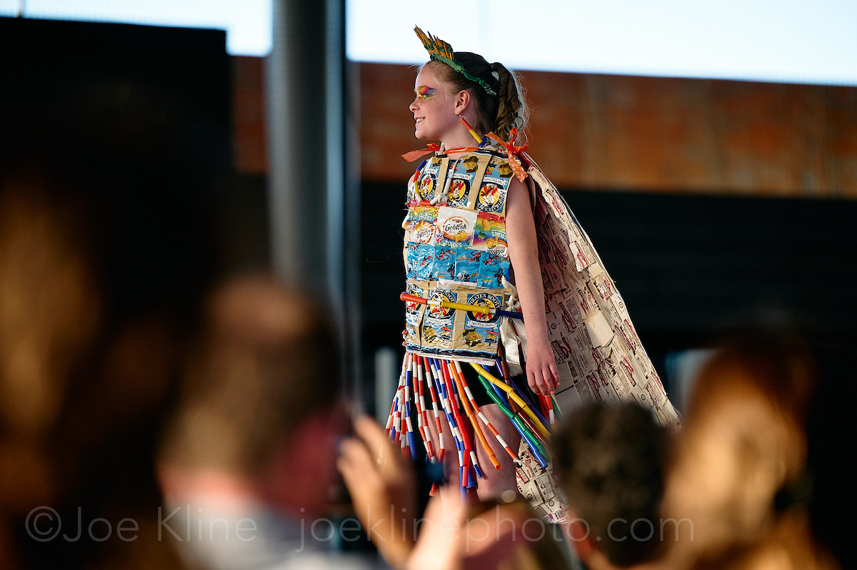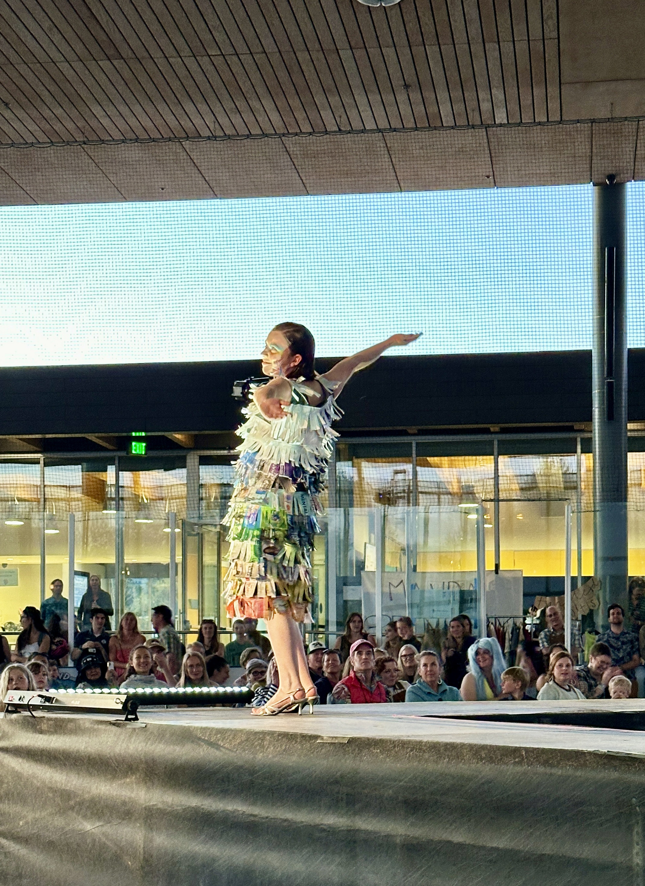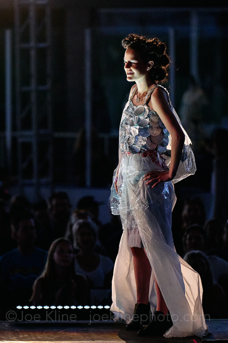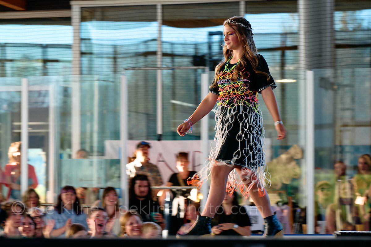 “NOT TRASH BUT TREASURE” Designer: Clara Wirtz Model: Neve Maki Materials: Repurposed old dress, zip ties pulled from the trash, bottle tabs – CASCADE Middle School