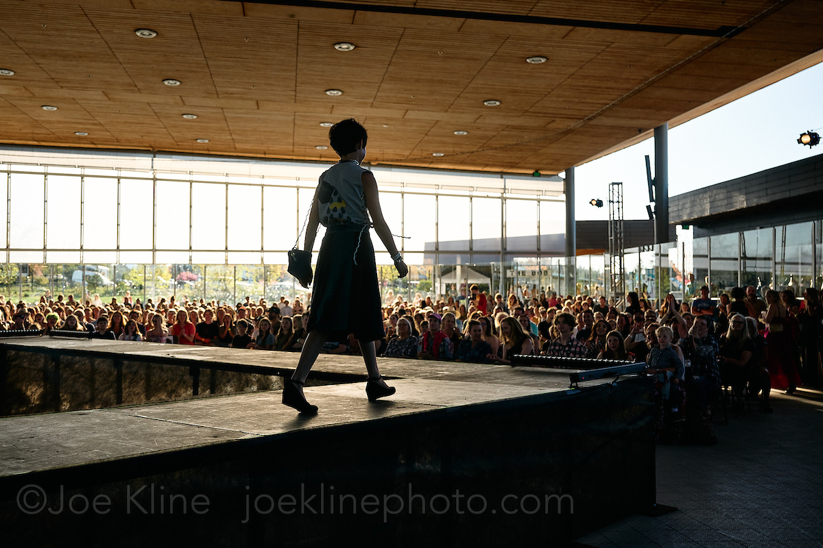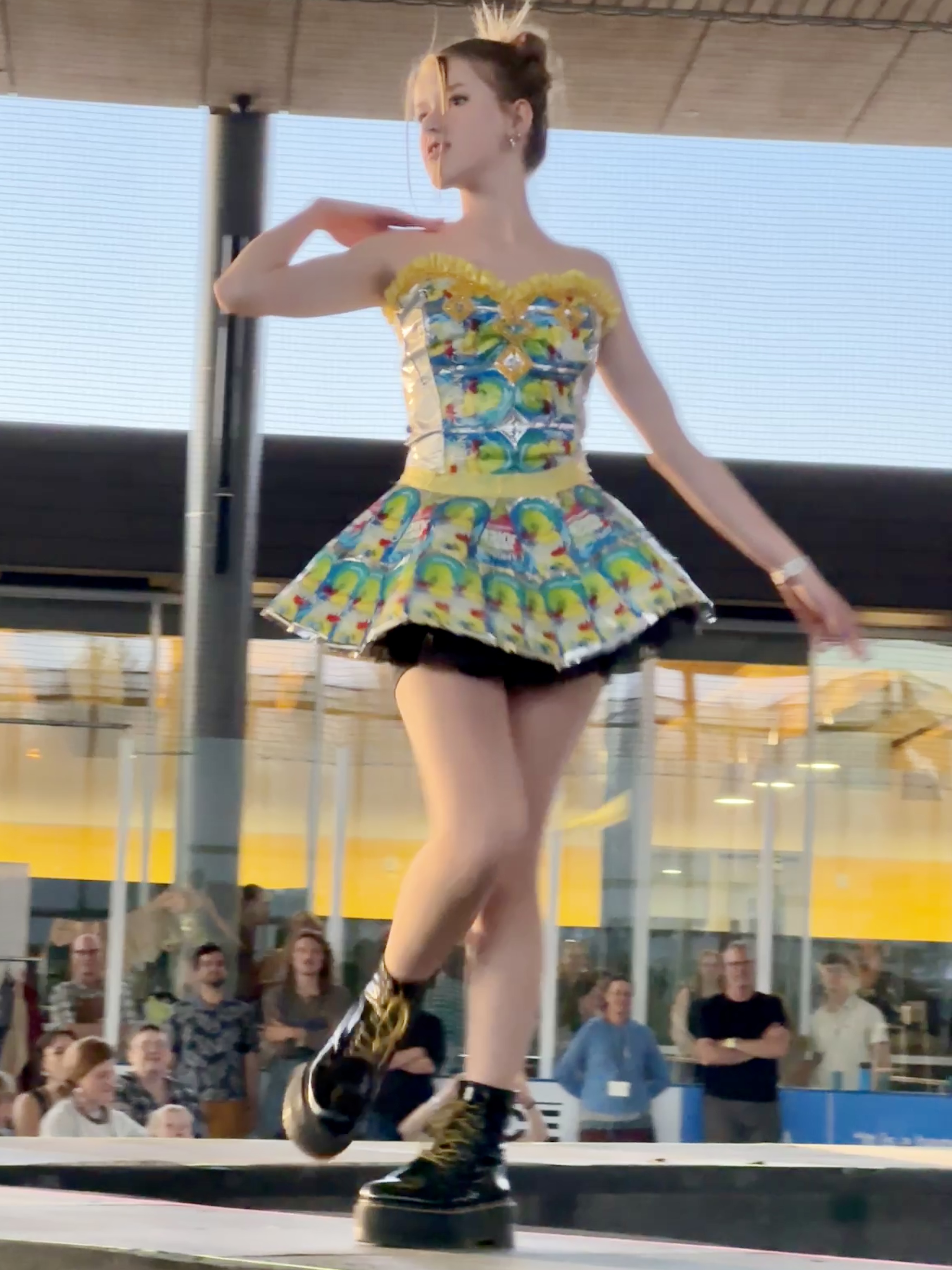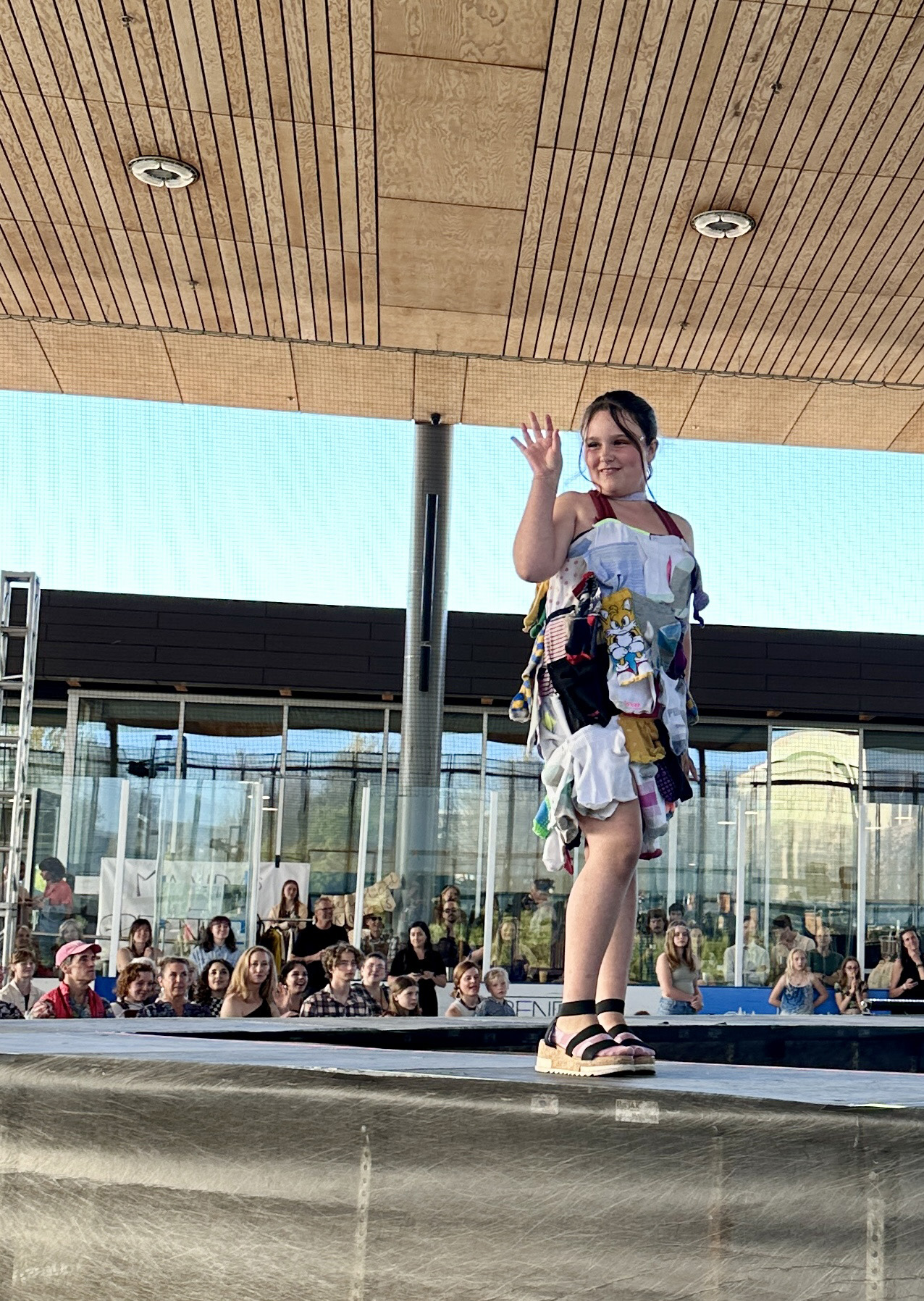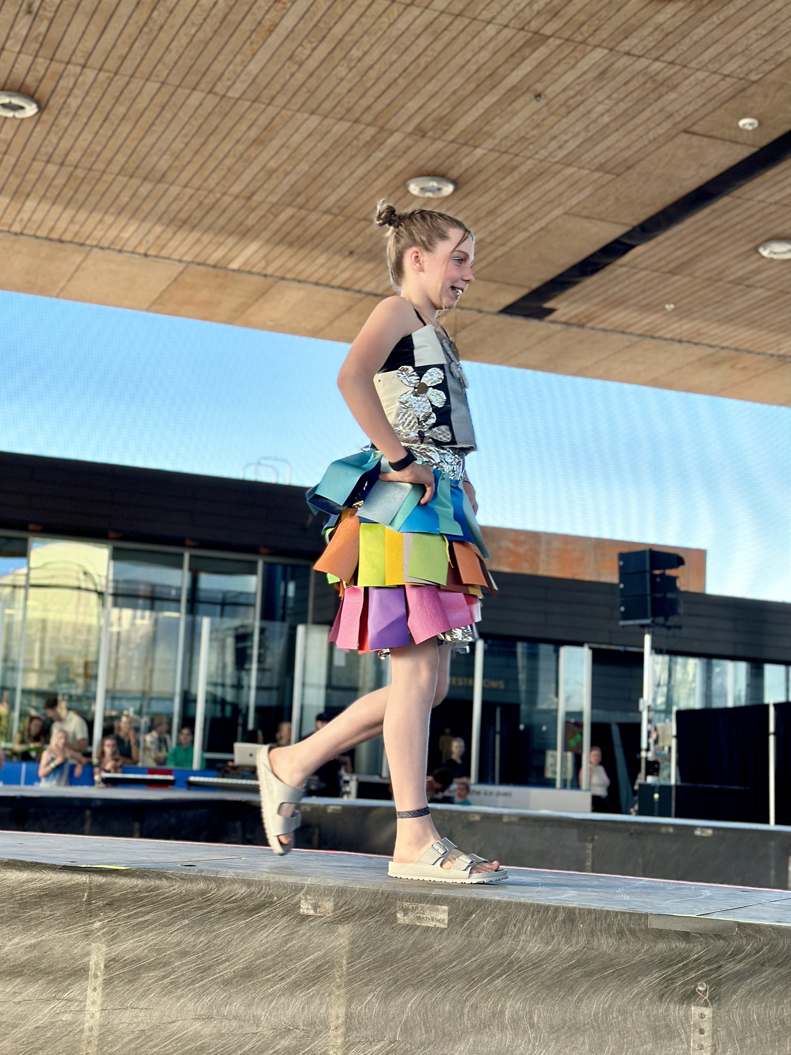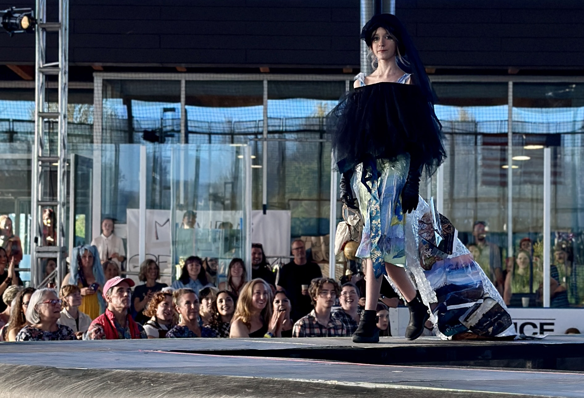 “NOT TRASH BUT TREASURE” Designer: Clara Wirtz Model: Neve Maki Materials: Repurposed old dress, zip ties pulled from the trash, bottle tabs – CASCADE Middle School
