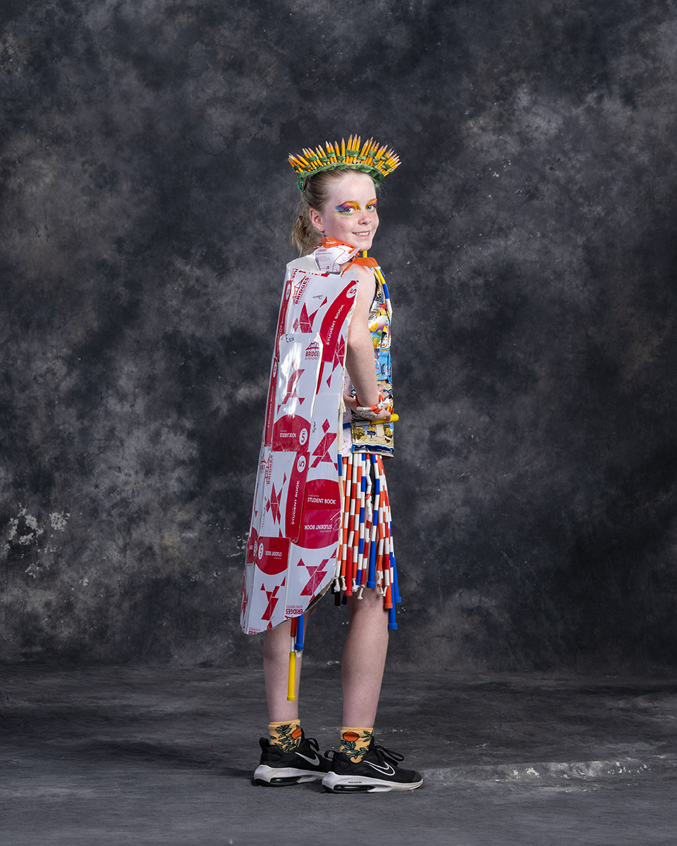 “CARDBOARD BY MIRIAM” Designer/Model: Miriam Wirst Materials: Random garbage, packing paper, cardboard, old undershirt – PINE RIDGE Elementary School