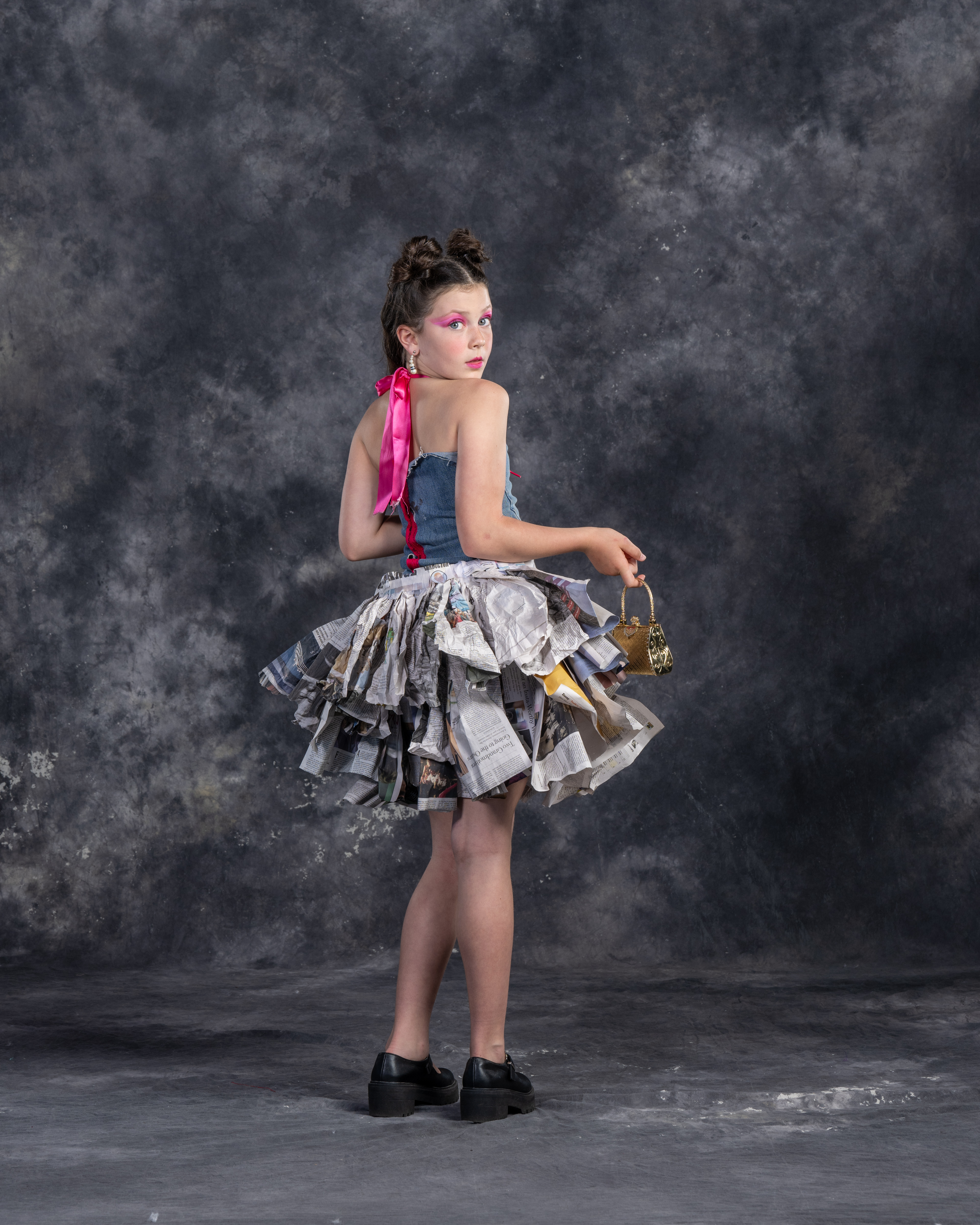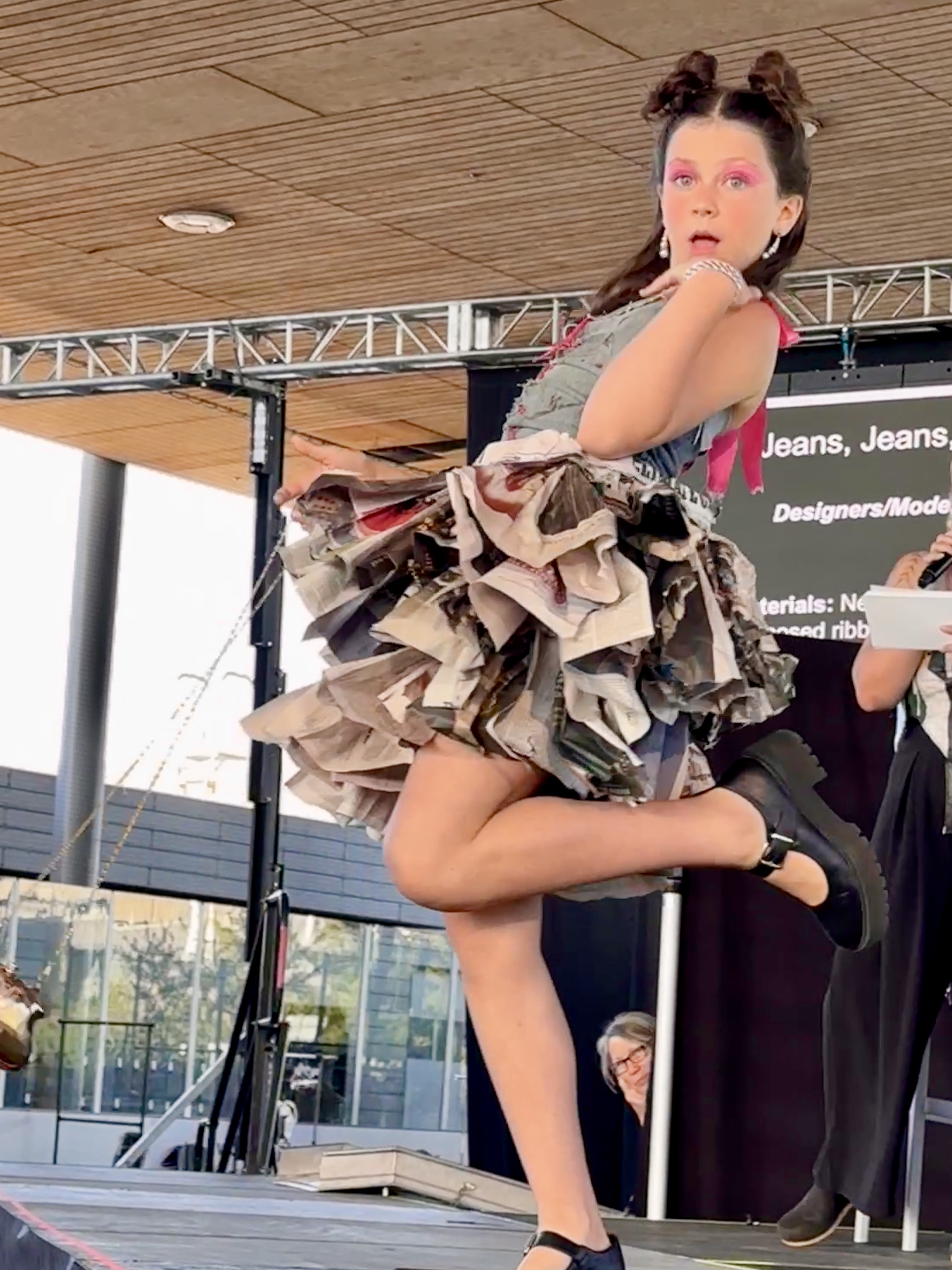 “JEANS, JEANS, READ ALL ABOUT IT! X 2” Designers/Models: Hazel King & Iris Boettcher Materials: thrifted denim, fish skin leather 2nds (cast-off waste products from fish processing), poNewspaper, Old denim, repurposed ribbon & repurposed ribbon, rollerblade lace, old newspaper, upcycled jeansp tab – HIGHLAND Elementary School