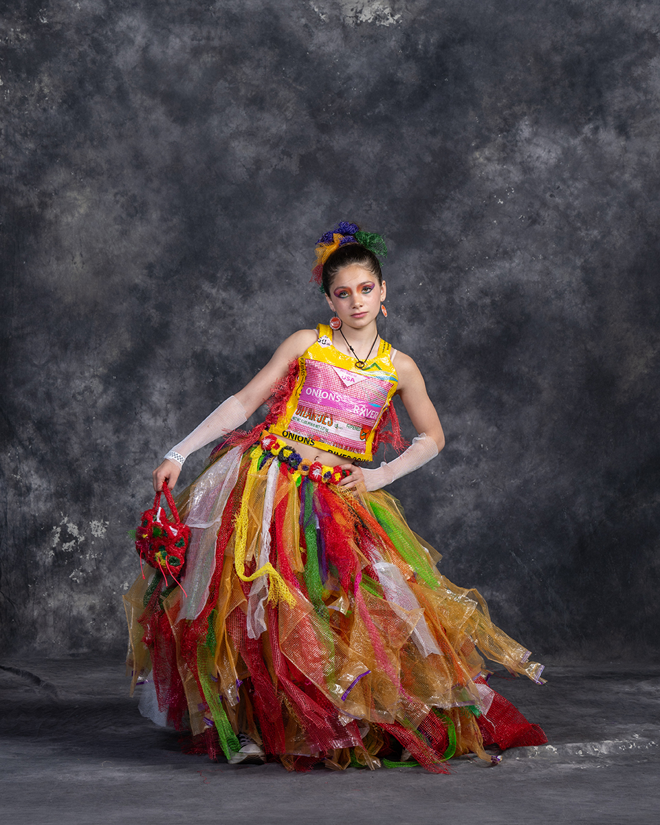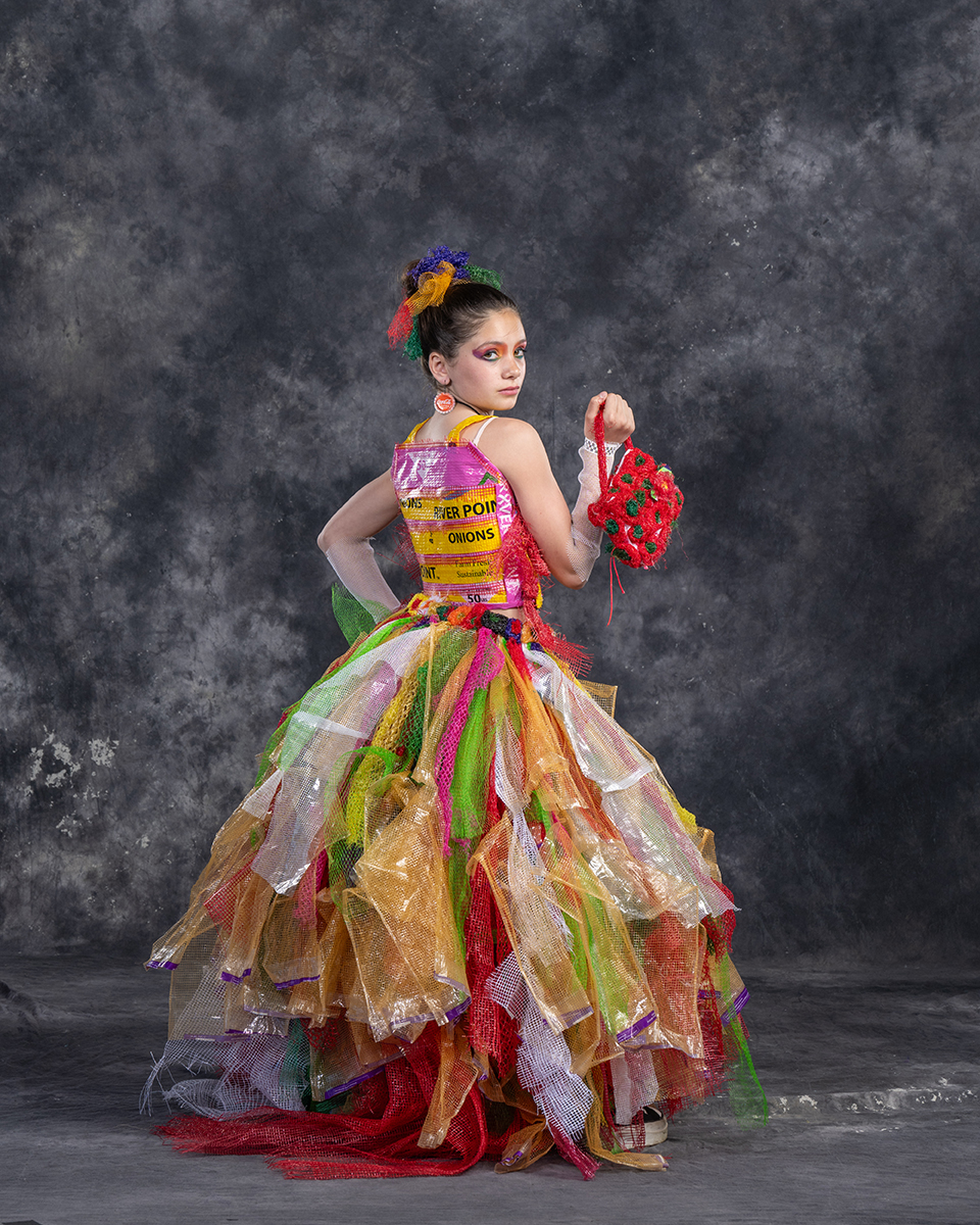 “DON’T MESH WITH MY DRESS” Designer/Model: Samantha (Sam) Press Materials: Fruit and vegetable mesh bags provided by Grandpa Frank who works at the Grass Valley Food Bank – AMITY CREEK Elementary School