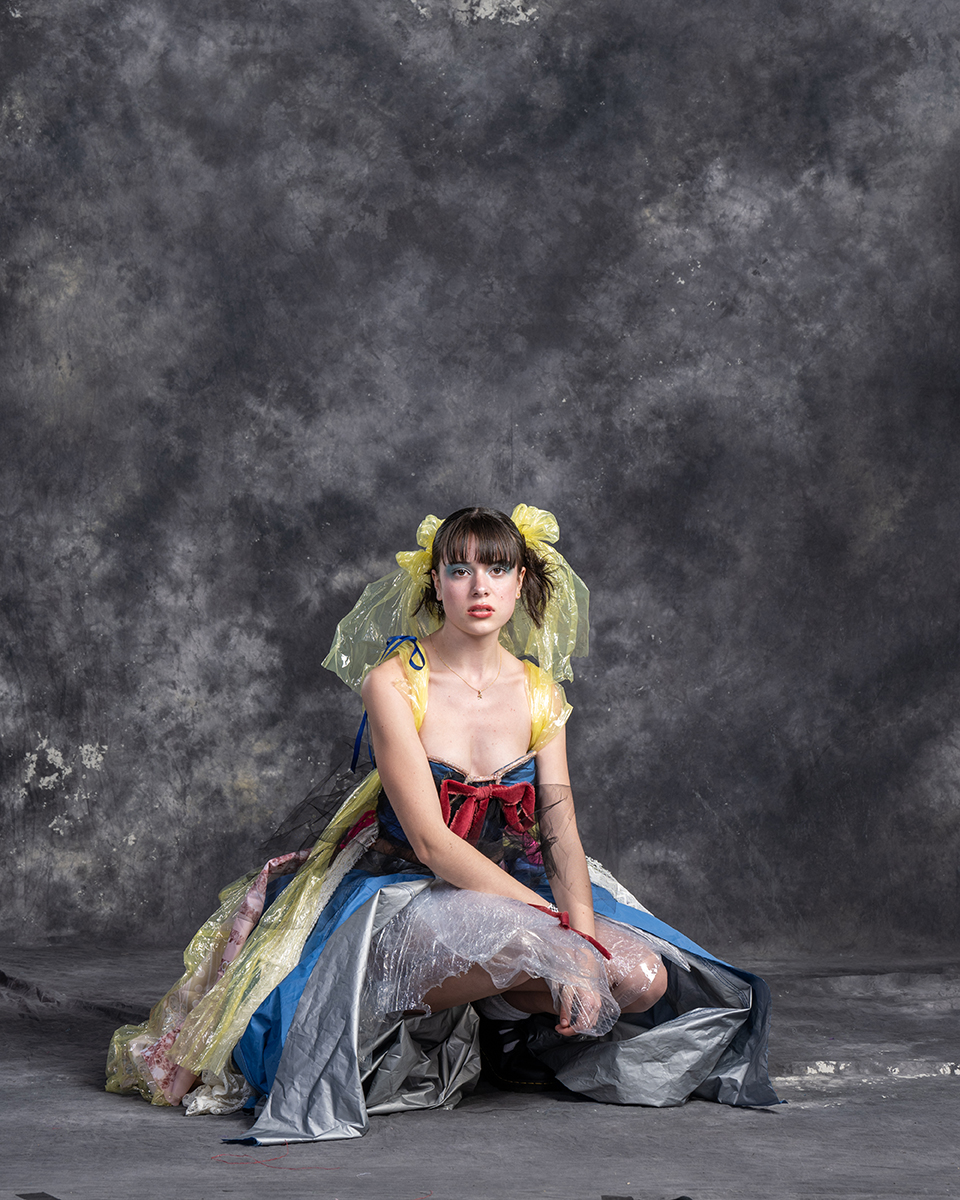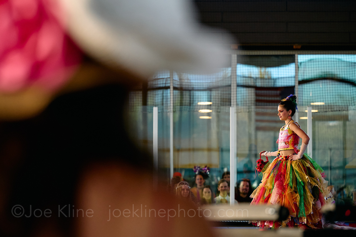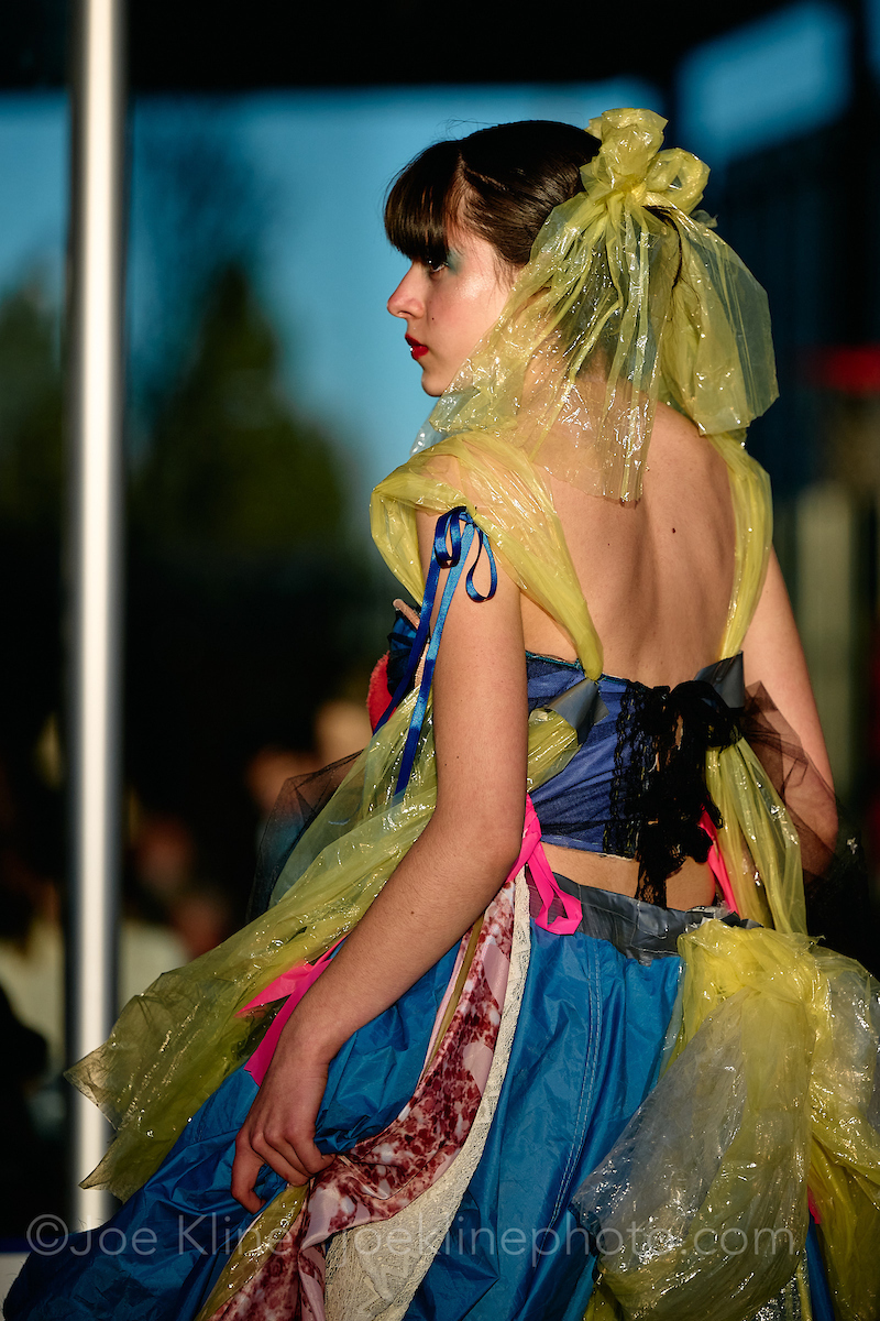“JUST A GIRL” Designers: Delphine Porter, Jadie Whitticar Model: Delphine Porter Materials: Old tarp, cargo plastic, dental fabric bound for the landfill, reused tulle, old binders, reused ribbon – REALMS High School