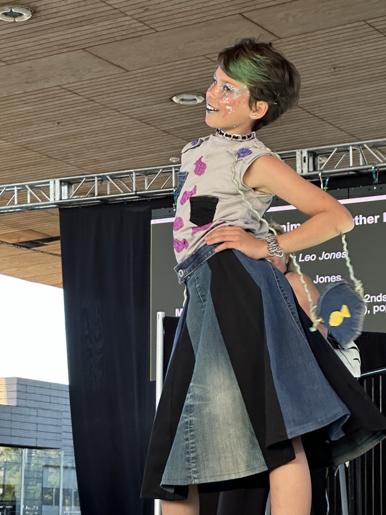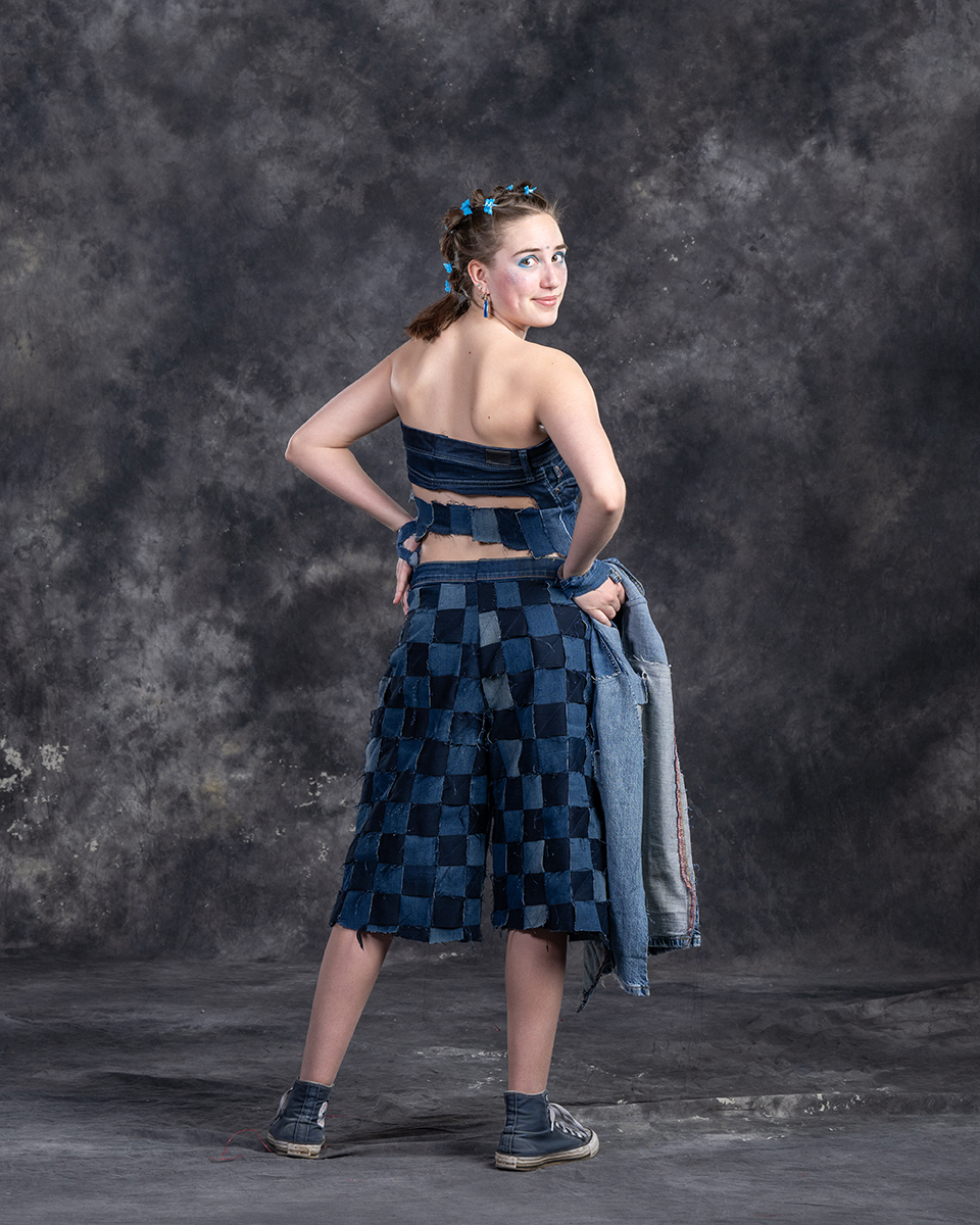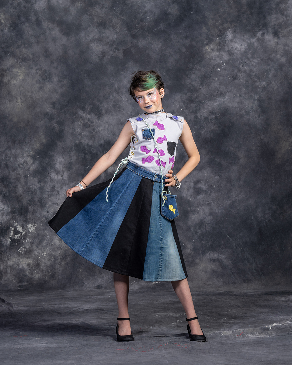 “RETRO REVIVAL: DENIM AND LEATHER DREAM” Designer: Leo Jones Model: Fern Jones Materials: thrifted denim, fish skin leather 2nds (cast-off waste products from fish processing), pop tab – PACIFIC CREST Middle School