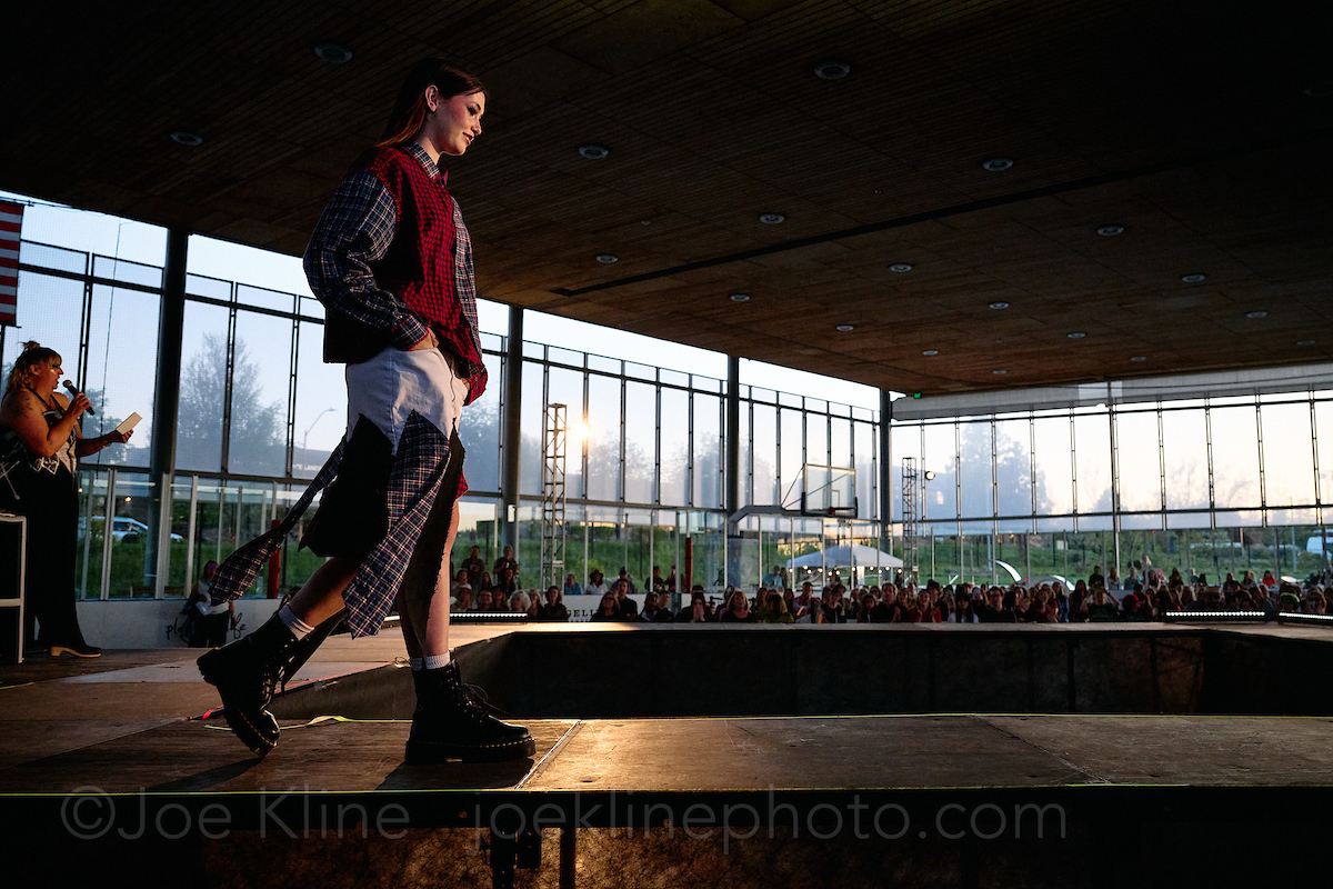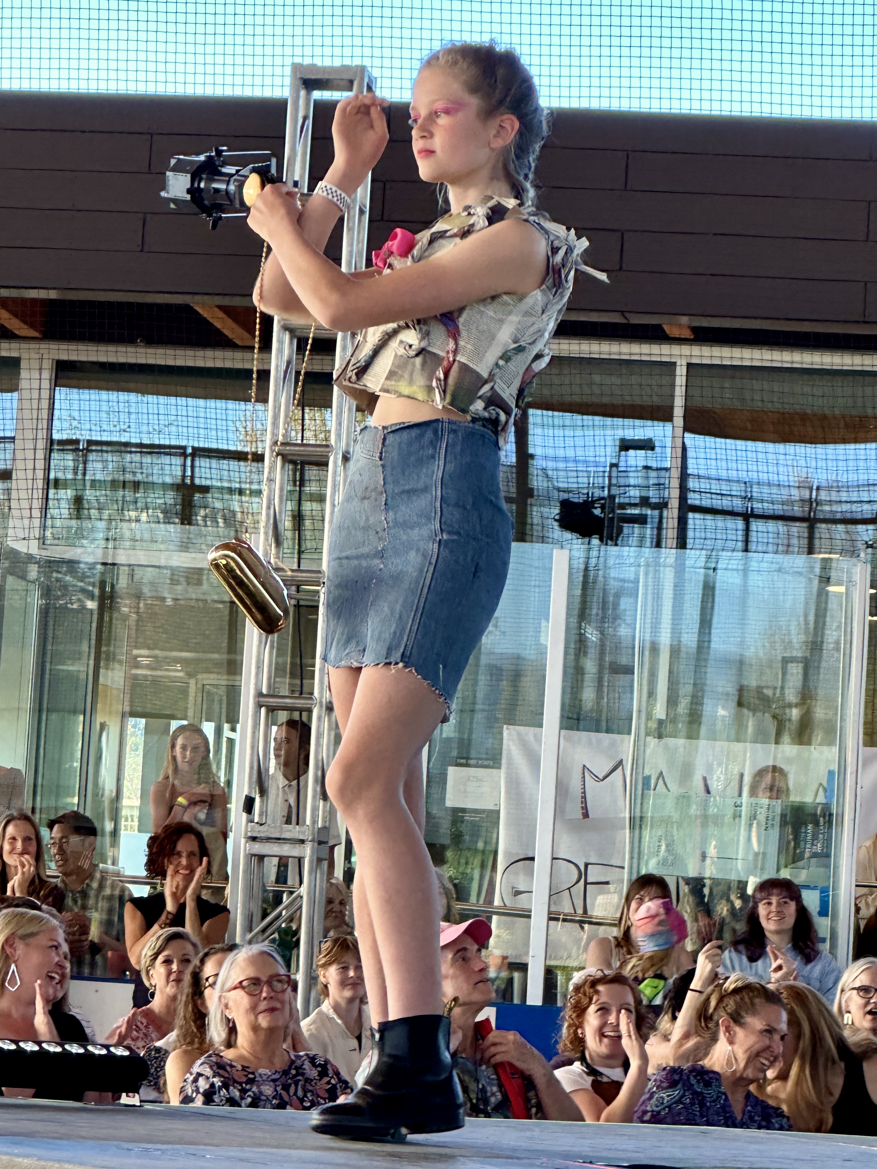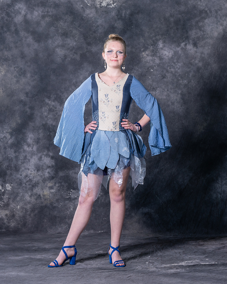 “RETRO REVIVAL: DENIM AND LEATHER DREAM” Designer: Leo Jones Model: Fern Jones Materials: thrifted denim, fish skin leather 2nds (cast-off waste products from fish processing), pop tab – PACIFIC CREST Middle School