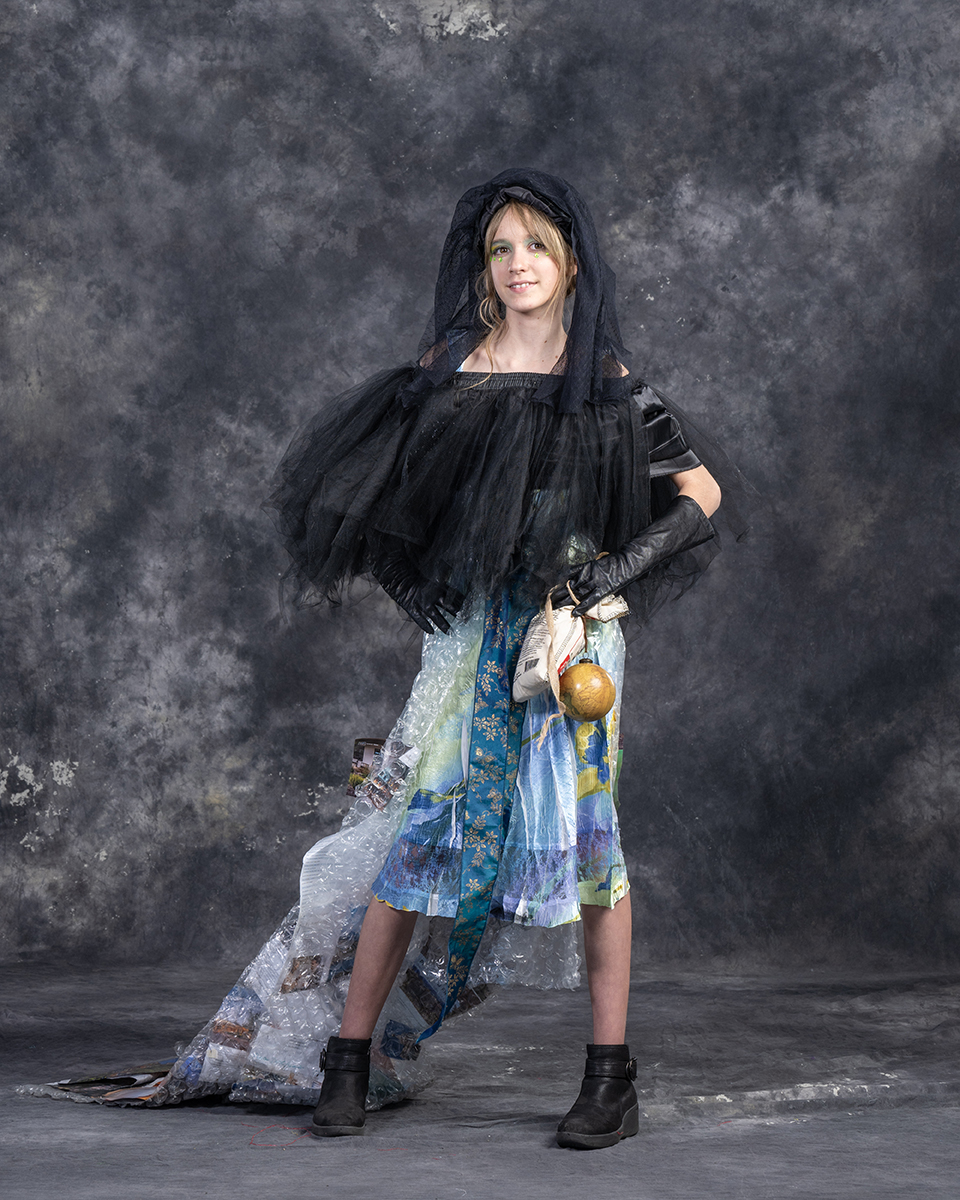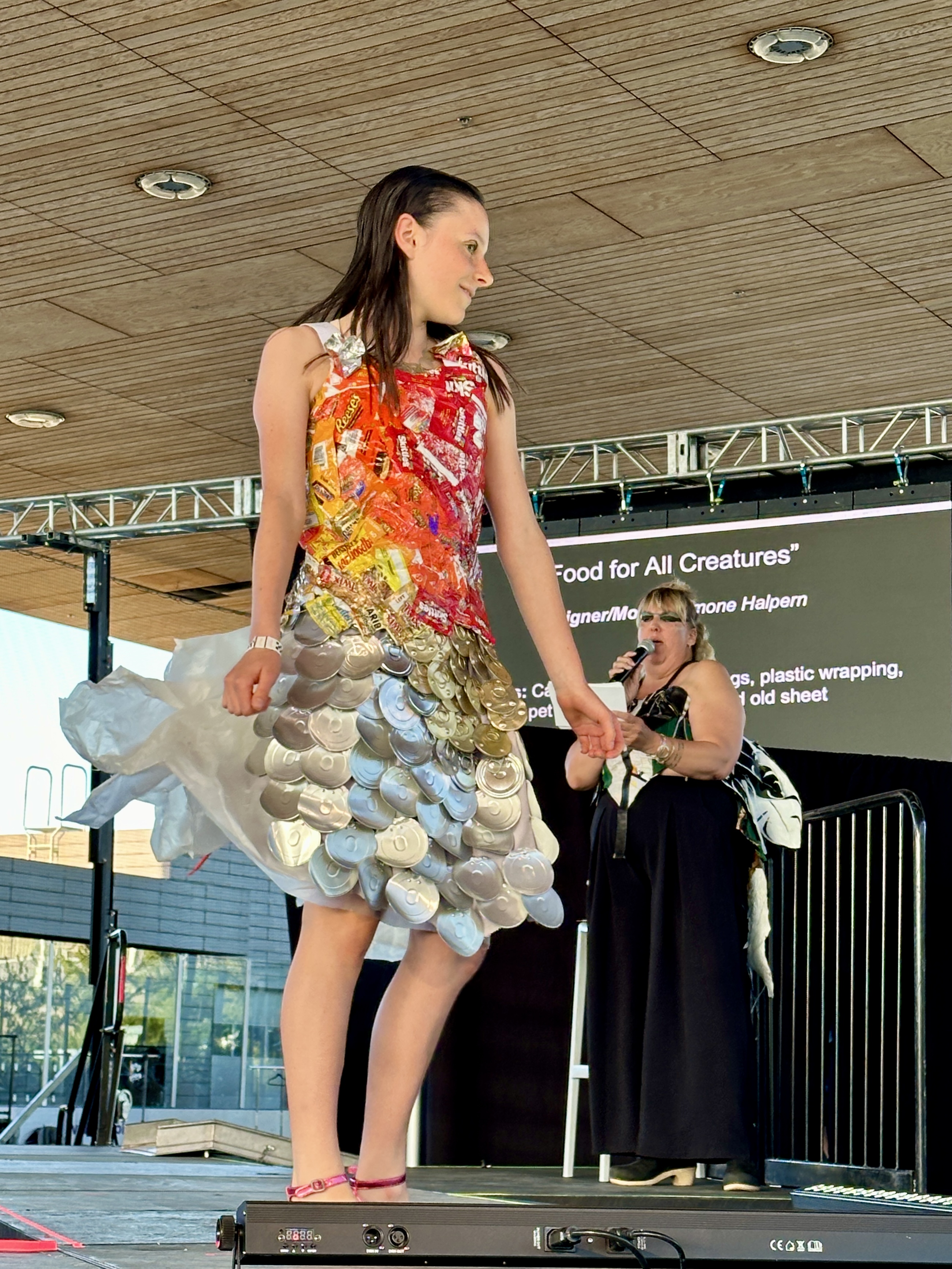 “FOOD FOR ALL CREATURES” Designer/Model: Simone Halpren Materials: Candy wrappers, feed bags, plastic wrapping, pet food can lids, discarded old sheet – REALMS Middle School