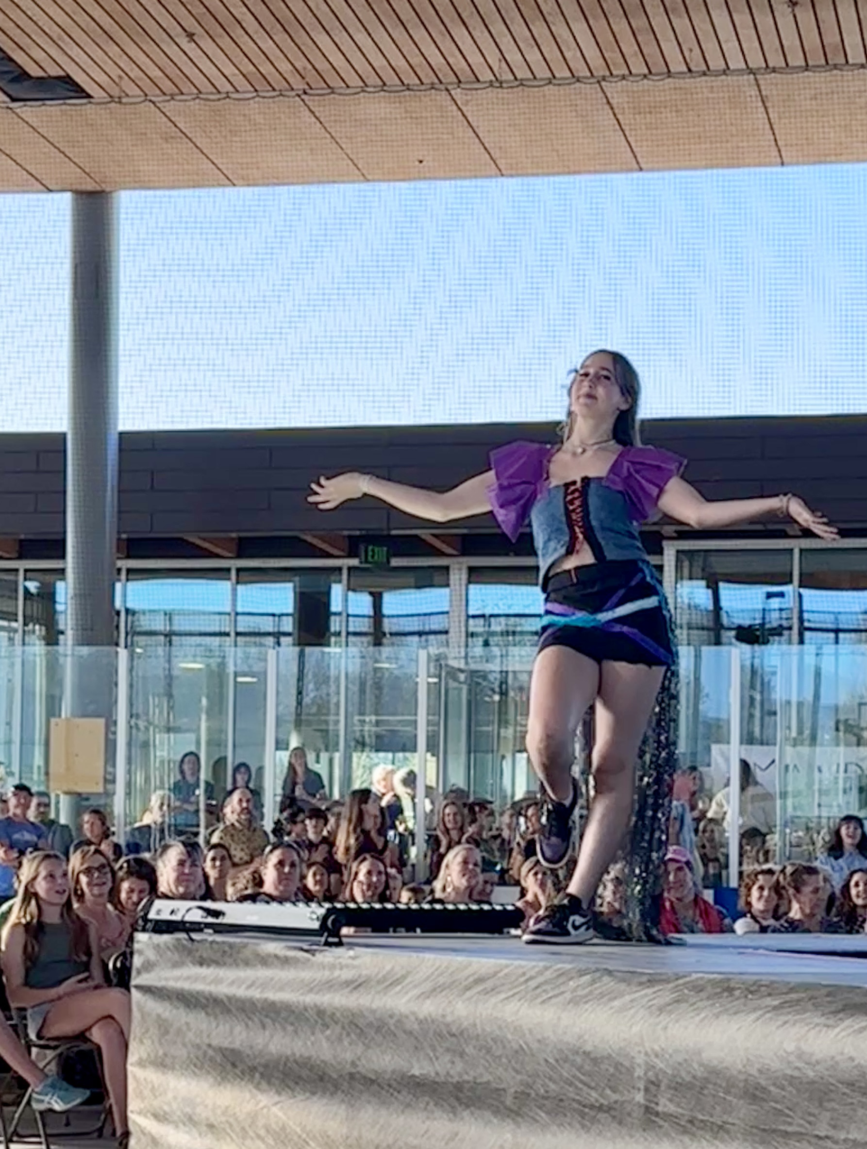 “BACK TO THE 90s” Designer/Model: Jasper Heisinger Materials: Repurposed old concert cape, old zippers, repurposed jean shorts, old breaker jacket repurposed pink skirt from Halloween – OBSIDIAN Middle School