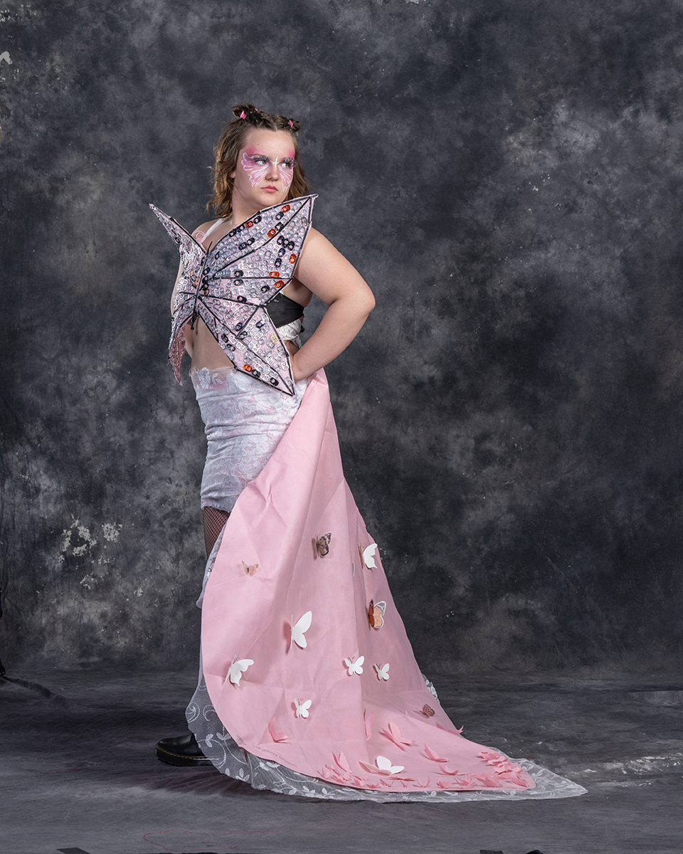 “FEATHERED FREEDOM” Designer/Model: Holly Rustand Materials: repurposed old jeans, old curtains, old pillows, reused old clear tarp – REALMS High School