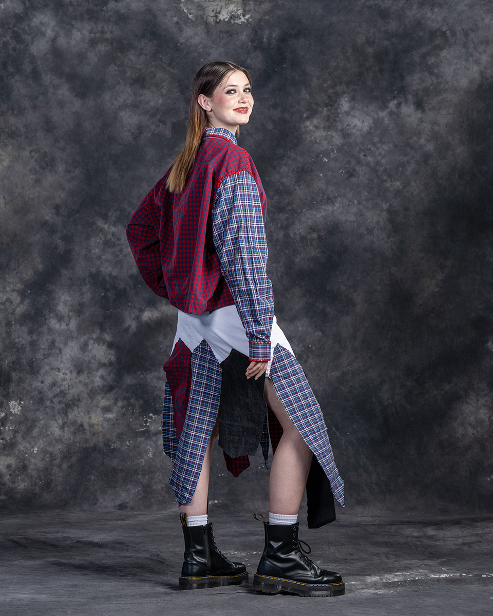 “INTERTWINED” Designer/Model: Payton Mabbutt Materials: Red Plaid Flannel, Blue Plaid Flannel, White Jeans, Black Jeans from friends; Old Friendship Bracelet string collected friends and summer camp, Old Preowned Ribbon – CALDERA High School