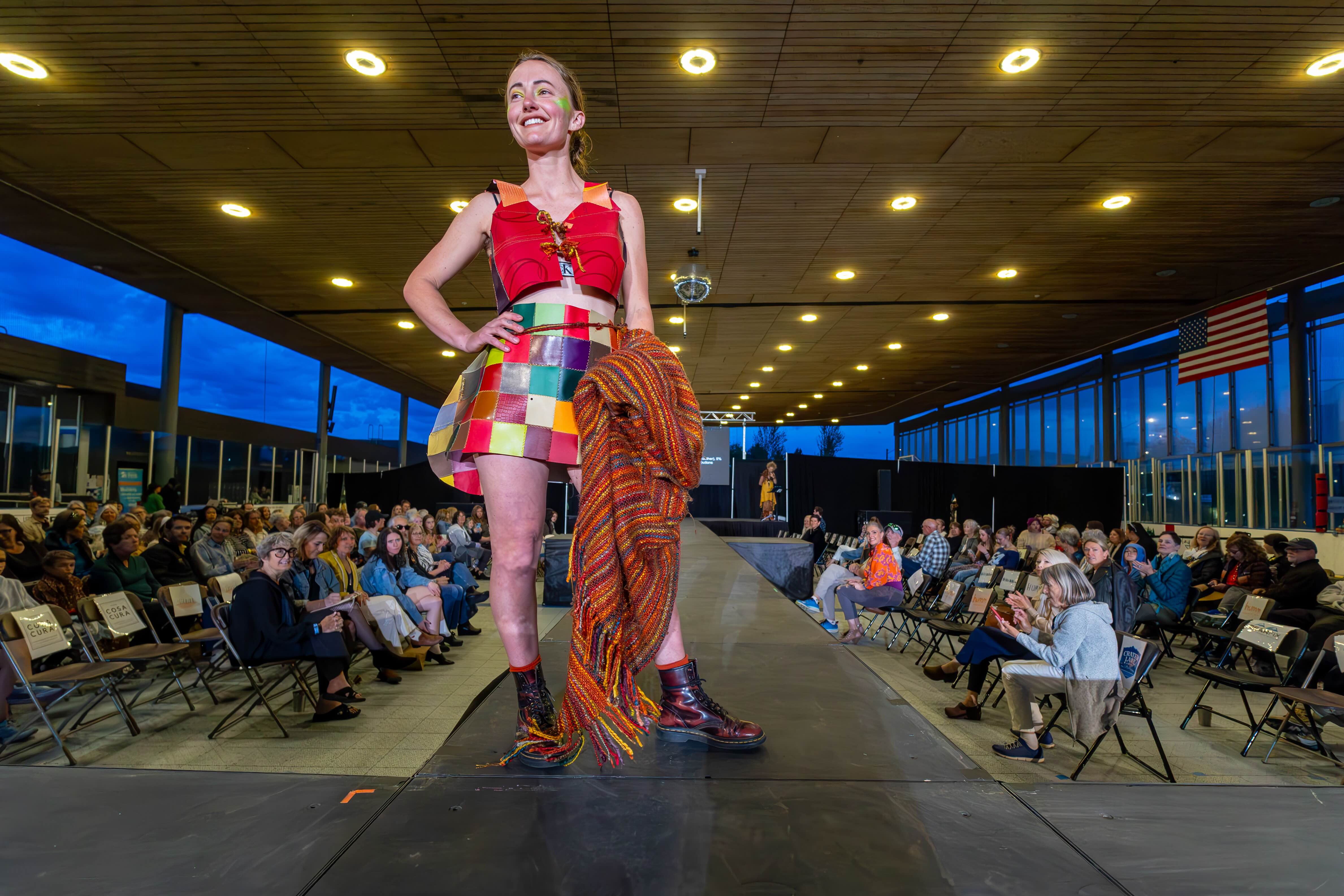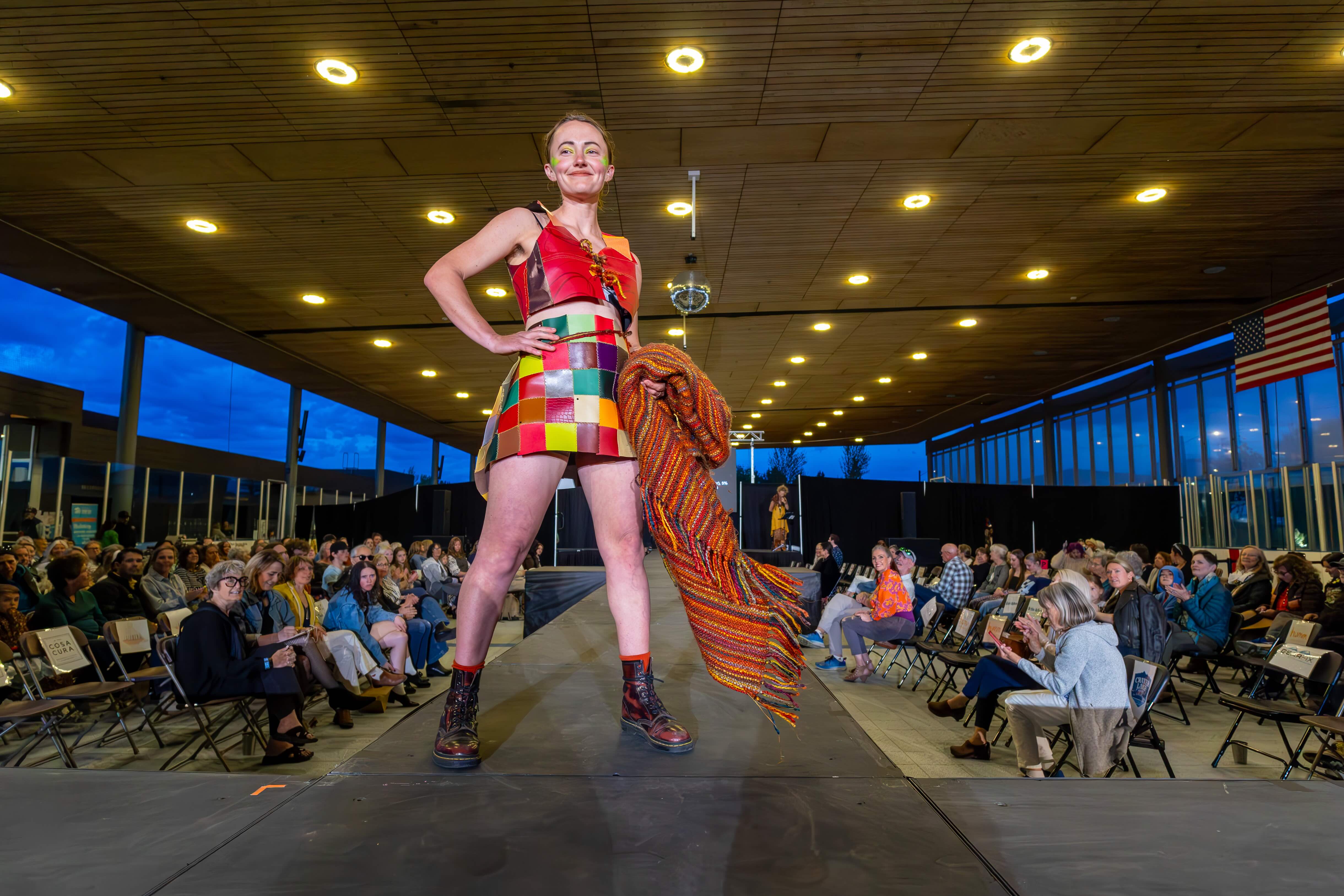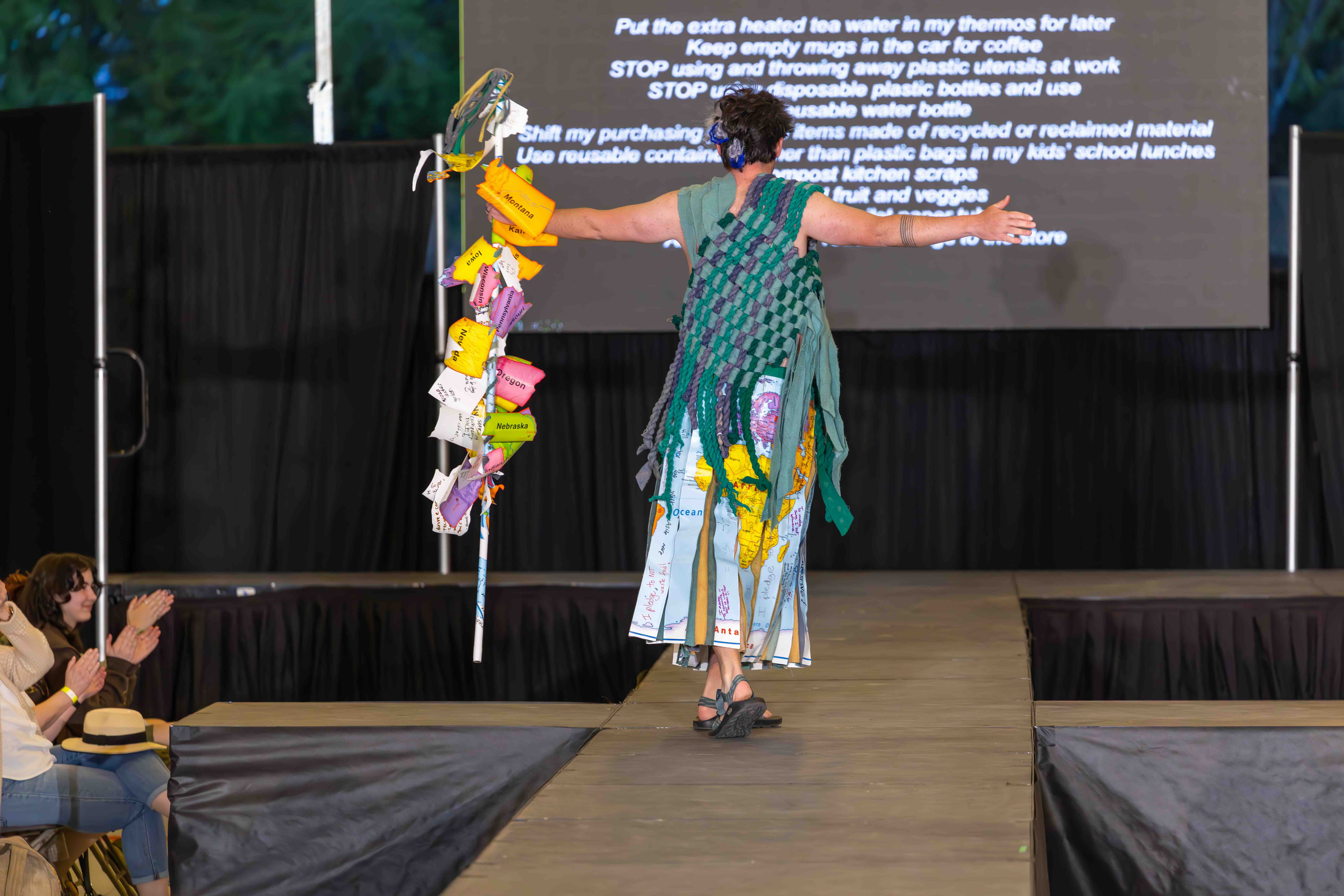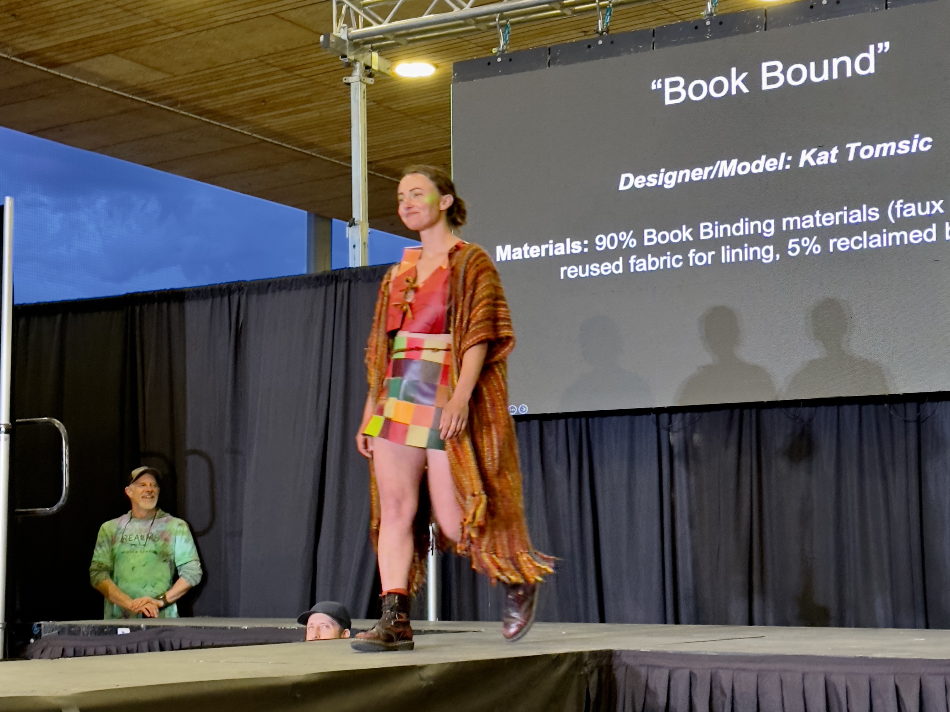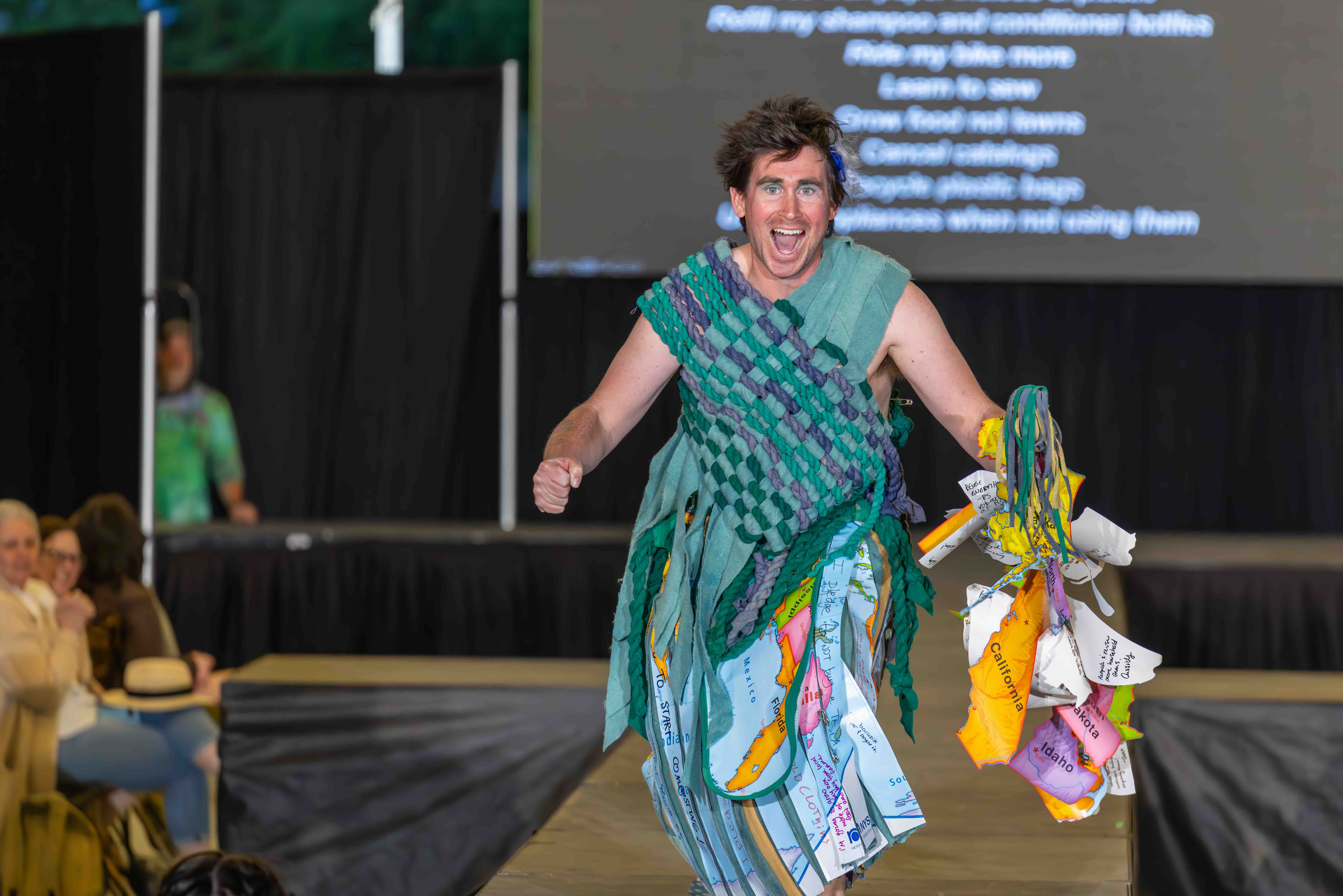 COMMUNITY GARMENT – INTERTWINED Designers: Bend Community, Realms HS students and Rubbish Renewed Council Model: Ian White (REALMS Teacher) Materials: twined wool from an old braided rug and a classroom map headed for the trash bin Garment Description: Each year we ask members of our community to be a part of what hits the runway through our community garment. We asked you to write your pledge to help the environment on each part and then wove them into what you see today. Made from twined wool from an old braided rug and a classroom map headed for the trash bin, we remind ourselves of our connection to each other and the world with this year’s piece, “Intertwined”.