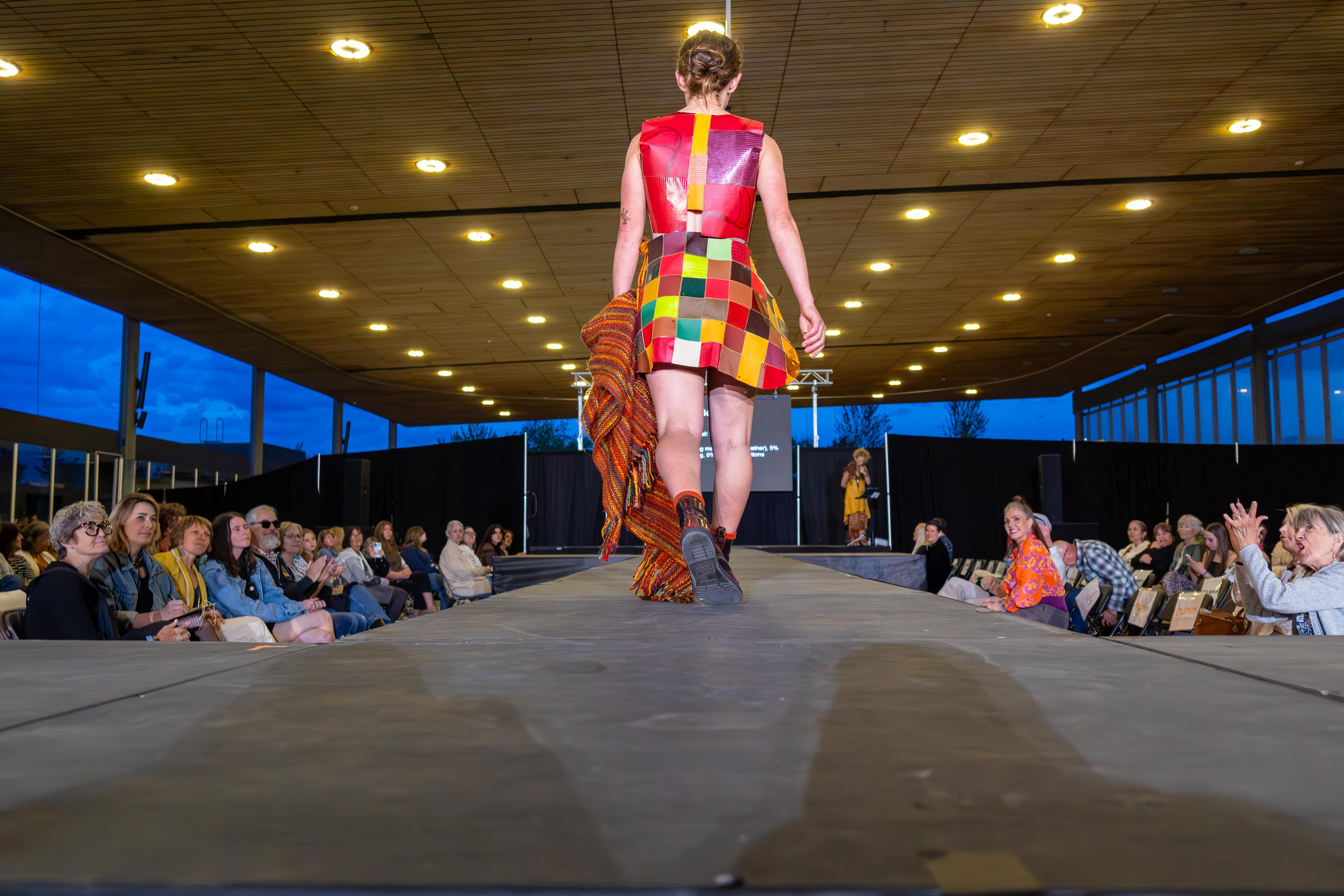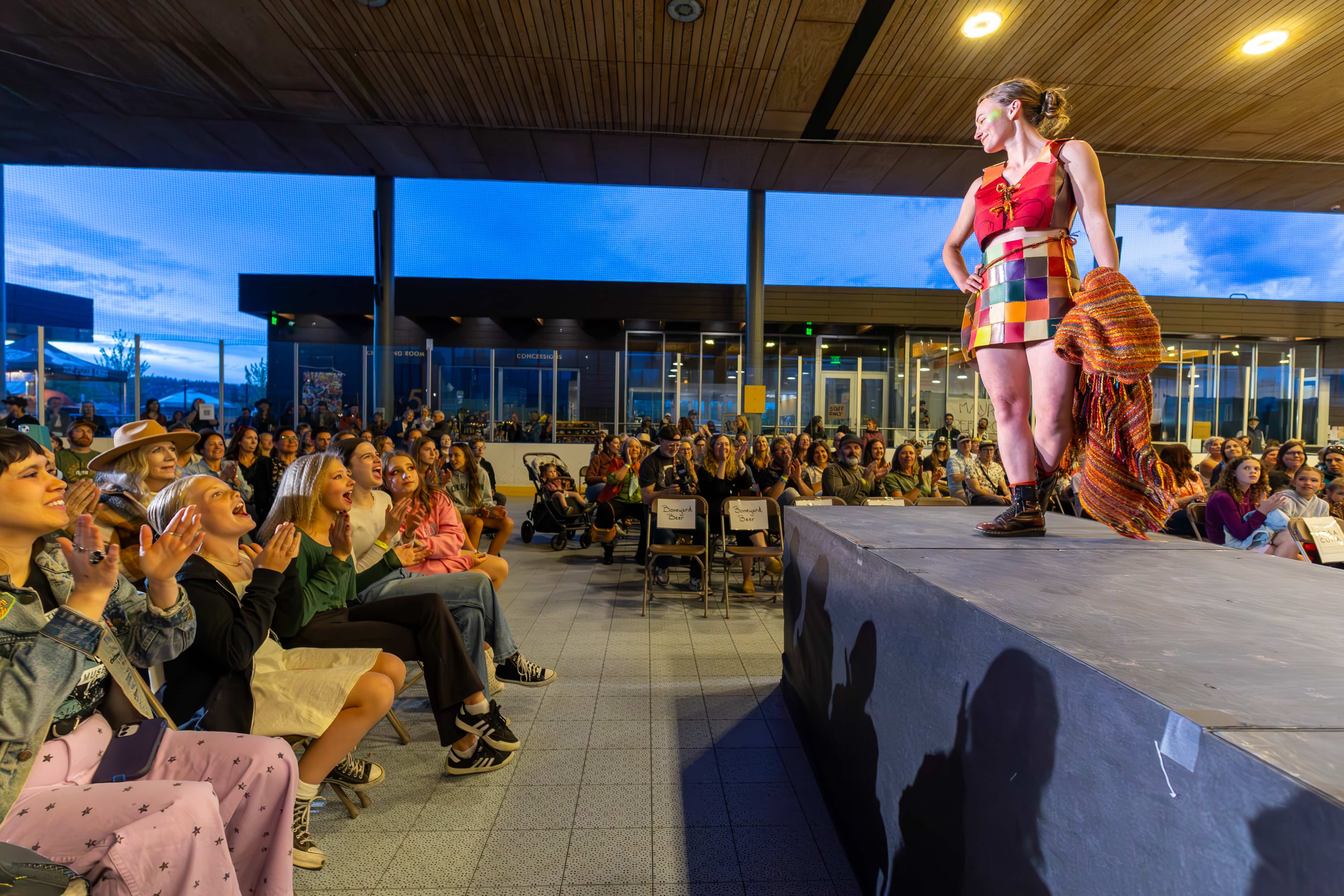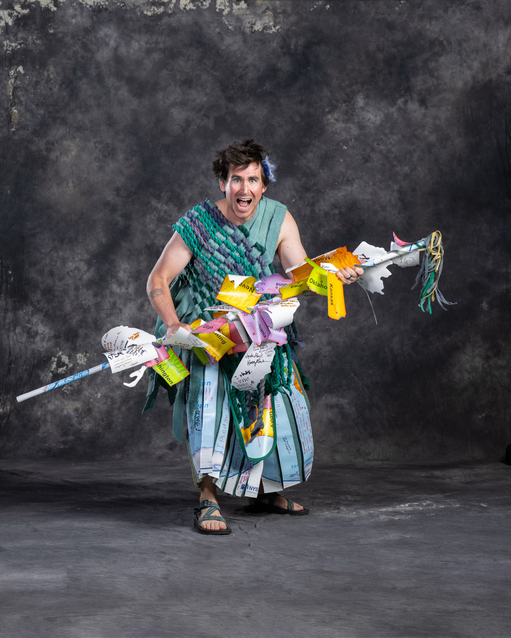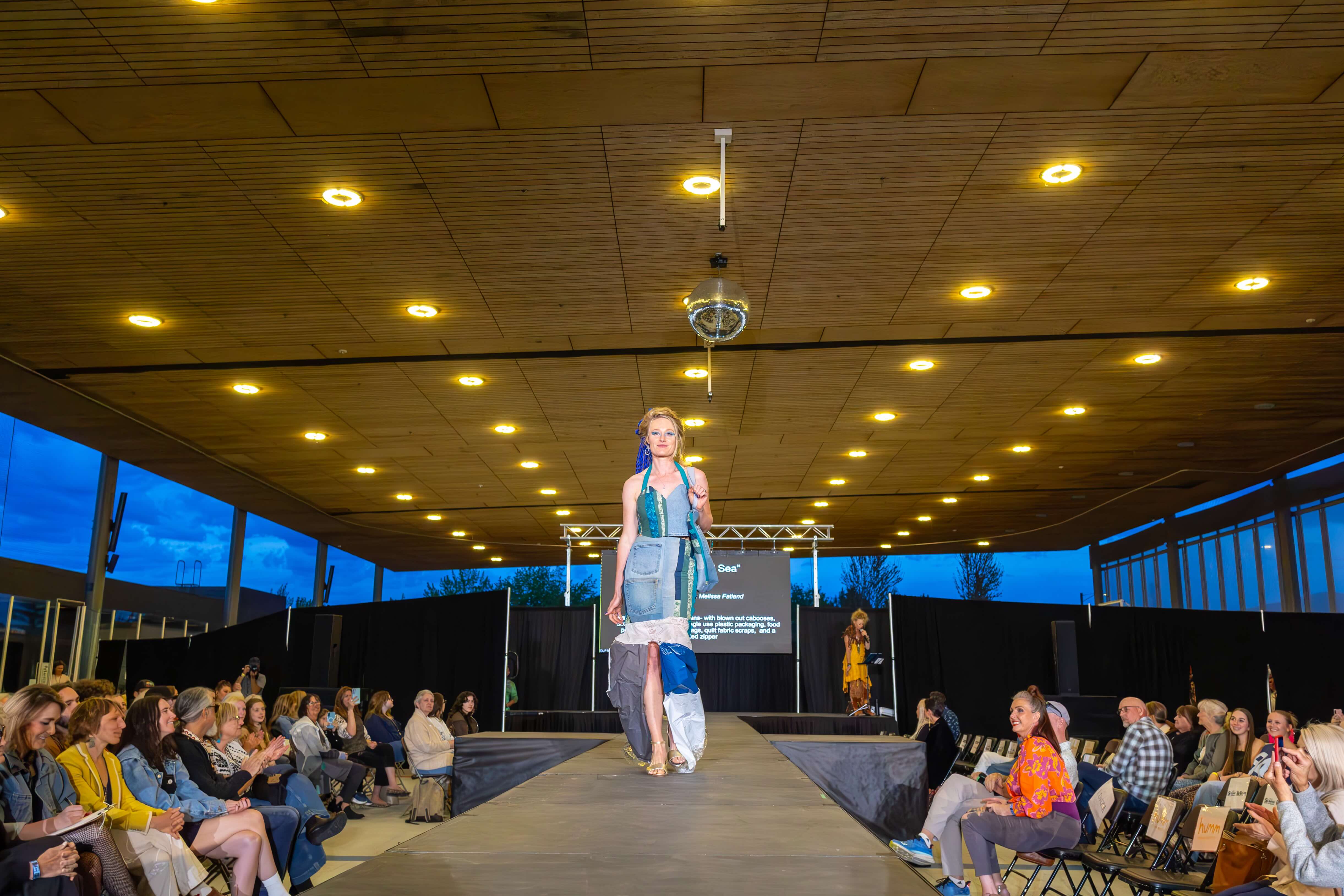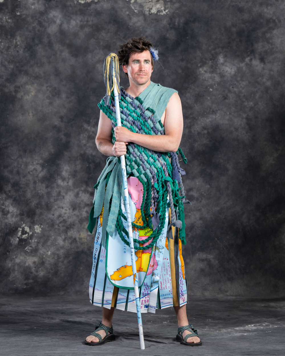 COMMUNITY GARMENT – INTERTWINED Designers: Bend Community, Realms HS students and Rubbish Renewed Council Model: Ian White (REALMS Teacher) Materials: twined wool from an old braided rug and a classroom map headed for the trash bin Garment Description: Each year we ask members of our community to be a part of what hits the runway through our community garment. We asked you to write your pledge to help the environment on each part and then wove them into what you see today. Made from twined wool from an old braided rug and a classroom map headed for the trash bin, we remind ourselves of our connection to each other and the world with this year’s piece, “Intertwined”.