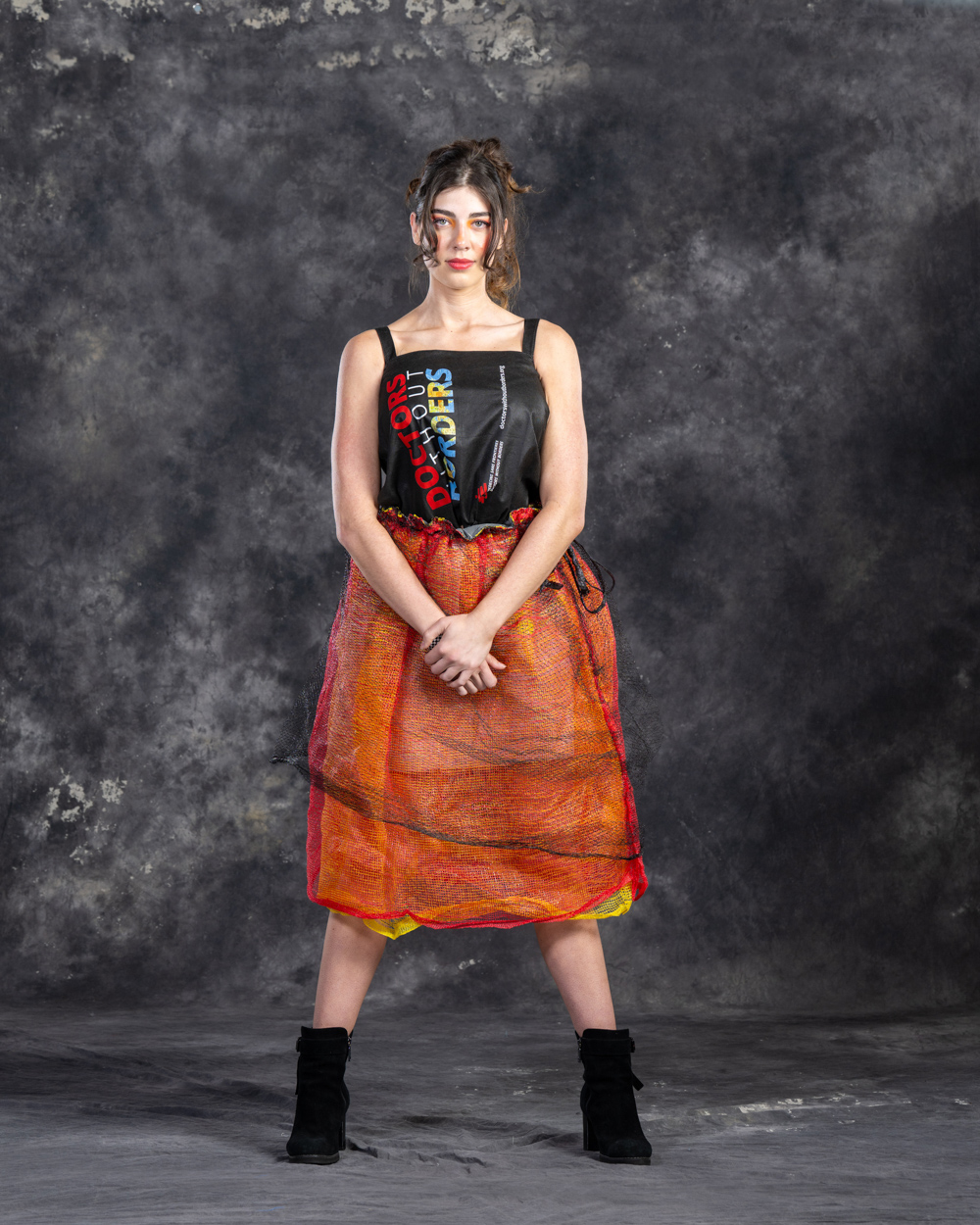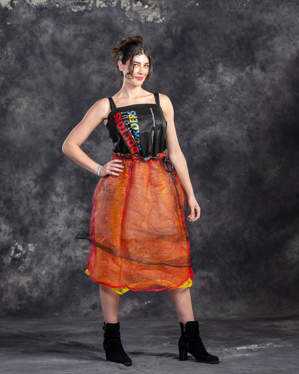 “A PROPER BAG LADY” Designer: Lloyd McMullen Model: Mikayla Gil Materials: Net peanut and produce bags, upcycled thread. Garment Description: This piece was inspired by Amity Creek student, Sam Press’ entry last year using net and mesh bags. As I cannot seem to throw anything that seems useful away, these bags jumped out in search of a party. Thus was born A Proper Bag Lady!