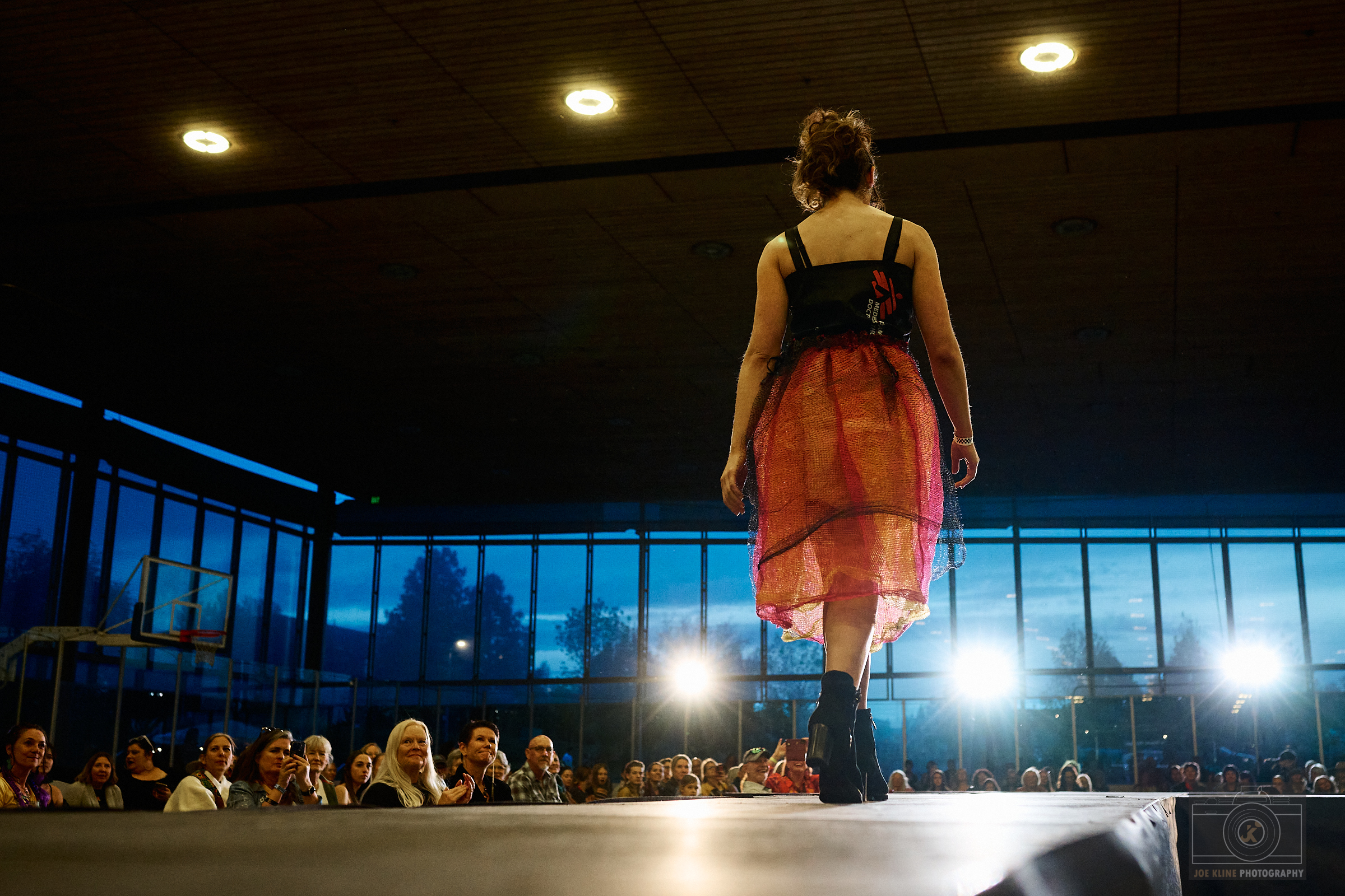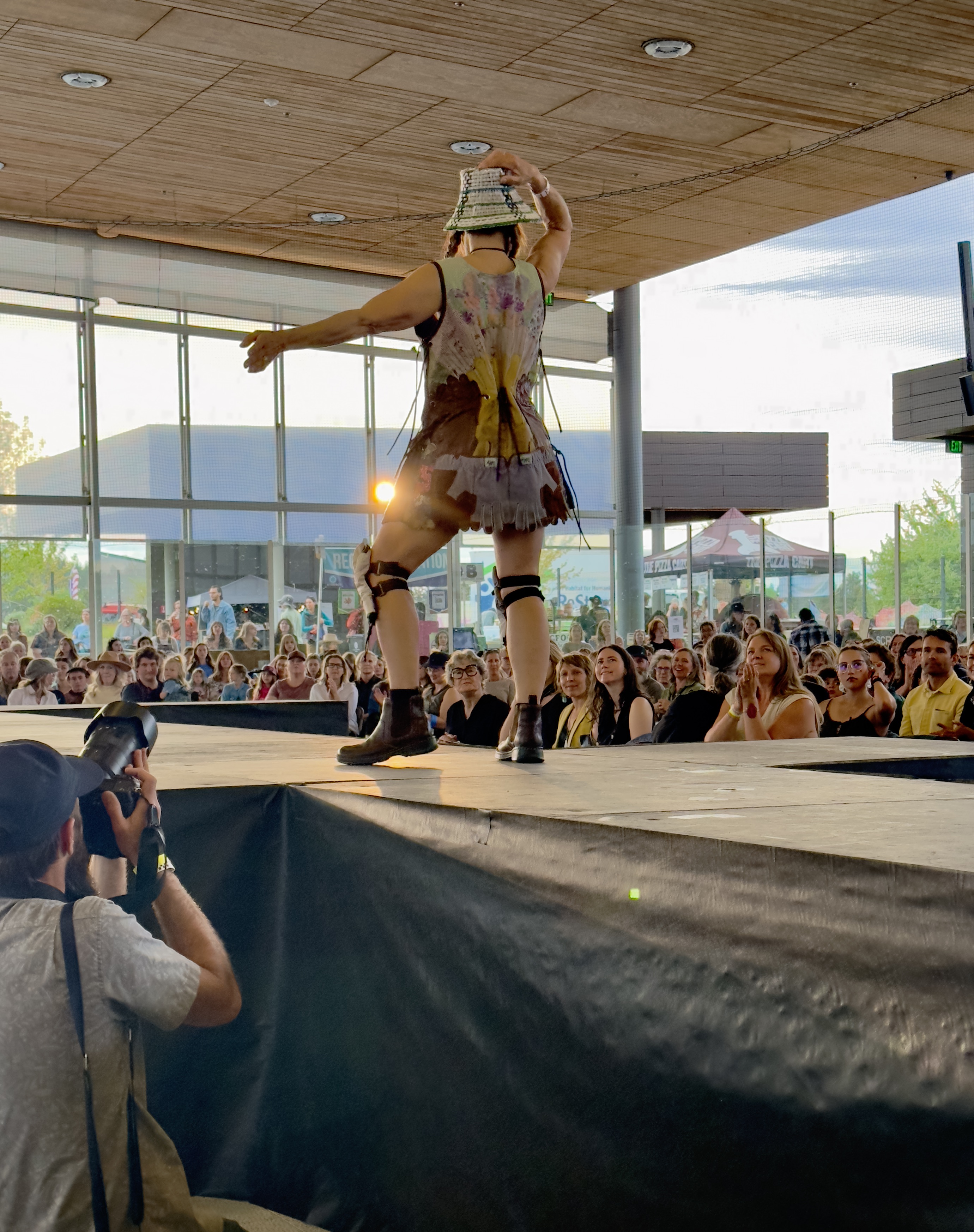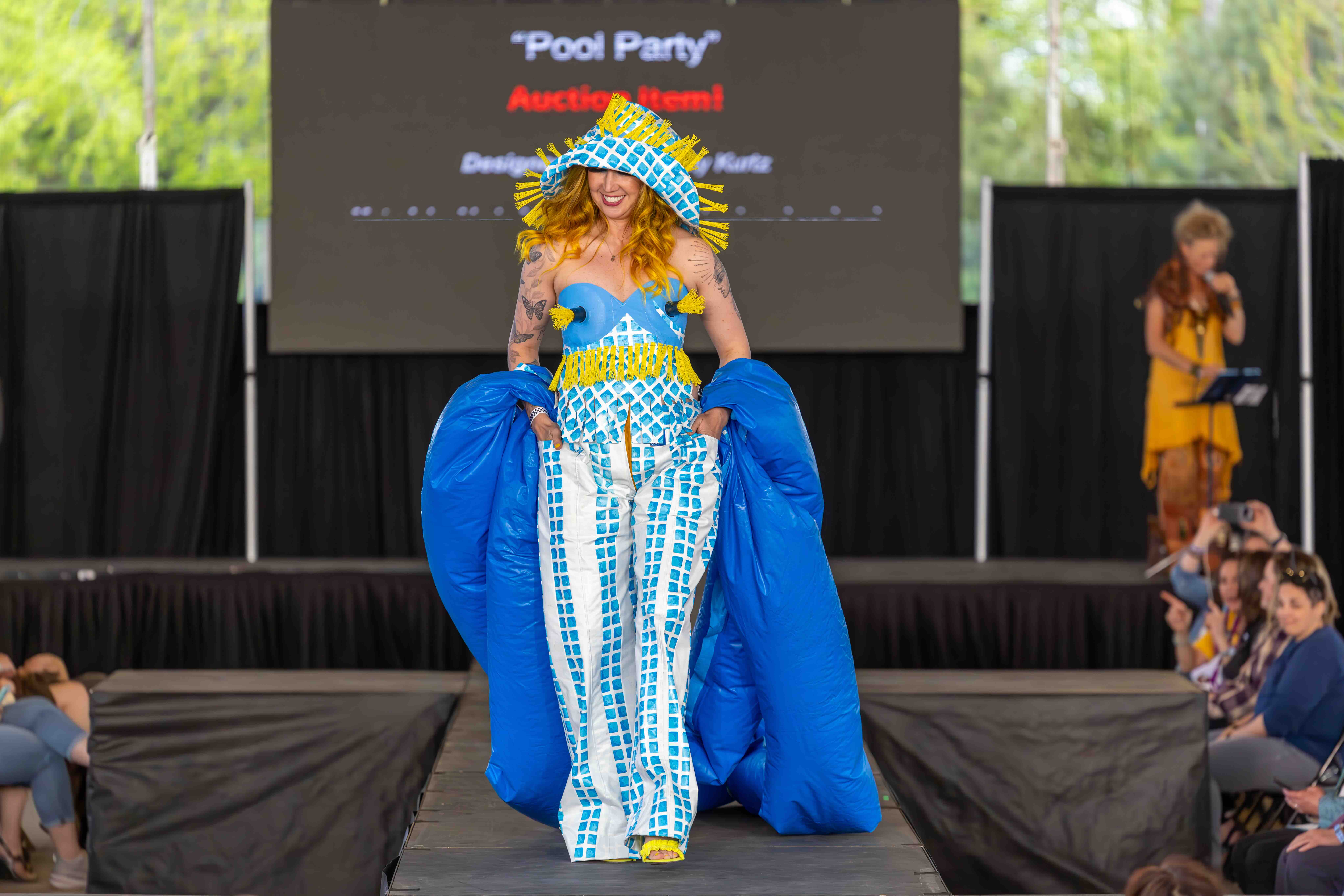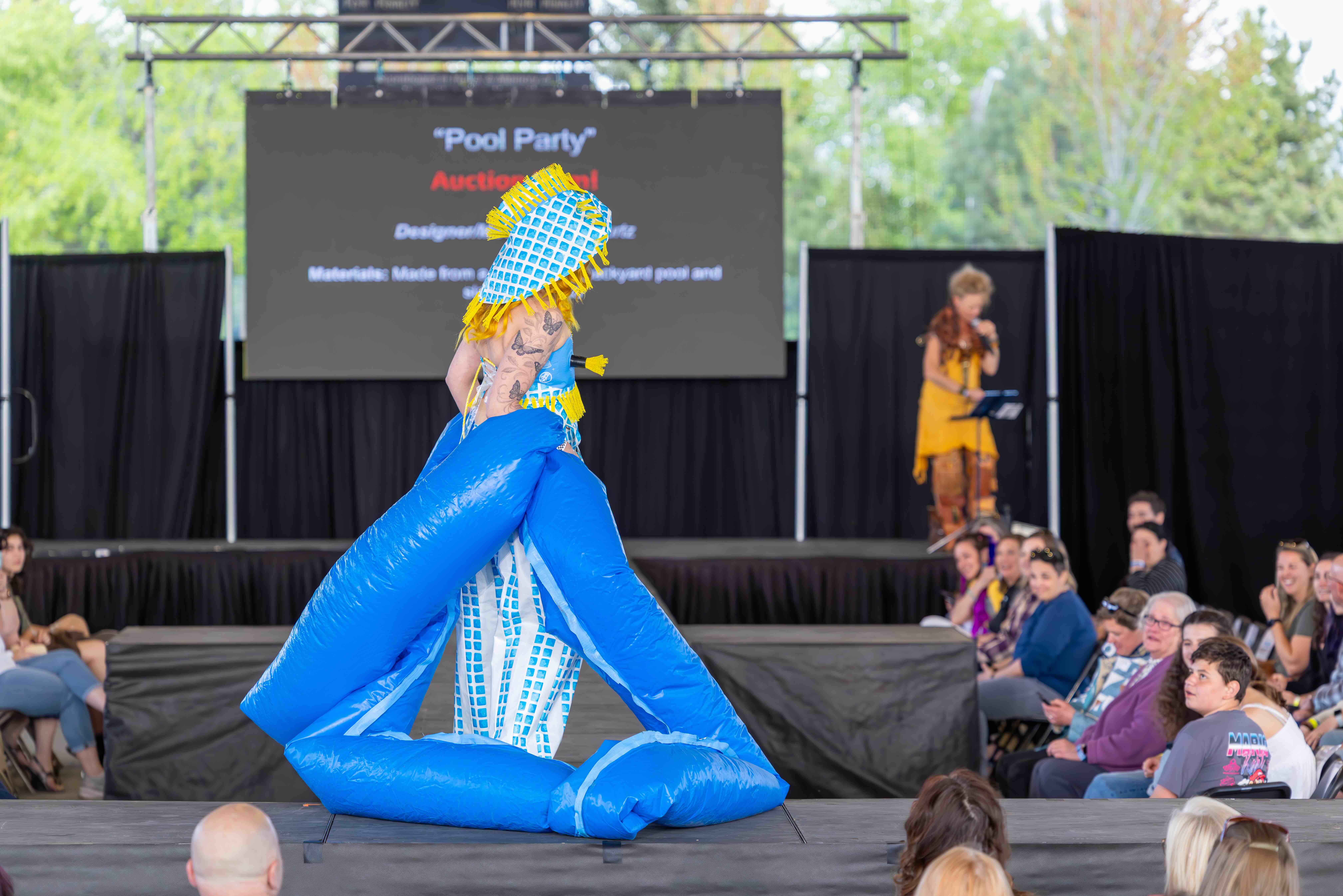“POOL PARTY” Designer/Model: Qristy Kurtz Materials: Made from a plastic/vinyl backyard pool and standard thread Garment Description: Pool Party is a commentary on water conservation. Swim in the Deschutes instead! Made from a leaky backyard pool that may have collapsed and flooded more than once, Pool Party hopes to inspire consumer consideration of the quantity and sources of the water you use! – Auction Item!