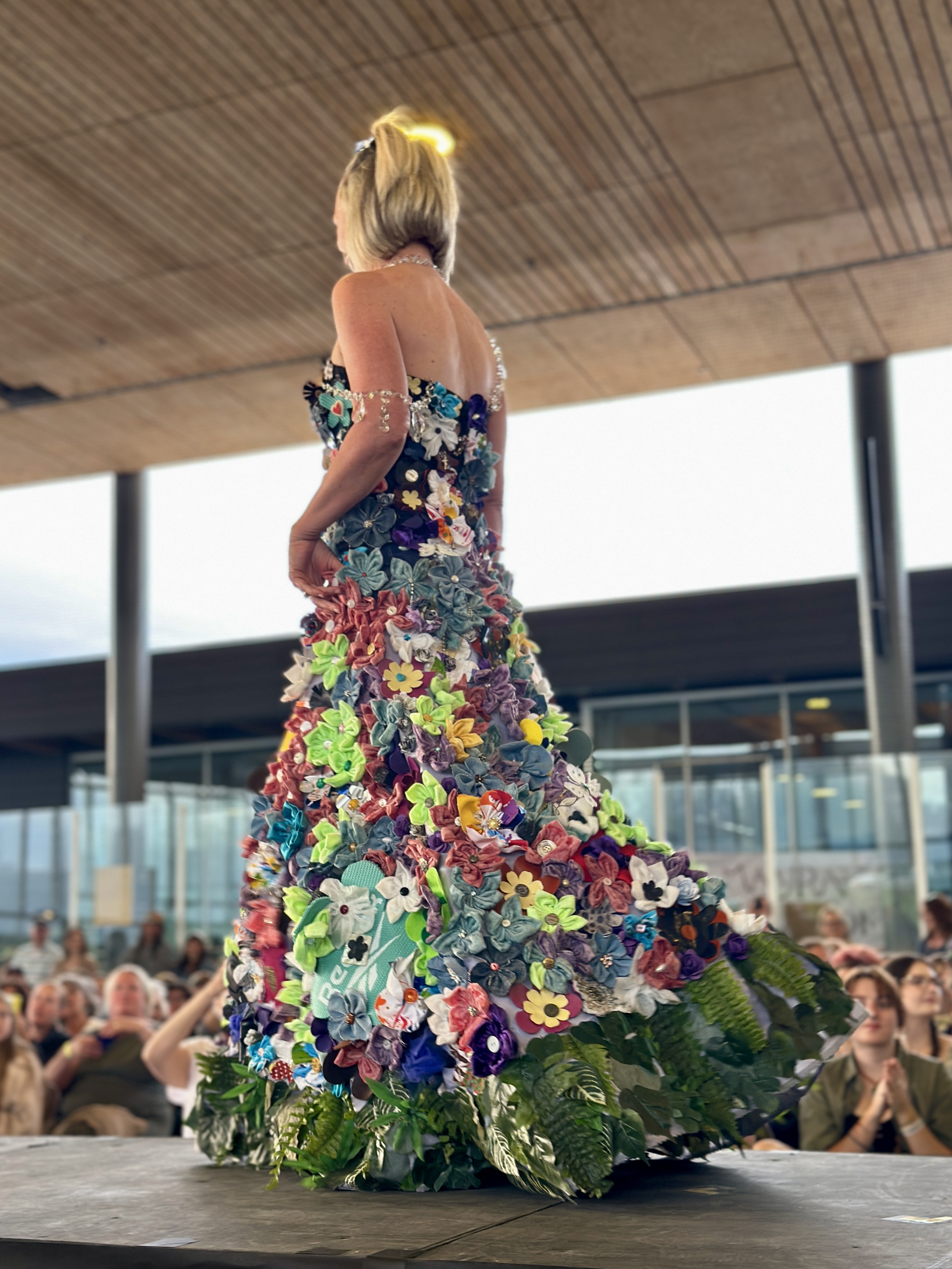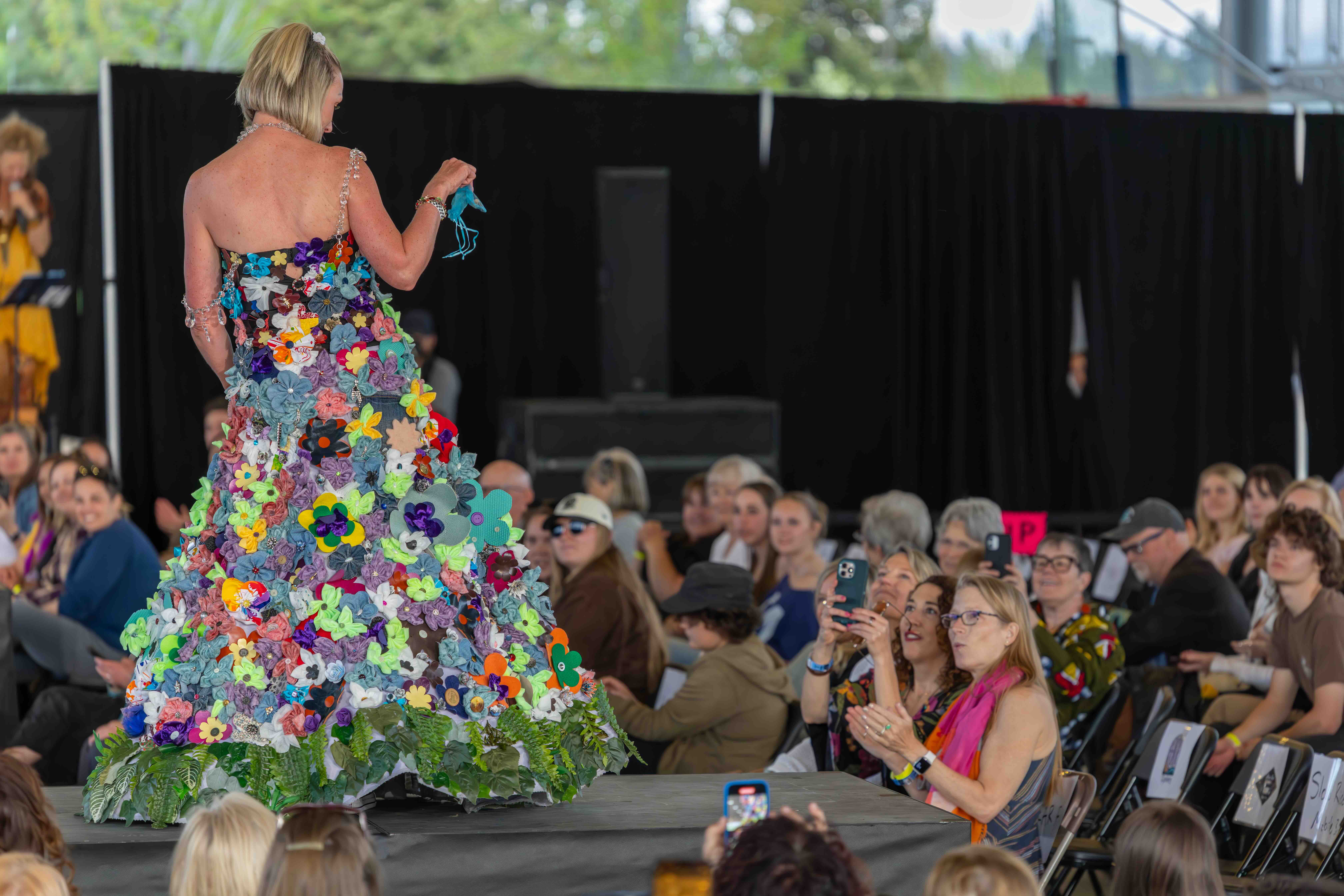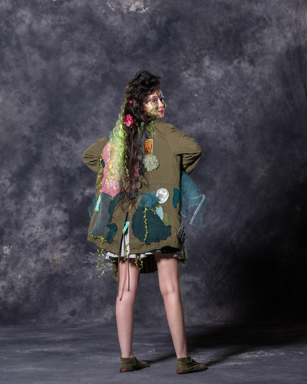 “LUNA MOTHS AND MOSS TAKING OVER MY MIND” Designer/Model: Noelani Anderson Materials: Plastic: juice cartons, caps, packaging from shipping, bubble wrap, broken jewelry, flowers. Old: stained skirt, pants, dress, stained t-shirt, cut up flannel shirt, sweaters previously cut up stained jacket. Scrap: tulle from an old kids dress, fabric from Halloween costume, stained jacket, Pendleton dyed wool, embroidery thread, vintage patches. Garment Description: This year’s outfit is inspired by lunar moths, moss, lichen, and fungi. Textile and packaging waste are some of the biggest contributors to landfill waste, which can make its way into our waterways. So I aimed to make something that repurposed plastic packaging and old textiles. I wanted to create something inspired by how humans and nature can coexist and grow together, which is symbolized by the moss and plant life taking over the garment.