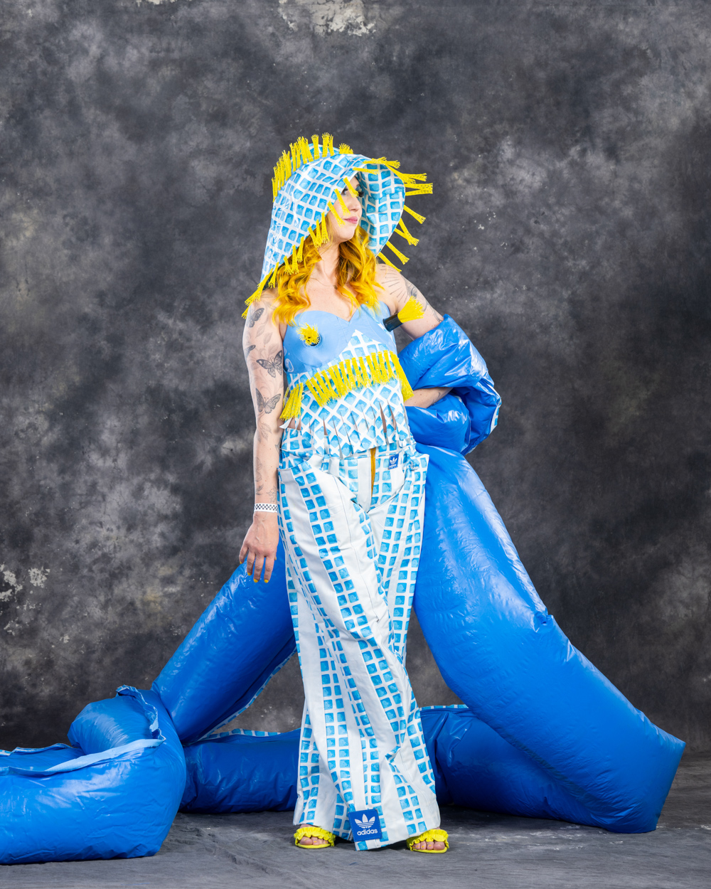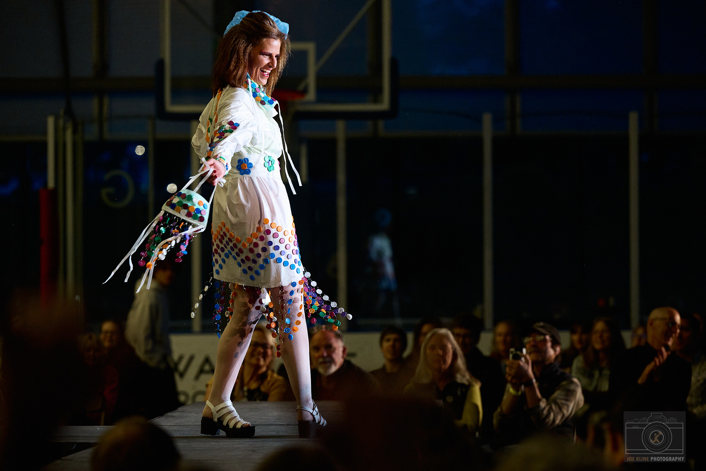 “KITCHEN SINK” Designer: Madie Loebig Model: Lydia Harms Materials: Sleeping pad, produce mesh, produce bags clear, mailers, second hand tule, bottle caps, broken string lights, twist ties Garment Description: My inspiration for this piece was the waste I personally acquire through my life. I collected bits and pieces of trash that I created with no true theme, ultimately landing on the name kitchen sink, made of odds and ends like my favorite cookie. My piece is connected to Rubbish Renewed’s mission because it shows you don’t need an elaborate plan or collection of trash to create something magical, from 100% garbage! I hope to inspire others to redefine what is seen as trash & maybe instead see the base for a new creative project. – Auction Item!