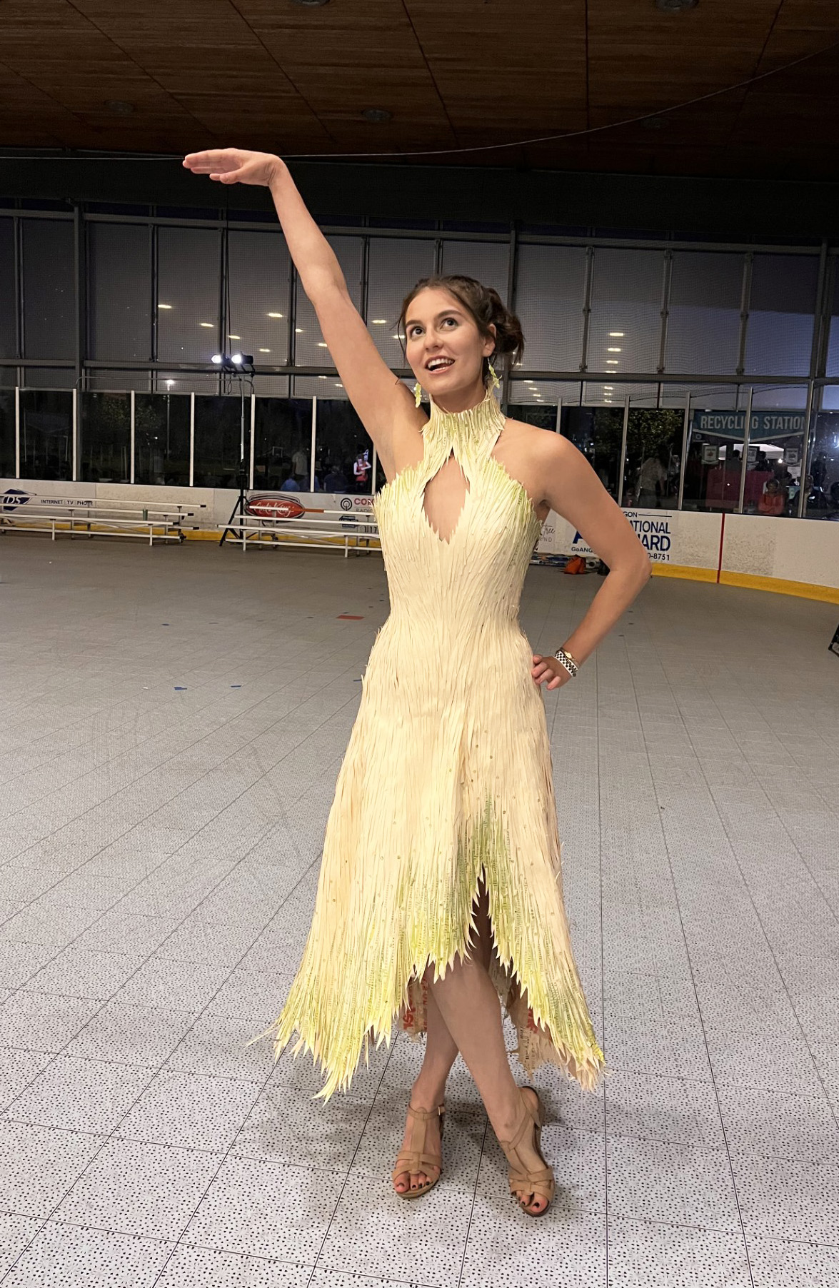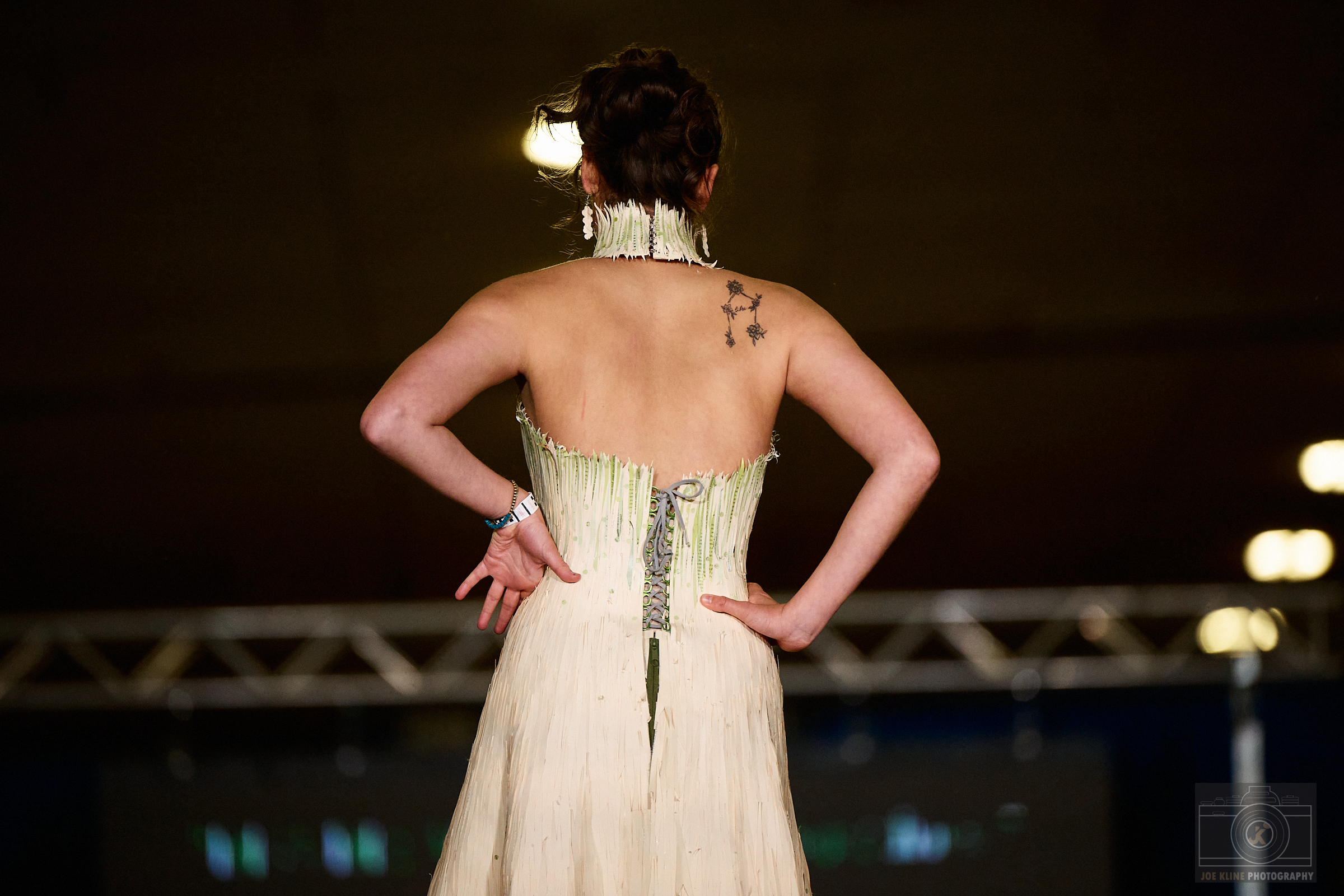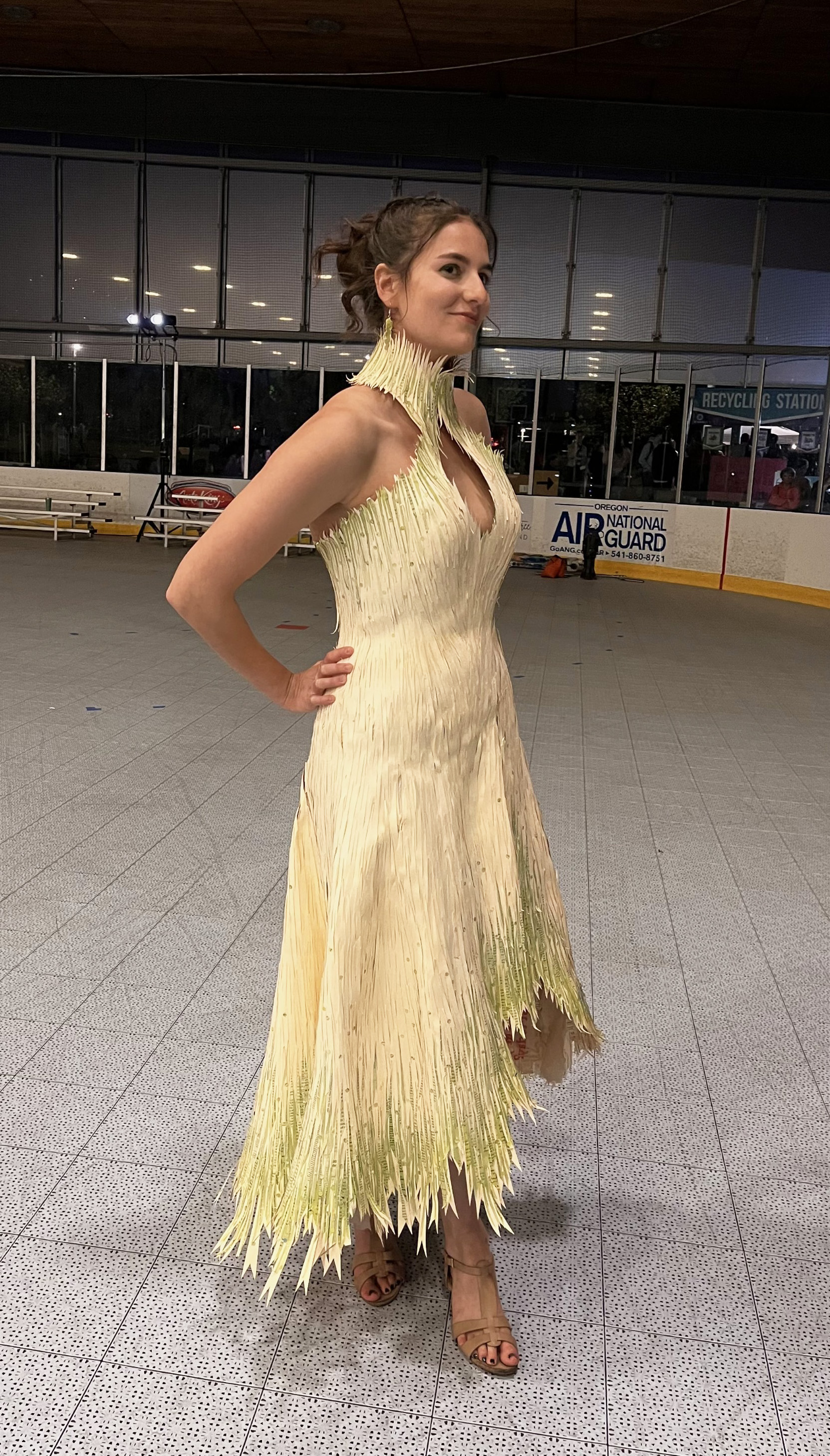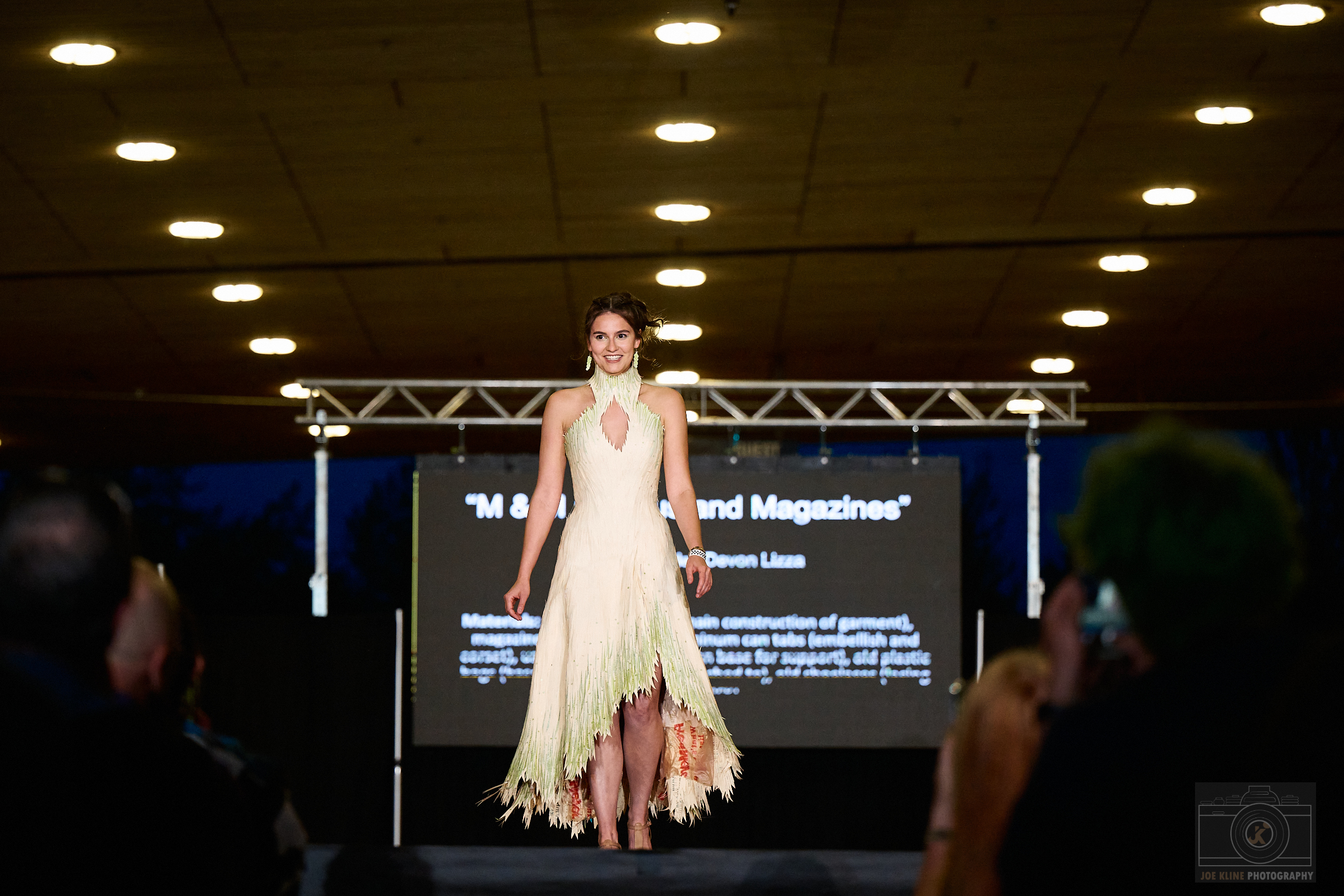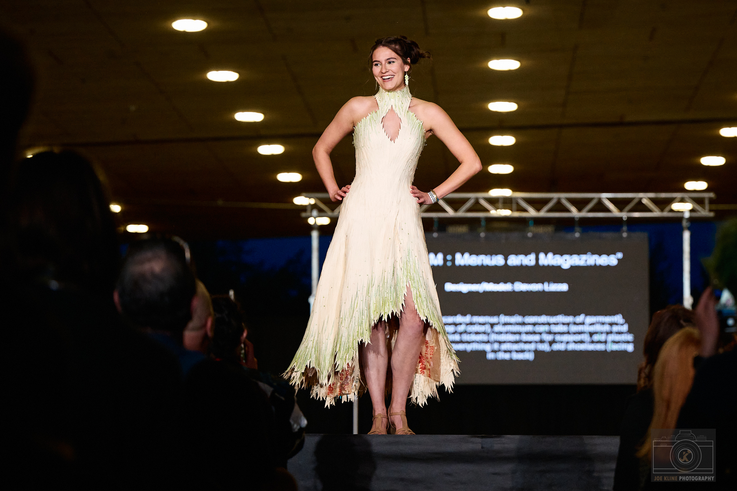 “M & M : MENUS AND MAGAZINES” Designer/Model: Devon Lizza Materials: Discarded menus (main construction of garment), magazines (pop of color), aluminum can tabs (embellish and corset), used drink tickets (hidden base for support), old plastic bags (base that everything it attached to), old shoelaces (lacing in the back). Garment Description: Inspired by the sheer variety of texture, color, thickness, and types of paper products present in magazines and restaurant menus, this garment allows for viewers to take into account how much paper waste is prevalent in food and publishing industries. The manipulation of materials is intended to make it indiscernible for viewers to pinpoint what the dress is made from. Menus were collected, cut into slivers capitalizing on the warm buttery background color rather than the words, and then applied to the plastic bag/drink ticket base to create a ‘tree bark’ effect providing visual interest and texture. The pops of color in the dress come from magazines which were sorted and organized by color, meticulously hole punched, and then applied to the dress with tweezers. As an individual incredibly passionate about sustainability, creativity, and design, this garment showcases how we can give paper products a new life and take an everyday object and make it into something extraordinary.