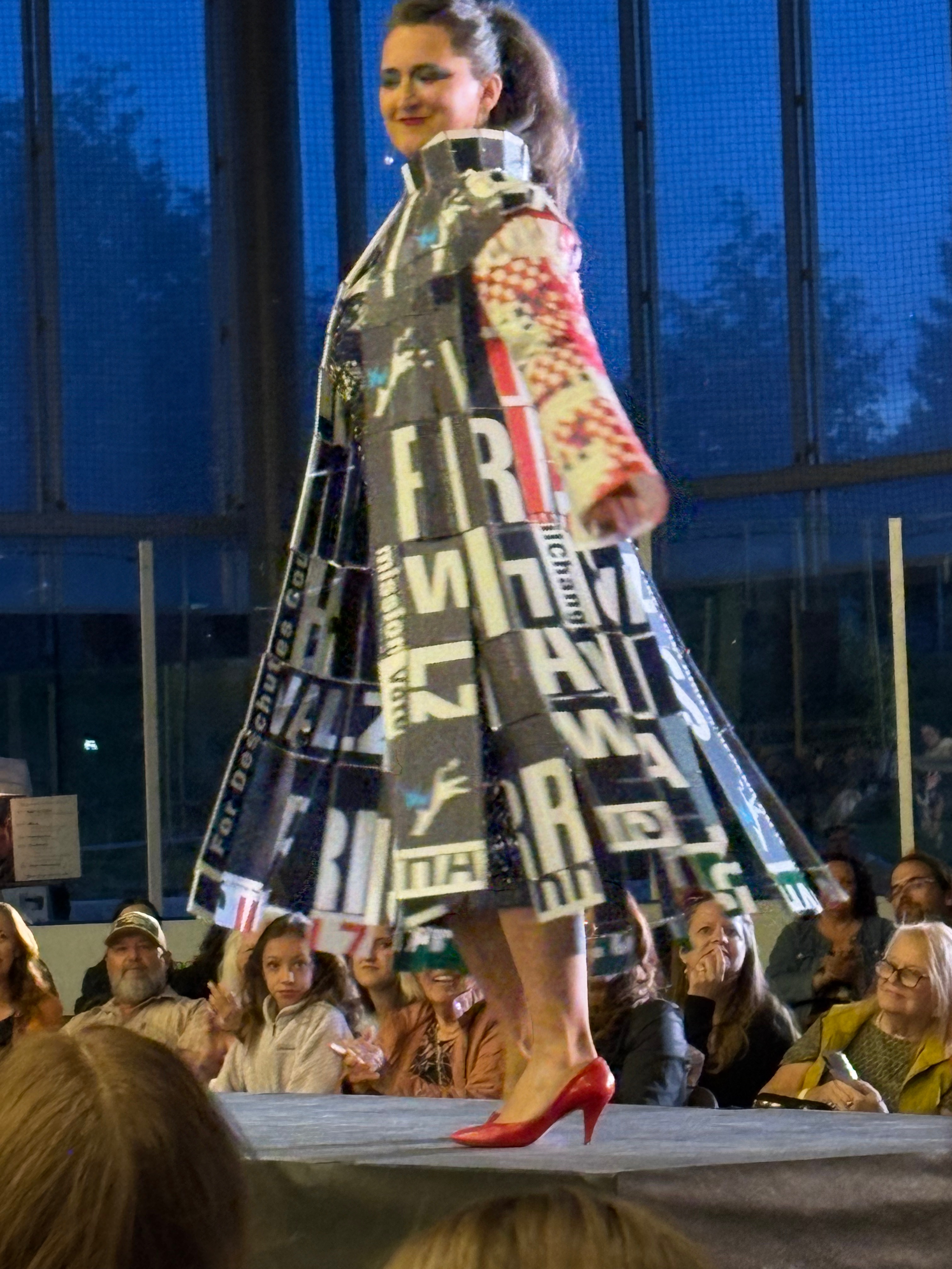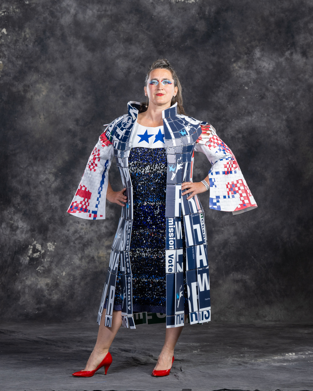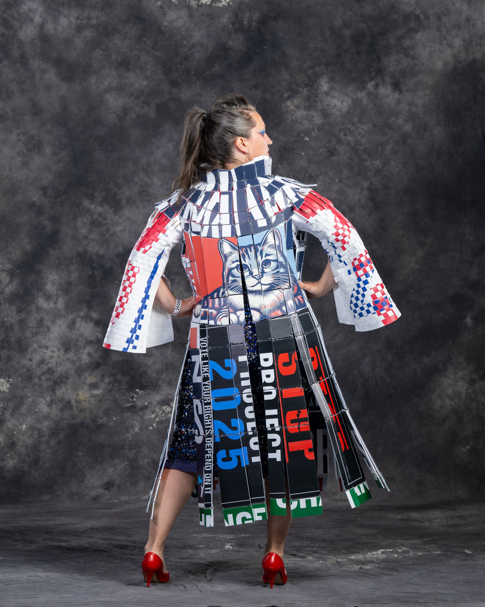 “SIGNS OF THE TIMES” Designer: Karen Holm Model: Claire Brislin Materials: Presidential campaign yard signs: 2008 Obama signs, 2024 Harris signs and banner, jewelry jump rings. Garment Description: Woven from the fabric of a time when “Yes We Can” electrified the nation, this look proves that hope isn’t disposable, it’s renewable. The base dress made of reclaimed Obama signs and originally designed for THE classiest first lady we’ve ever had, this piece walks the line between memory and momentum. Reminding us that progress is never out of style. In an era where fascist vibes are being peddled like fast fashion, the jacket claws back with unapologetic ferocity and says, “no thanks, we’ve seen better threads.” This piece is not wistful nostalgia, it’s resistance in repurposed form.
