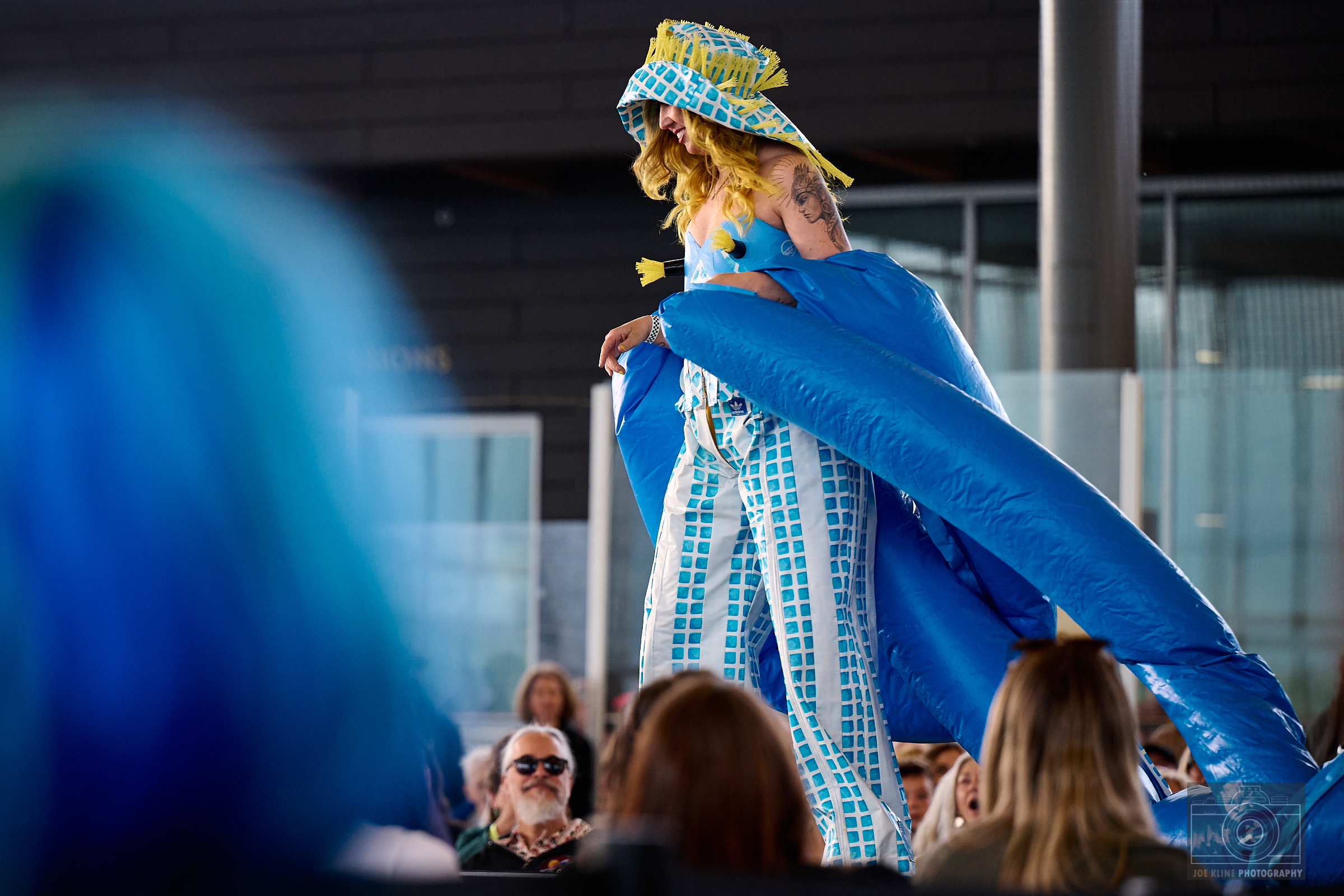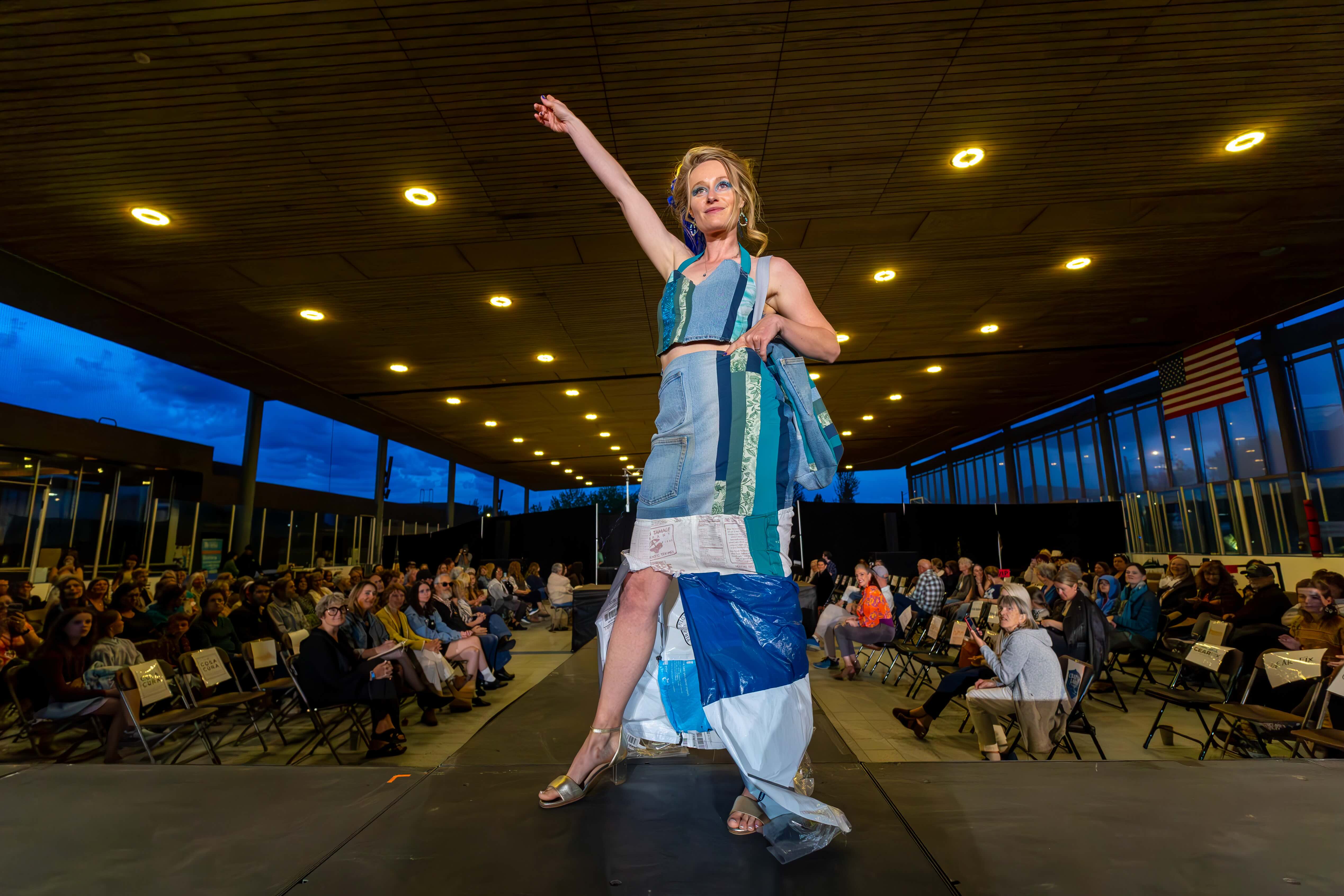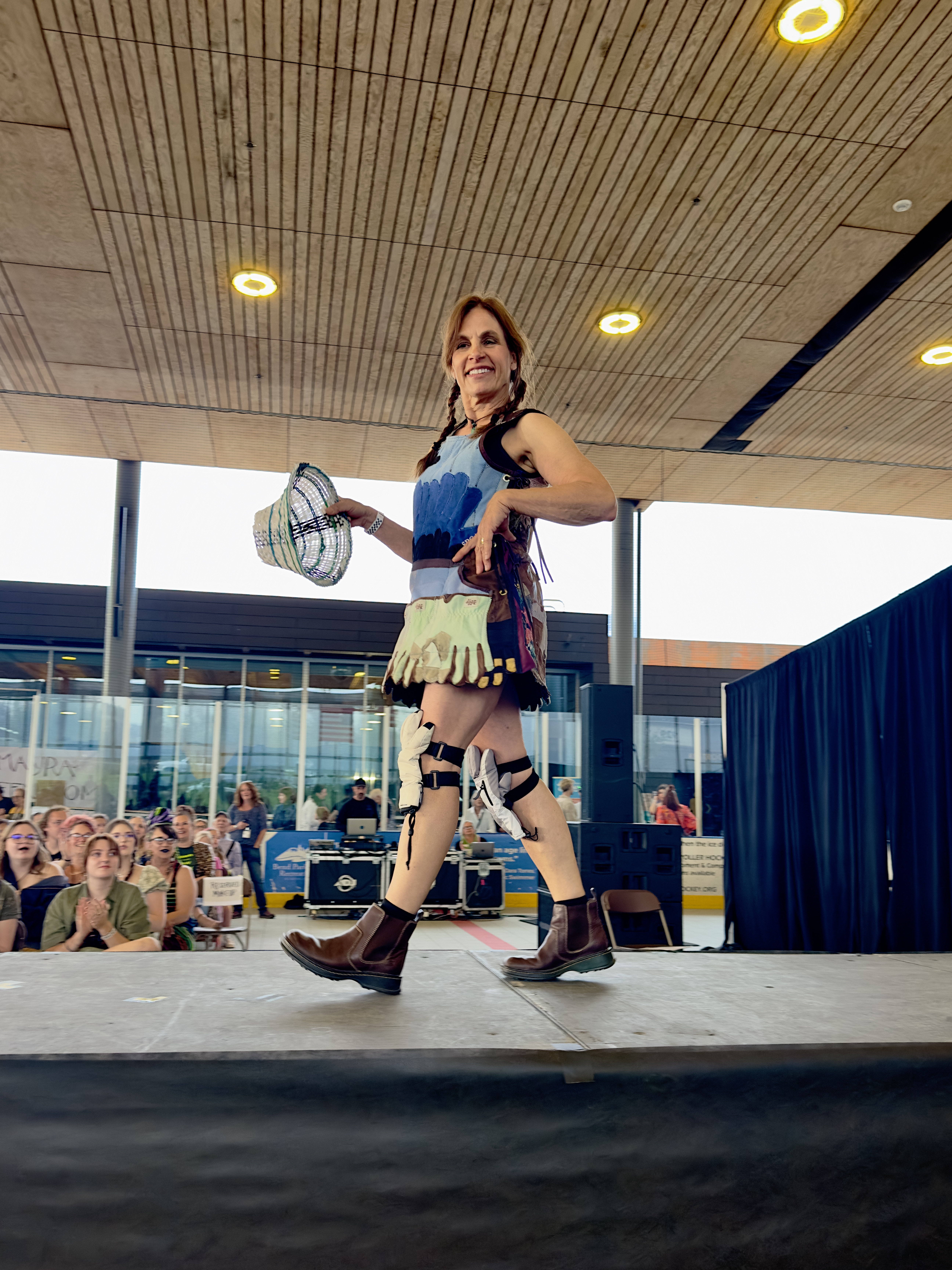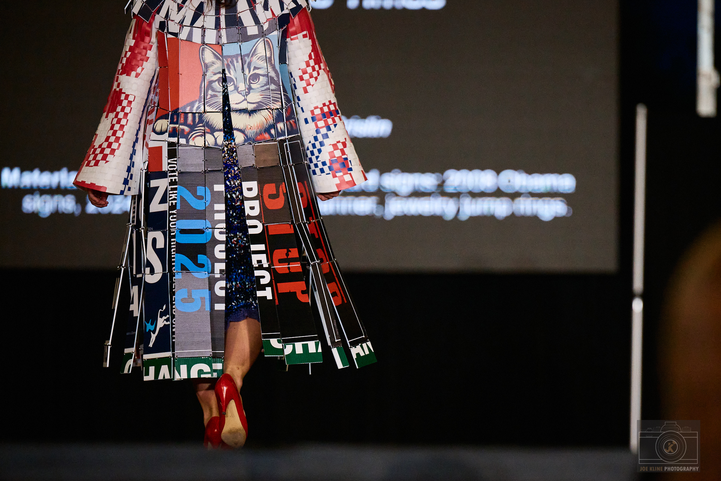 “SIGNS OF THE TIMES” Designer: Karen Holm Model: Claire Brislin Materials: Presidential campaign yard signs: 2008 Obama signs, 2024 Harris signs and banner, jewelry jump rings. Garment Description: Woven from the fabric of a time when “Yes We Can” electrified the nation, this look proves that hope isn’t disposable, it’s renewable. The base dress made of reclaimed Obama signs and originally designed for THE classiest first lady we’ve ever had, this piece walks the line between memory and momentum. Reminding us that progress is never out of style. In an era where fascist vibes are being peddled like fast fashion, the jacket claws back with unapologetic ferocity and says, “no thanks, we’ve seen better threads.” This piece is not wistful nostalgia, it’s resistance in repurposed form.