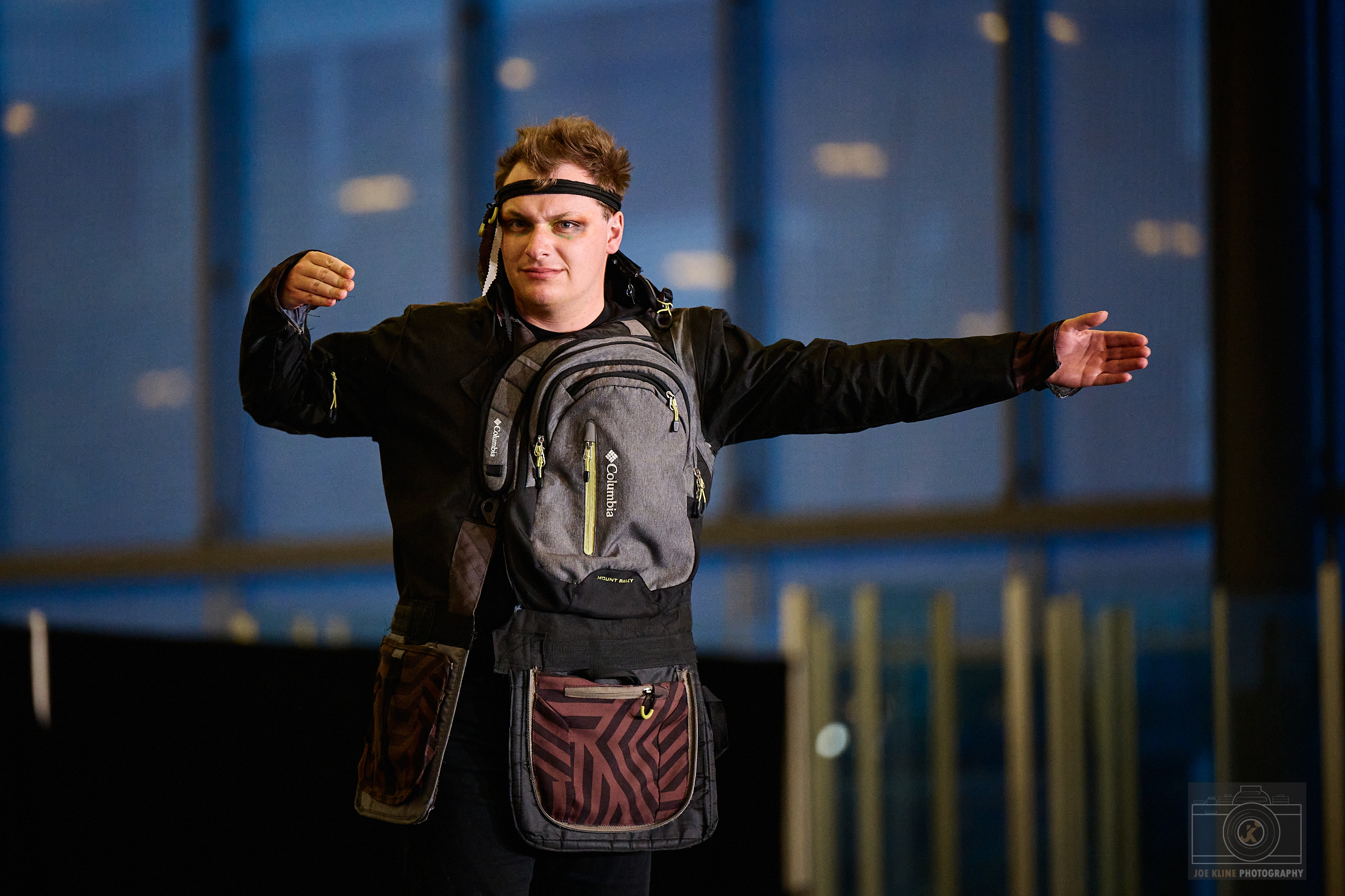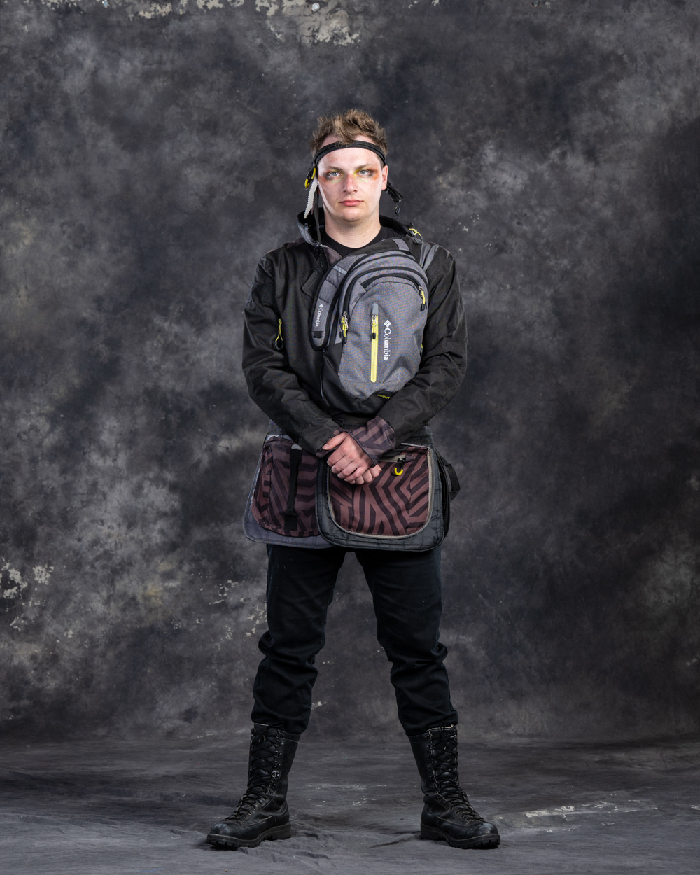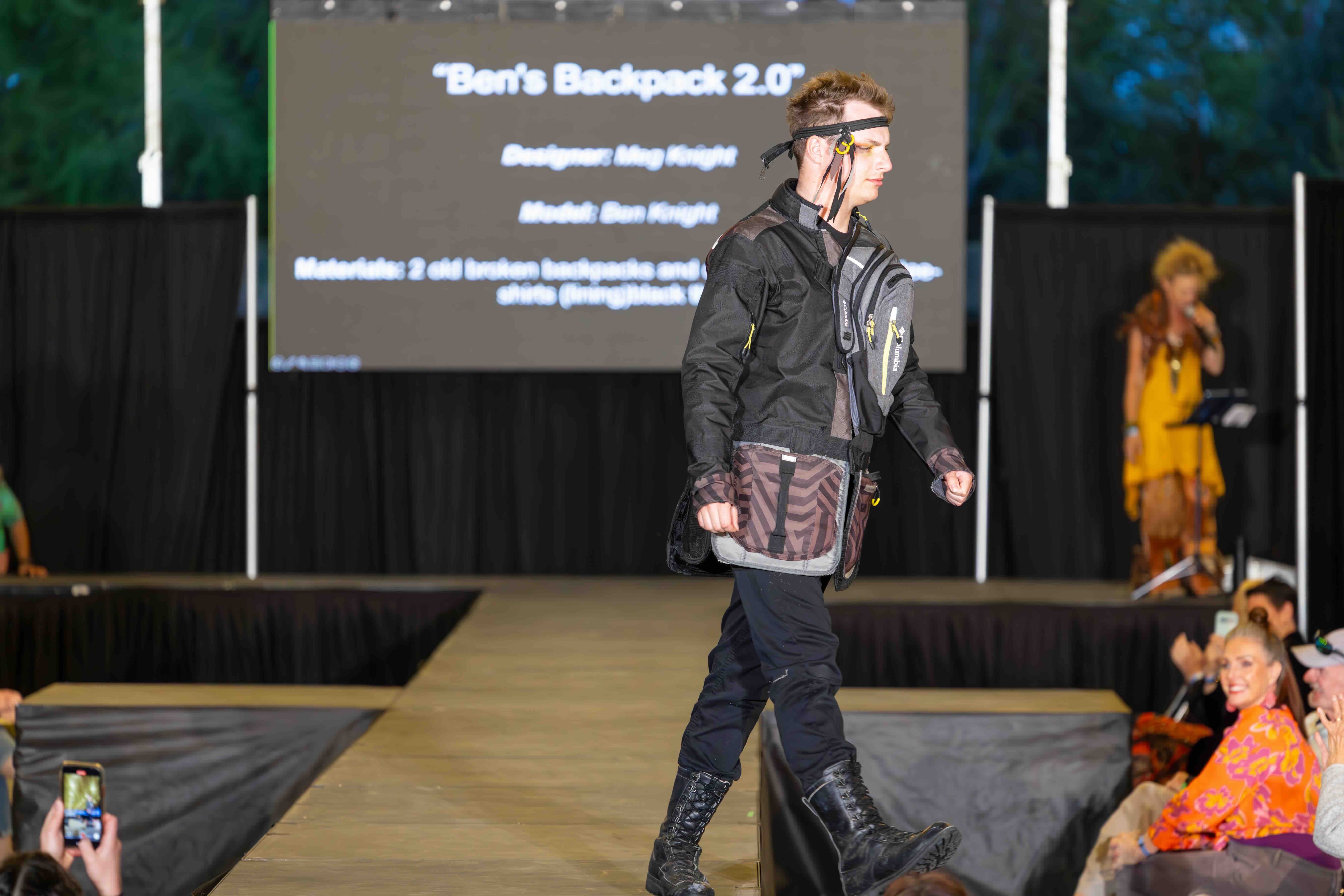 “BEN’S BACKPACK 2.0” Designer: Meg Knight Model: Ben Knight Materials: 2 old broken backpacks and one duffle bag, old tee-shirts (lining) black thread. Garment Description: Back in the day, these old school back packs and duffle bag journeyed with Ben on travel study at Realms. They’d lived a life and were destined for the trash bin. But now, they’ve been refashioned and can see Ben on to his next journey in life as a traveler’s jacket complete with plenty of pockets and storage. He is on his way in Ben’s Backpack 2.0!