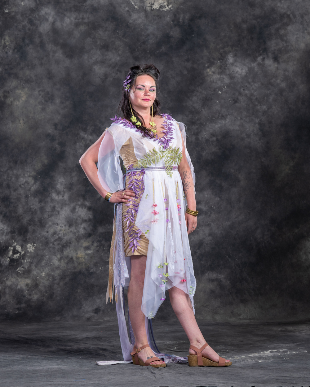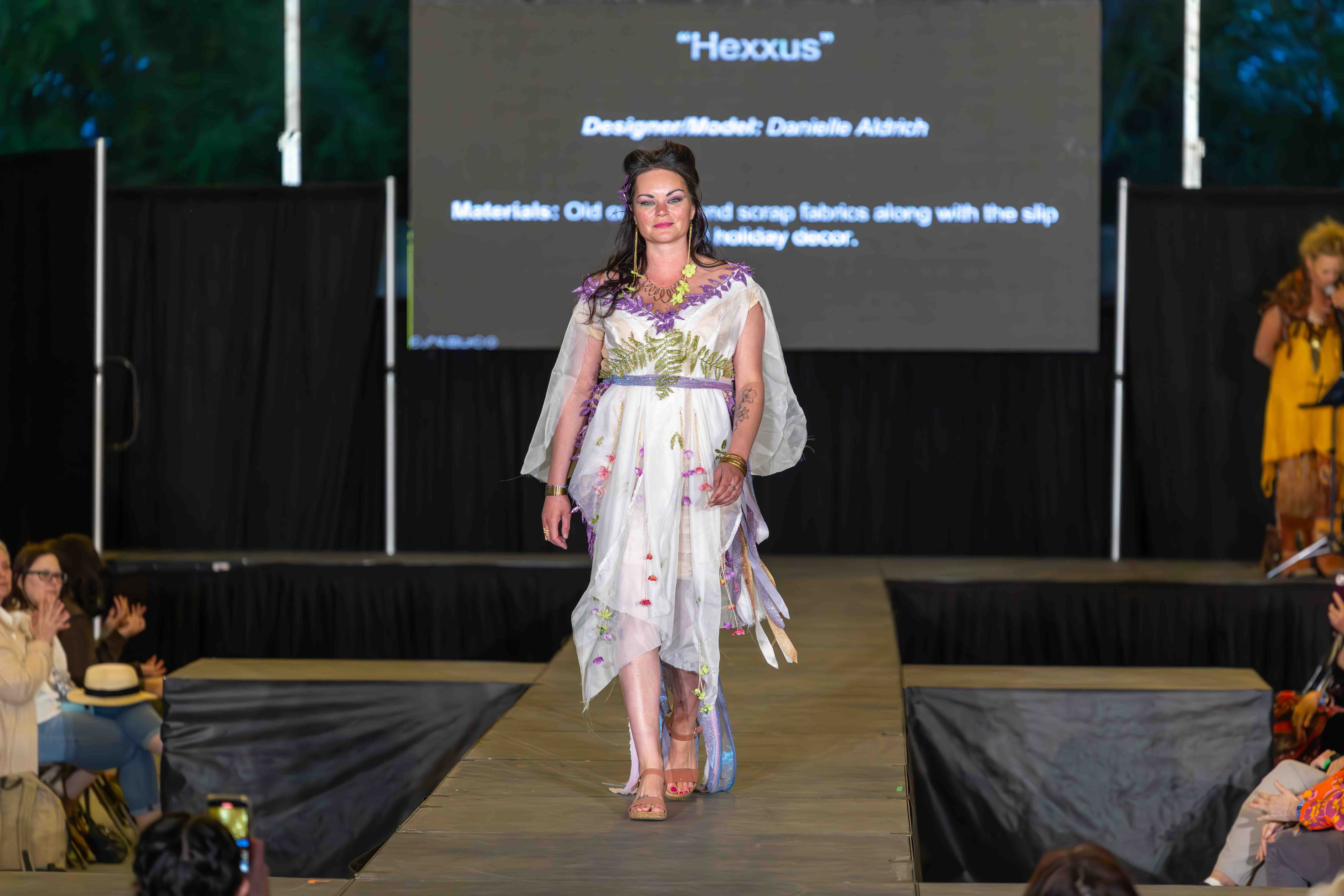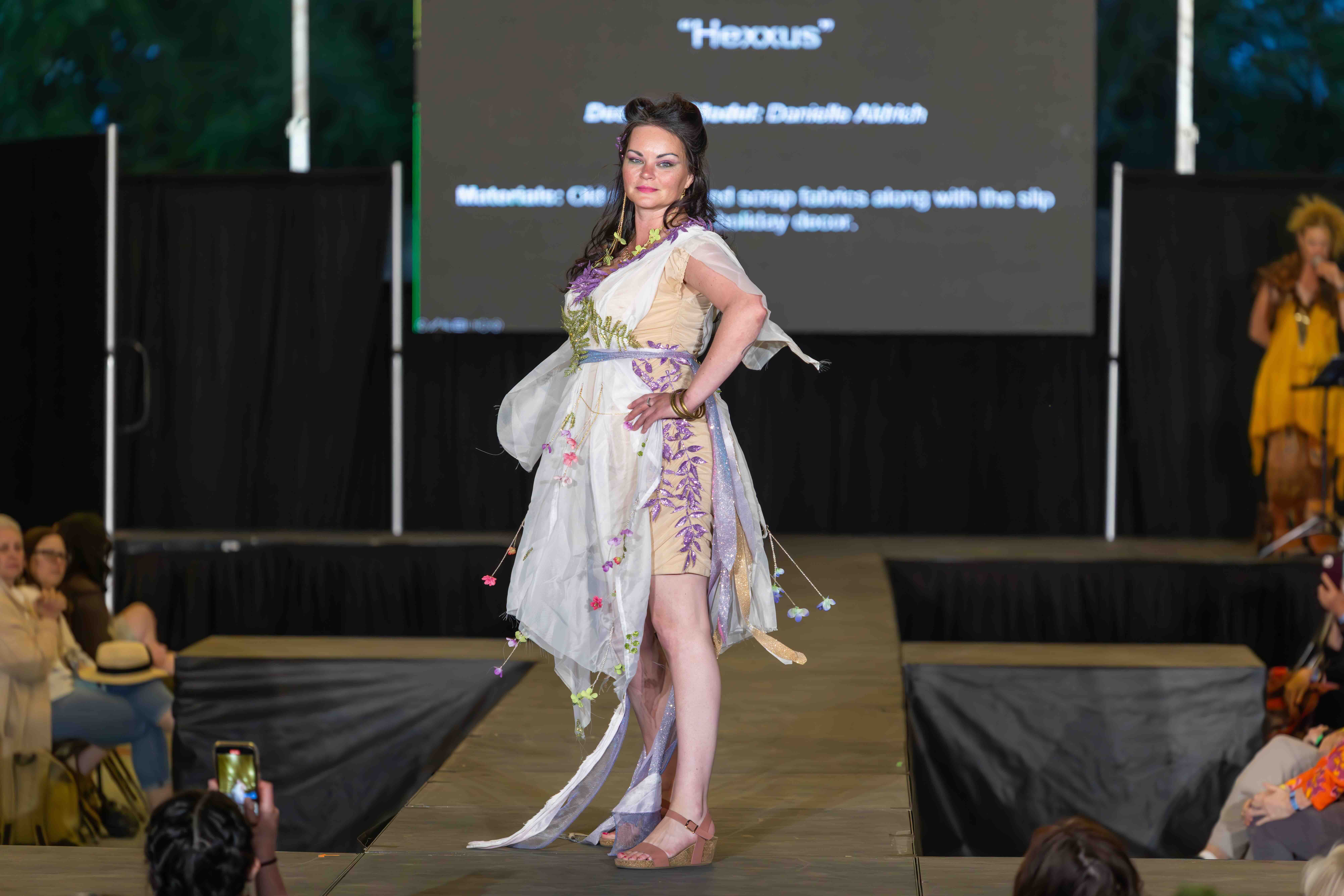 “HEXXUS” Designer/Model: Danielle Aldrich Materials: Old curtains and scrap fabrics along with the slip and holiday decor. Garment Description: This dress was inspired by Mother Nature. There’s nothing sexier than our plants and forests. This garden garment was constructed of old Holiday decor, broken jewelry, and an old dress.