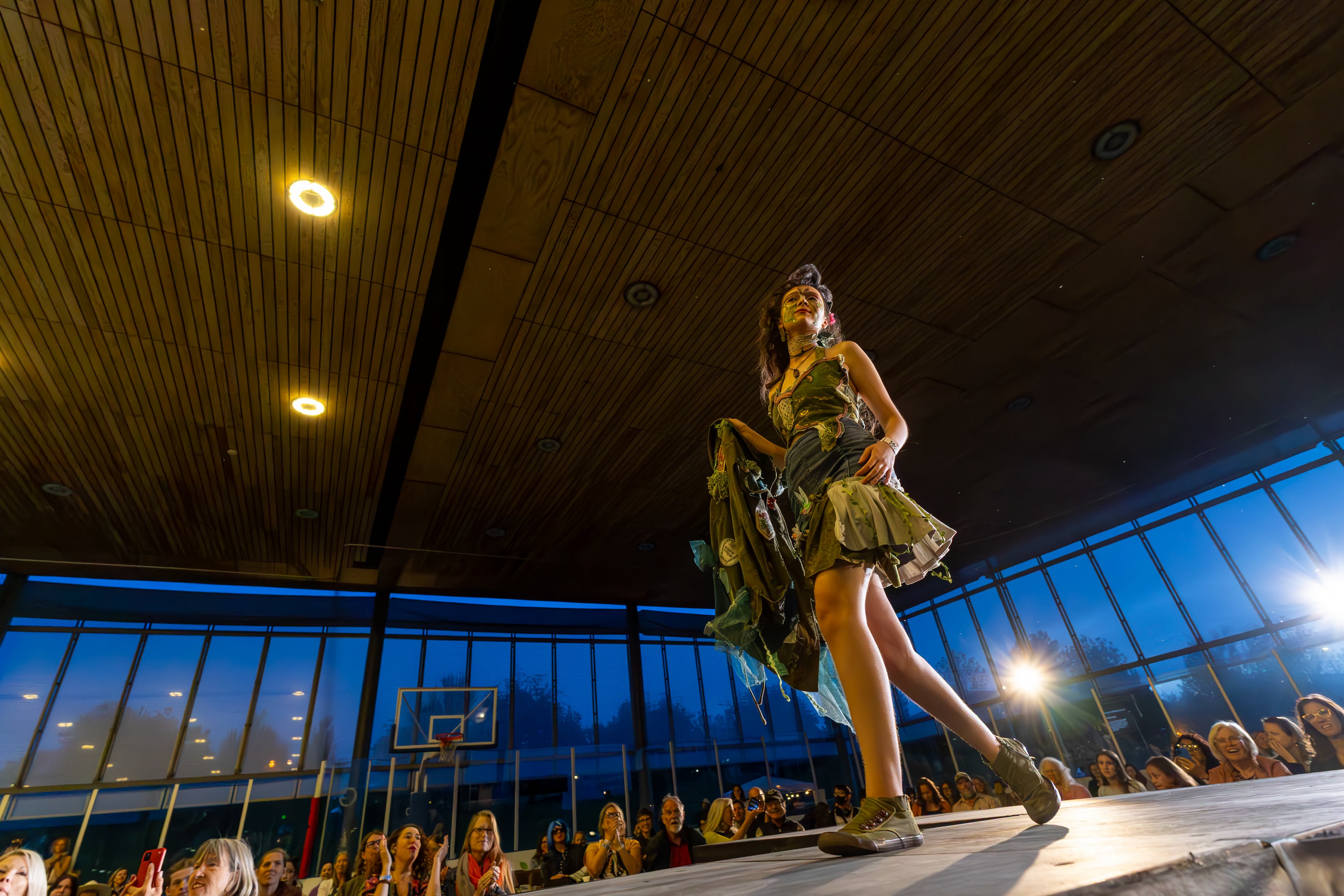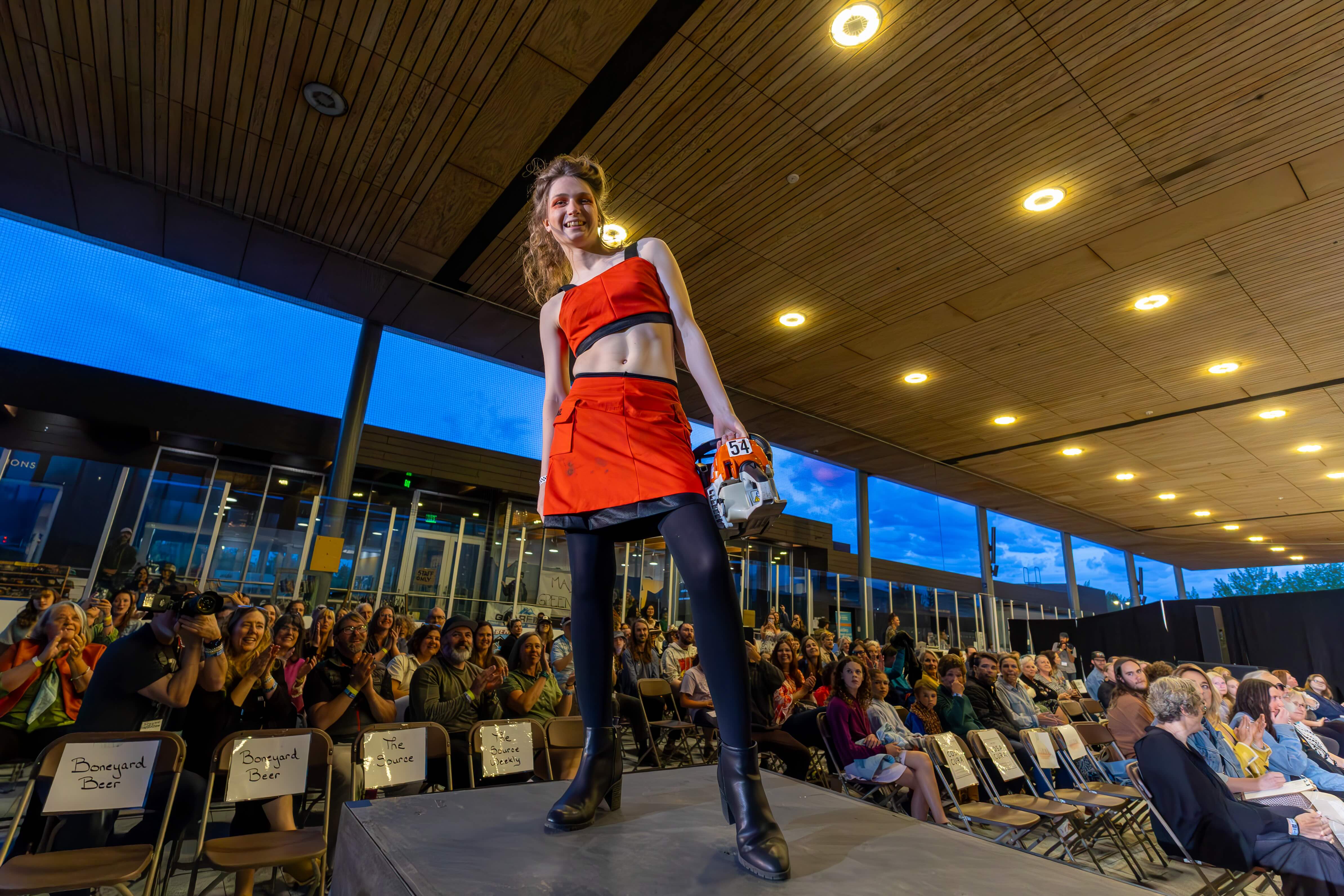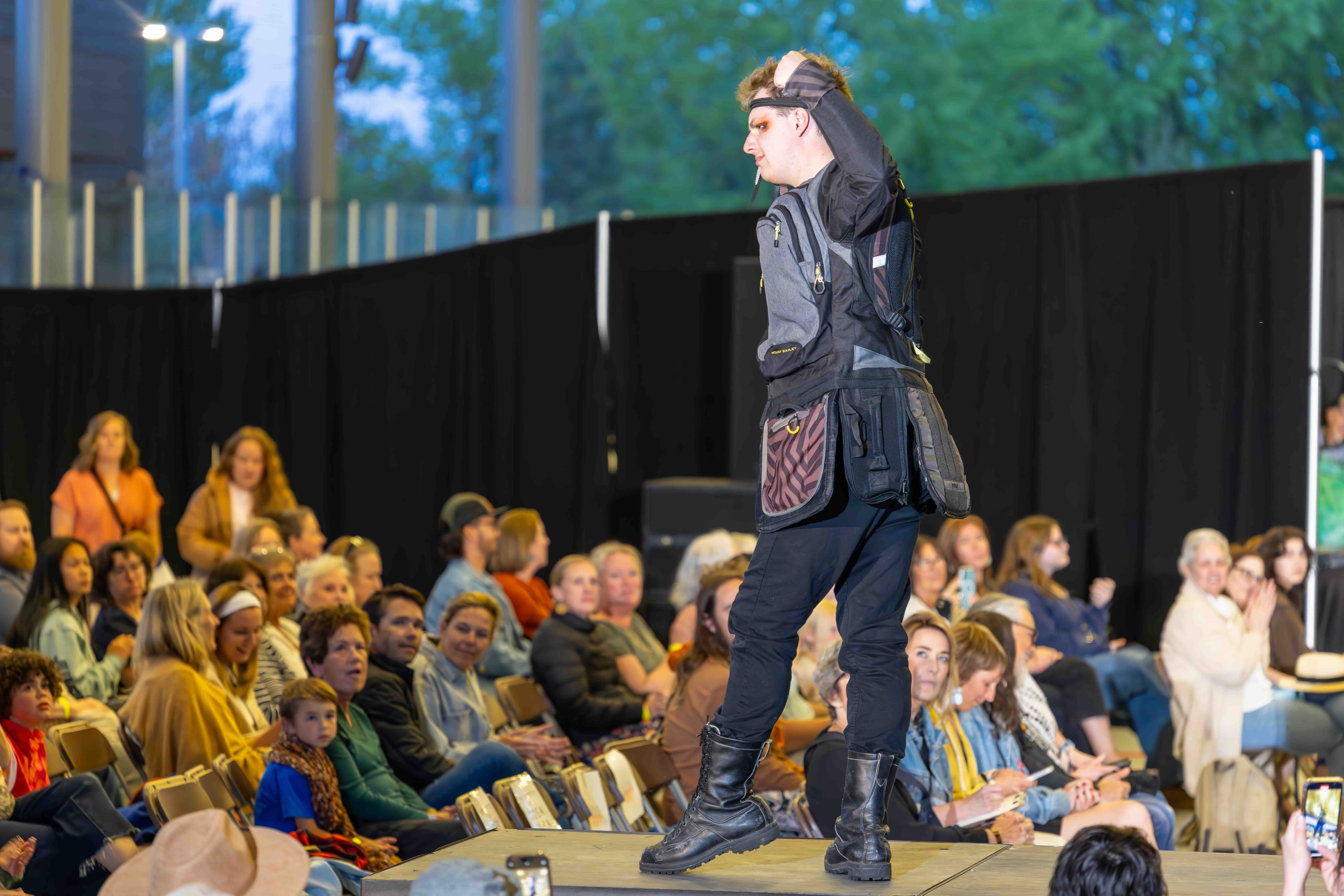 “STIHL IN FASHION” Designer/Model: Grace Robin Materials: Retired chainsaw chaps. Garment Description: Working in conservation is all about being a caretaker of the natural world, making the disposal of damaged chainsaw chaps stand out to me as a waste. Due to safety concerns, chaps must be retired once sufficiently damaged, and in many cases cannot be repaired. This led me to imagine a second, stylish life for these pairs of PPE. One with a different but just as important way of aiding our environment, inspiration.