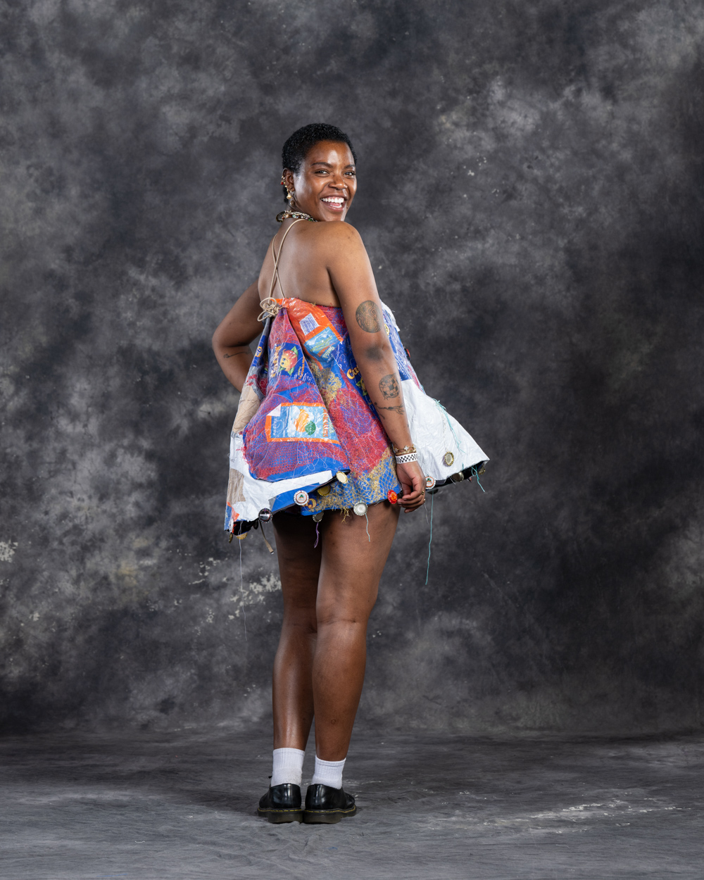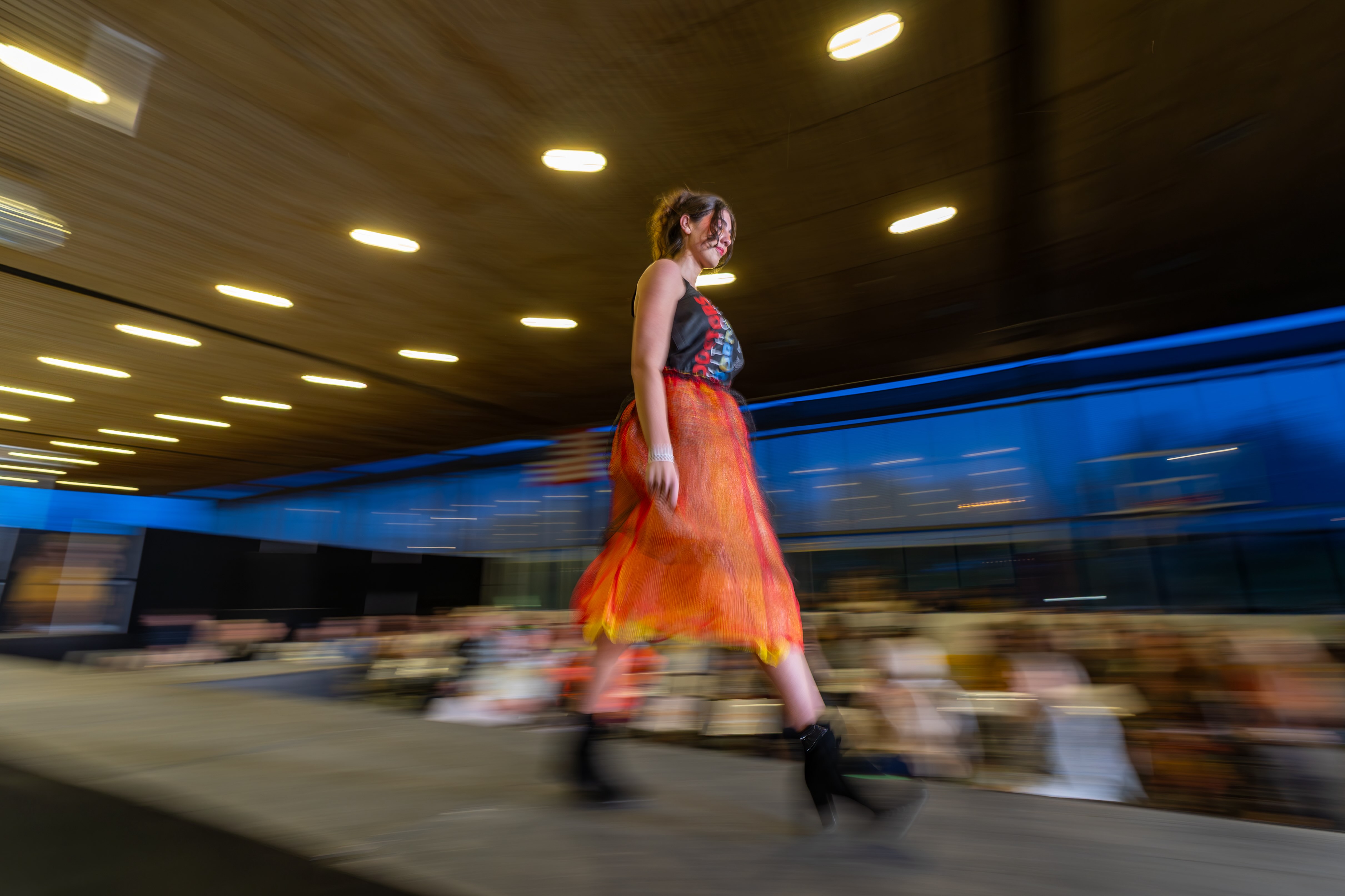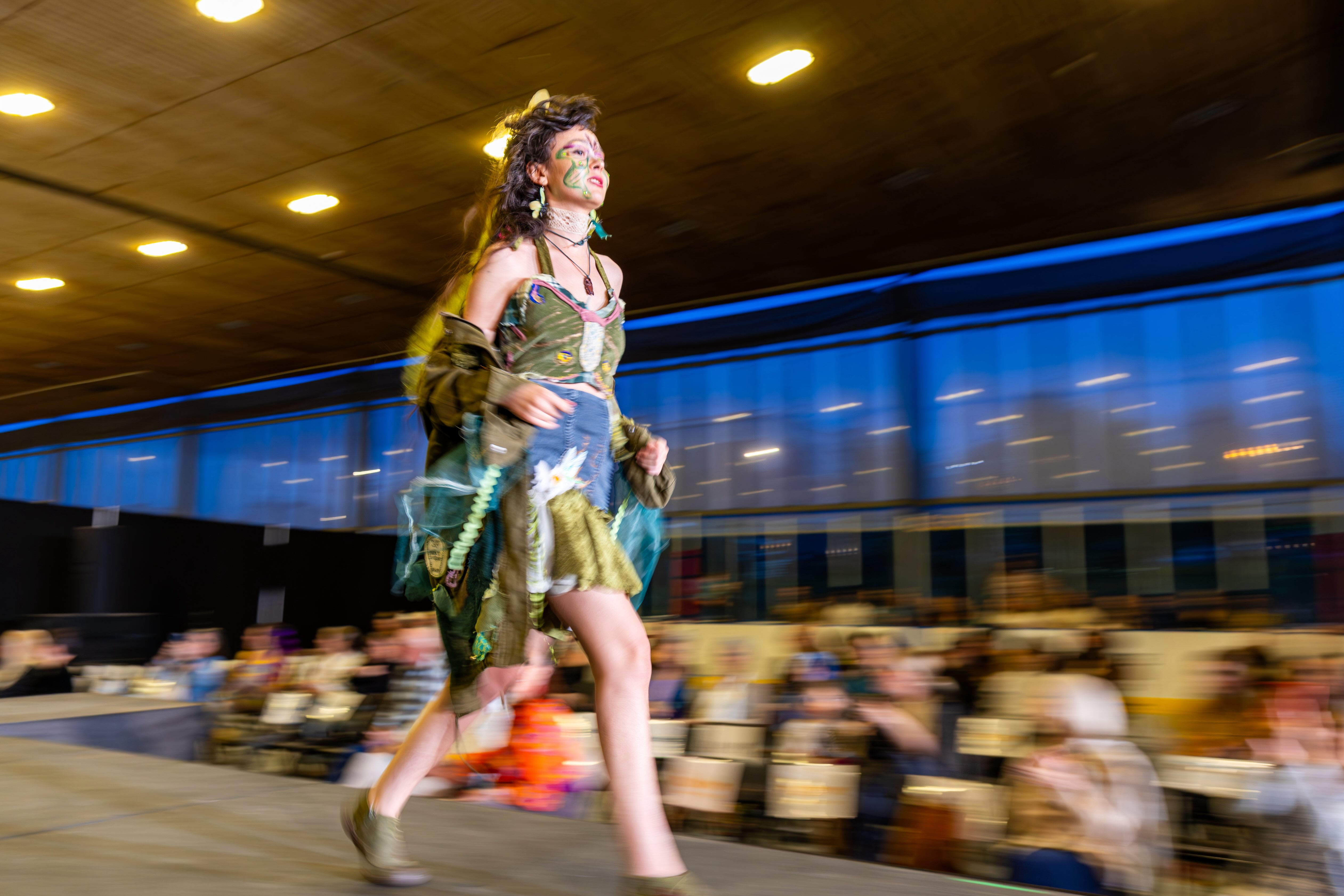 “STIHL IN FASHION” Designer/Model: Grace Robin Materials: Retired chainsaw chaps. Garment Description: Working in conservation is all about being a caretaker of the natural world, making the disposal of damaged chainsaw chaps stand out to me as a waste. Due to safety concerns, chaps must be retired once sufficiently damaged, and in many cases cannot be repaired. This led me to imagine a second, stylish life for these pairs of PPE. One with a different but just as important way of aiding our environment, inspiration.