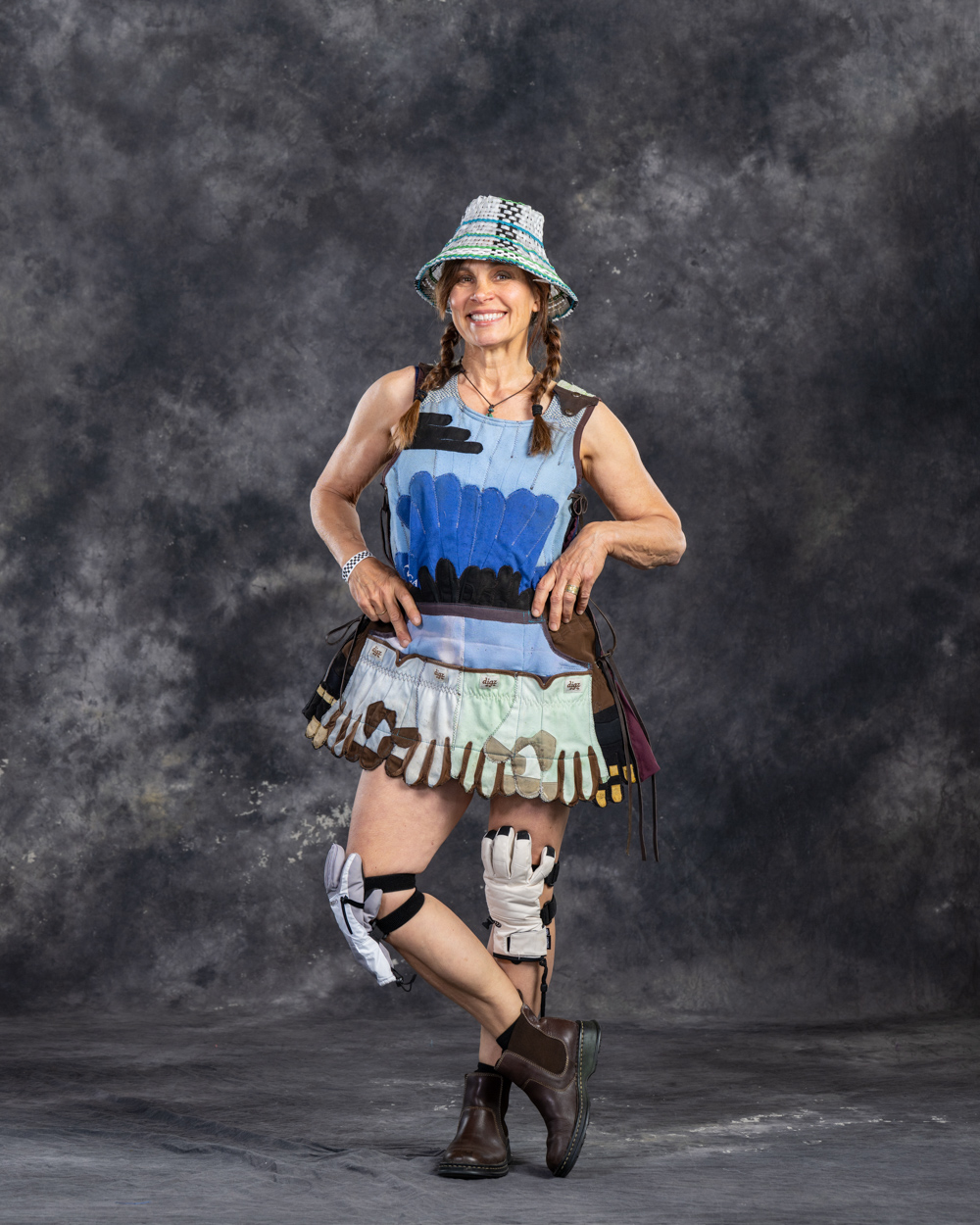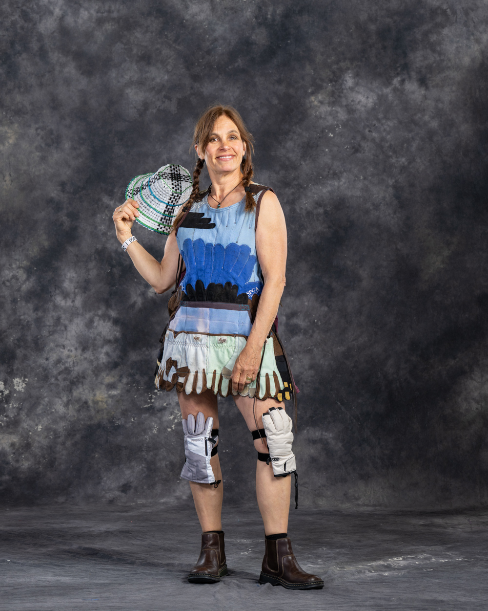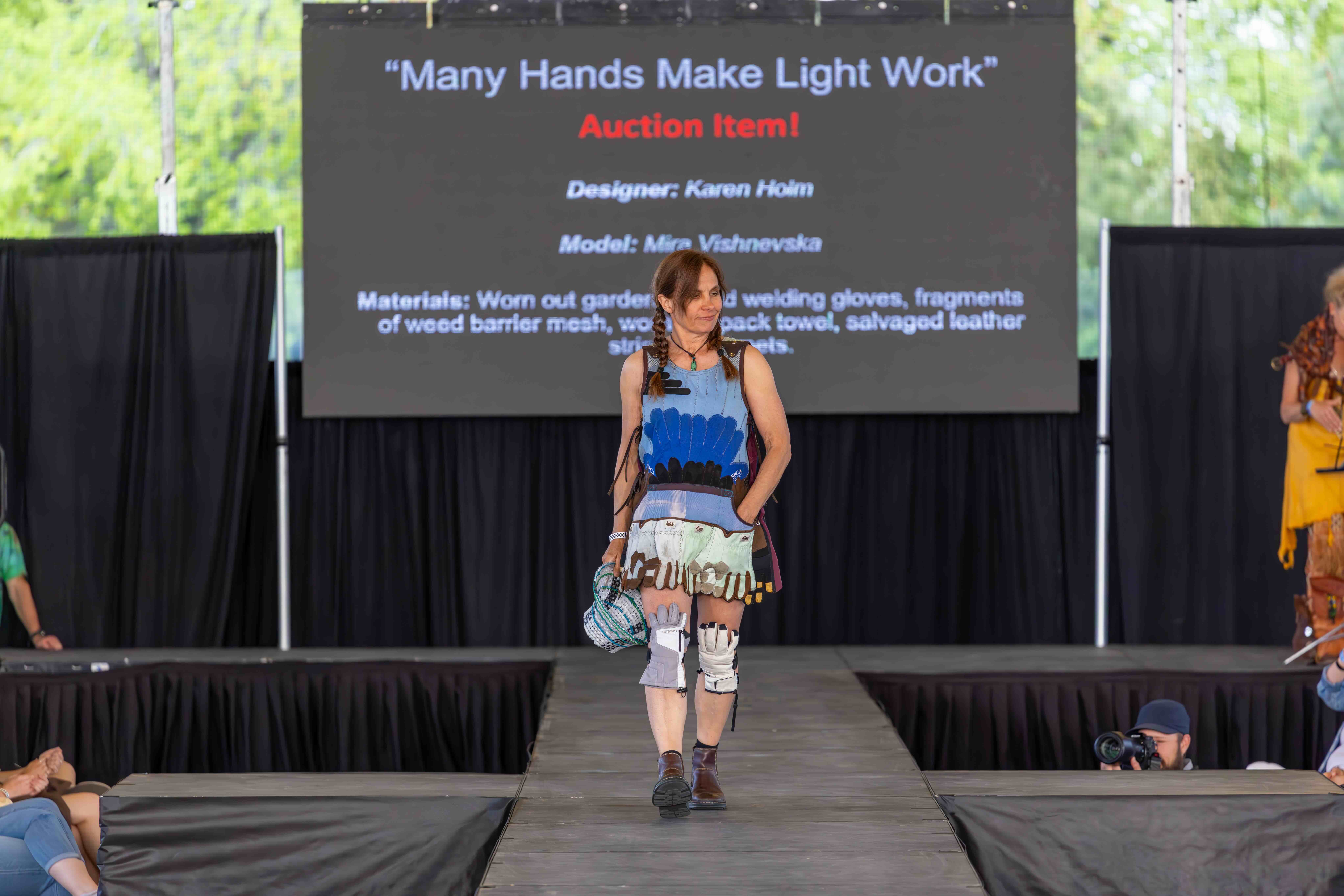“MANY HANDS MAKE LIGHT WORK” Designer: Karen Holm Model: Mira Vishnevska Materials: Worn out gardening and welding gloves, fragments of weed barrier mesh, worn out pack towel, salvaged leather strips, grommets. Garment Description: Fashioned in the spirit of “gardening builds community”, Many Hands Make Light Work, was built with the worn, work gloves of the designer’s family and friends. The array of tool pockets, ample hand pockets, adjustable side panels, and comfy knee pads, make this festive frock glide easily from digging in the dirt to the evening after party at the Plot. – Auction Item!