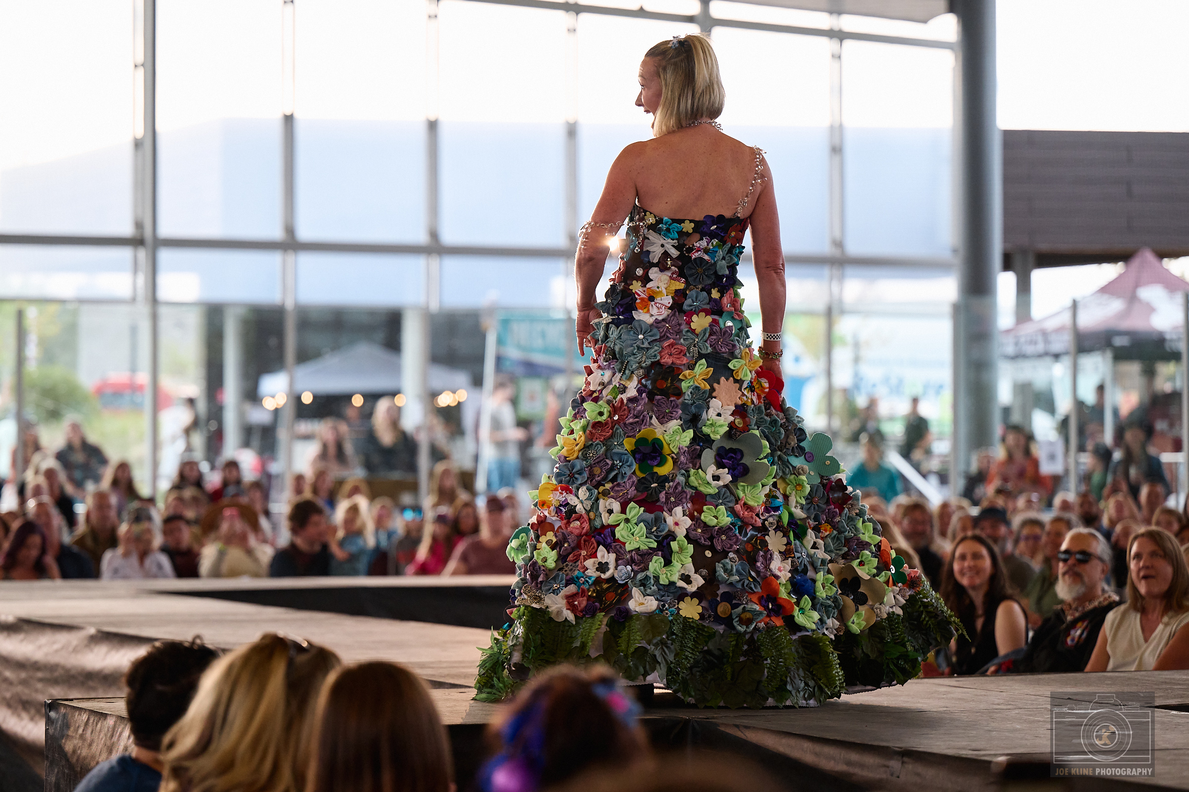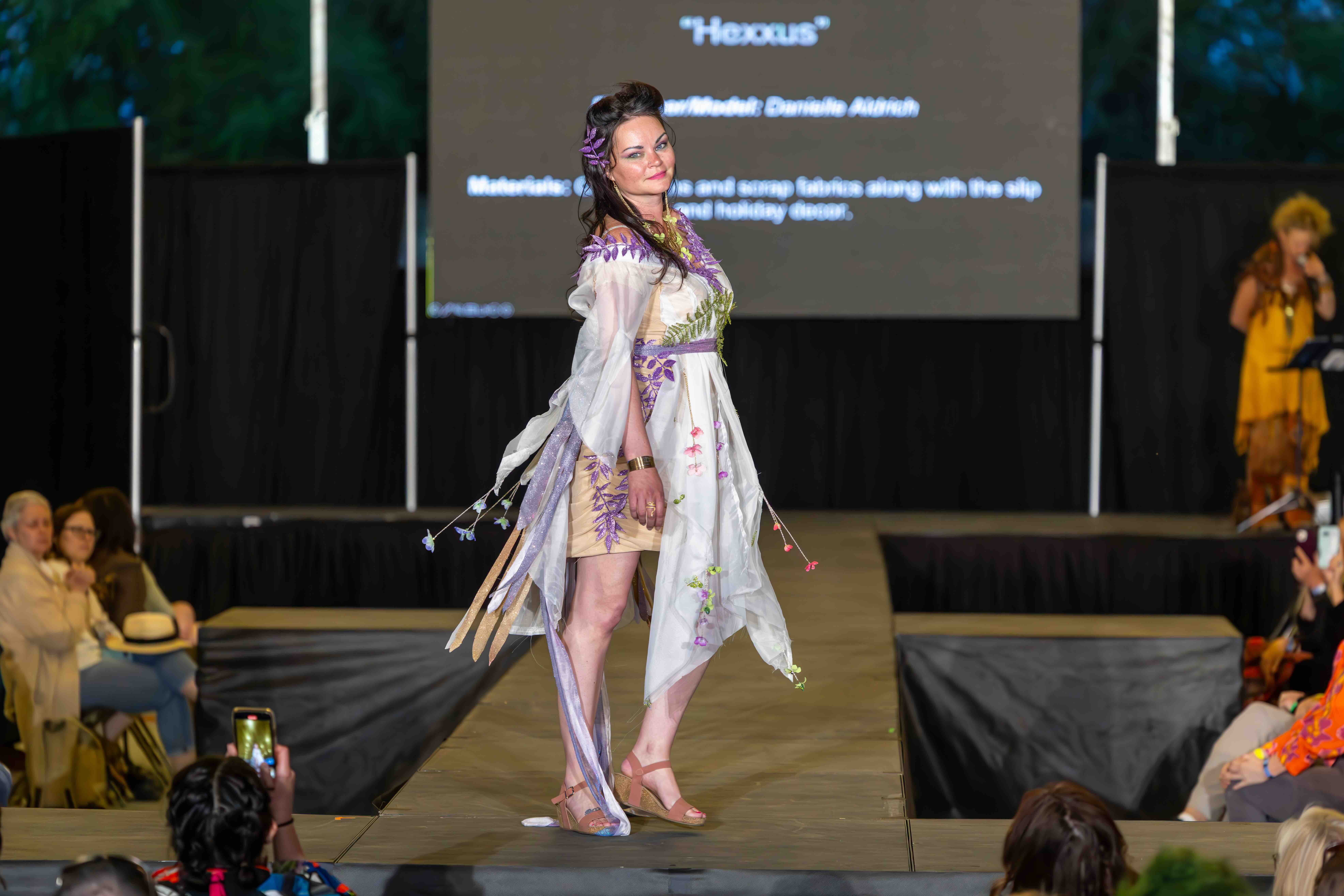 “GARDEN PARTY” Designer: DeeDee Johnson Model: Robin Cooper Engle Materials: washed and dyed fitness club wipes, tin cans, fabric and leather scraps, last year‘s calendars, magazines, junk mail, old yoga mat, broken chandelier parts, umbrella from the trash bin, buttons and beads. Garment Description: Robin, Robin quite extraordinary, how does your garden grow? With fabric scraps and leather flaps and flowers around the row. Reminiscent of her past designs, designer, DeeDee Johnson, has included flowers made from washed and dyed fitness club wipes, tin cans, fabric and leather scraps, last year‘s calendars, and an old yoga mat. The dress is completed using broken chandelier parts, buttons and beads. The sun umbrella was salvaged from the trash bin and contains twilled flowers from recycled, magazines, and junk mail. Auction Item!