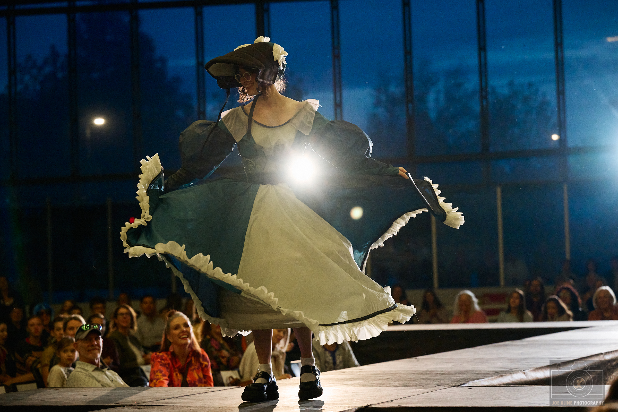 “RUBBISH ROMANTICISM” Designer: Martha Campbell Model: Rona Campbell Materials: discarded tents, external frame backpack, EZ up carrying case, and discarded running shoes. Garment Description: The romantic era of the early 1800’s emphasized the imaginative, the visionary, and the transcendental. Inspired by the decadence and drama of romantic era gowns, this rubbish garment imagines new life for materials otherwise destined for the landfill, allowing them to transcend their original purpose. By celebrating these materials through fashion, we envision a more sustainable future.